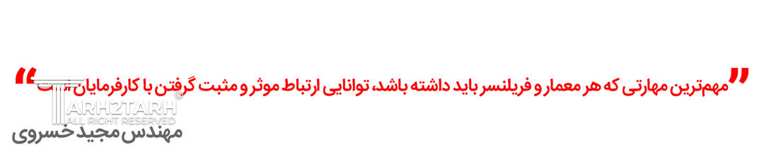 مهمترین مهارتی که هر معمار و فریلنسر باید داشته باشد، و معتقدم من هم این مهارت را دارم، توانایی ارتباط موثر و مثبت گرفتن با کارفرمایان است. نحوه ارتباطگیری، چهطور کارفرما را پیدا کنیم و ... مهمترین مسائل کاری ماست. بسیاری از دوستان و همکاران من در مهارتهای نرم افزاری و دانش معماری بسیار قوی هستند اما به دلیل ضعف در ارتباط با کارفرما نمیتوانند به جایگاهی که مستحق آن هستند، دست پیدا کنند.