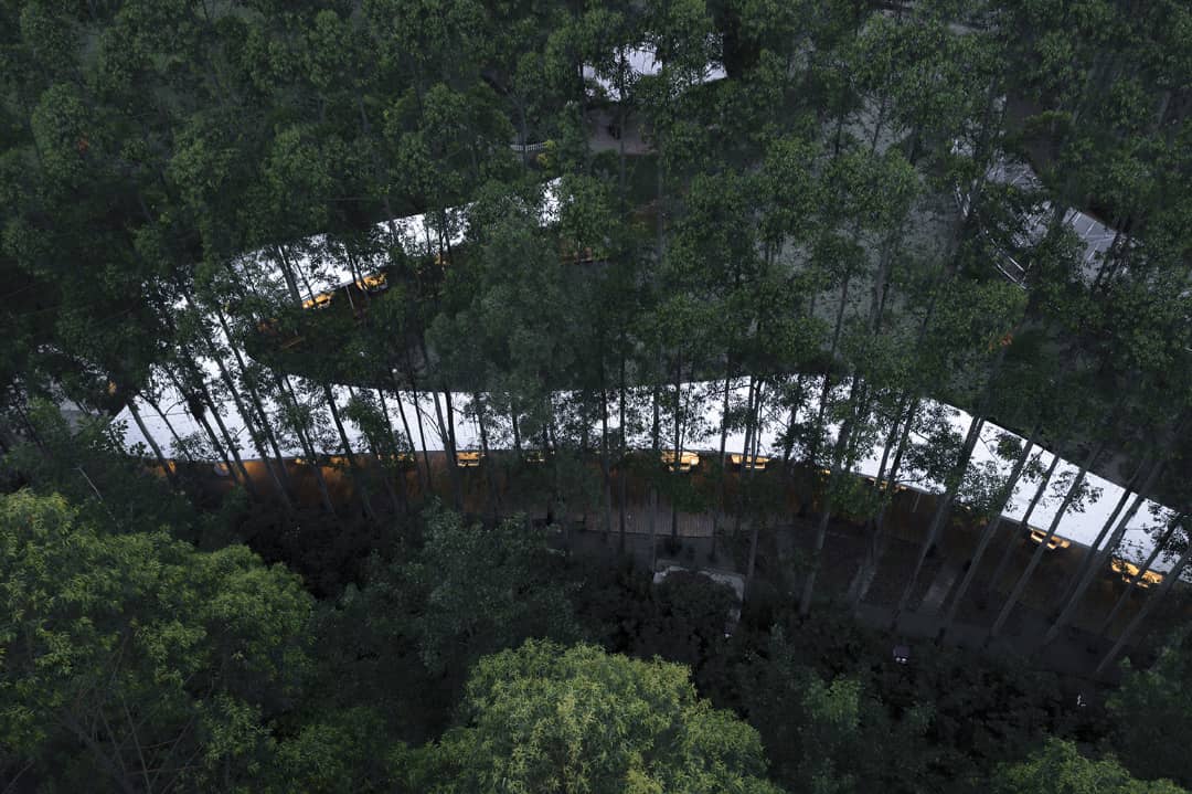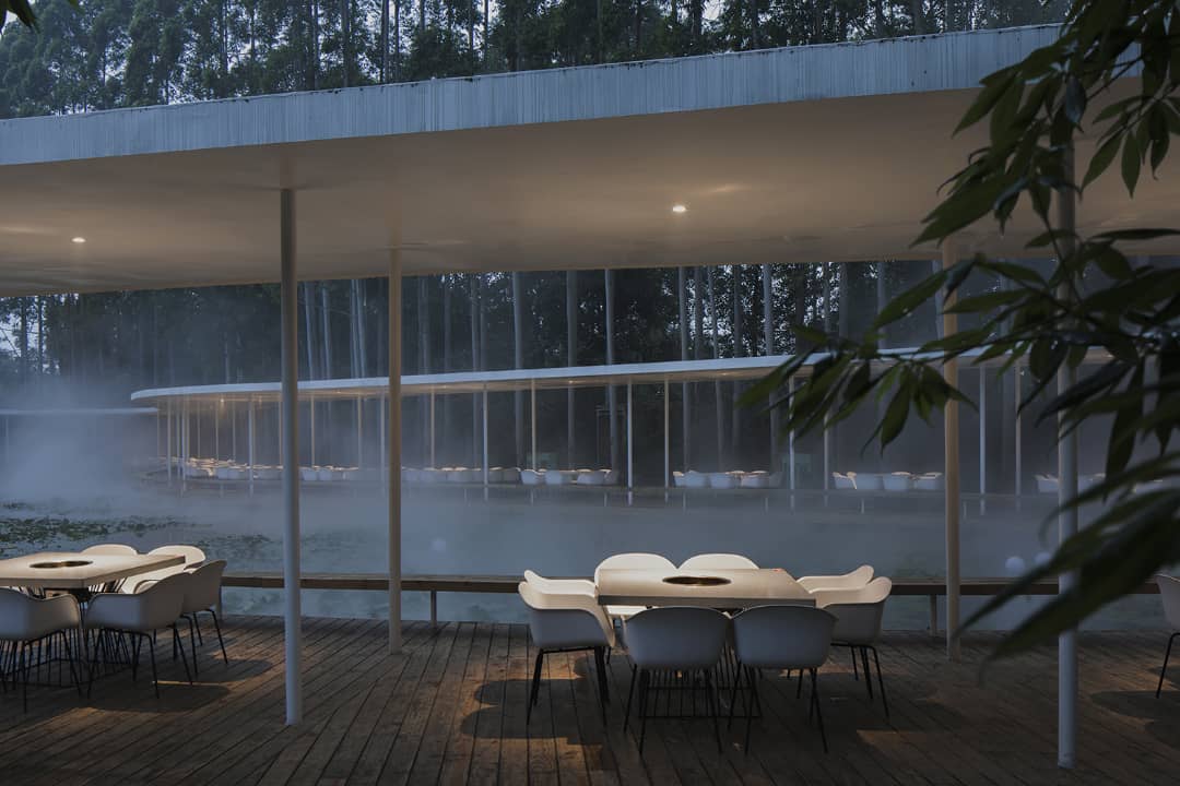 رستوران Garden Hotpot در مناطق حاشیه شهرک Sansheng ، و دقیقا حول حوضچه نیلوفر آبی واقع شده است ، که در یک جنگل اکالیپتوس پنهان شده است. به منظور احترام بیشتر به محیط طبیعی، MUDA تصمیم میگیرد که مقیاس معماری و دیوارها را حذف کند، و تنها با استفاده از ستونها و تخته برای پنهان کردن ساختمان در جنگل، این امتیاز را به ساختمان بدهد تا به آرامی با محیط ادغام شود و دریاچه را به شکلی آرام و امن توصیف کند.
