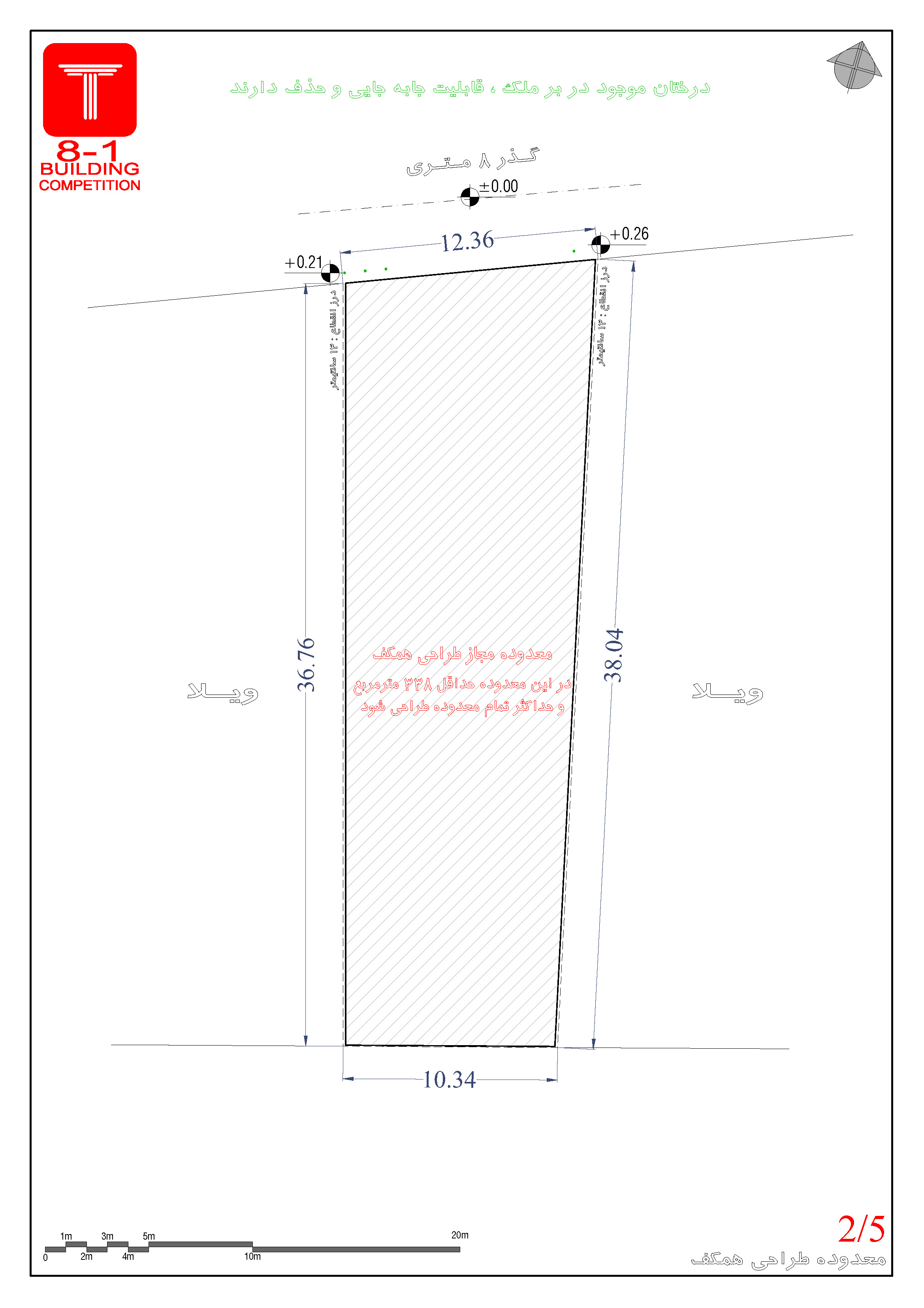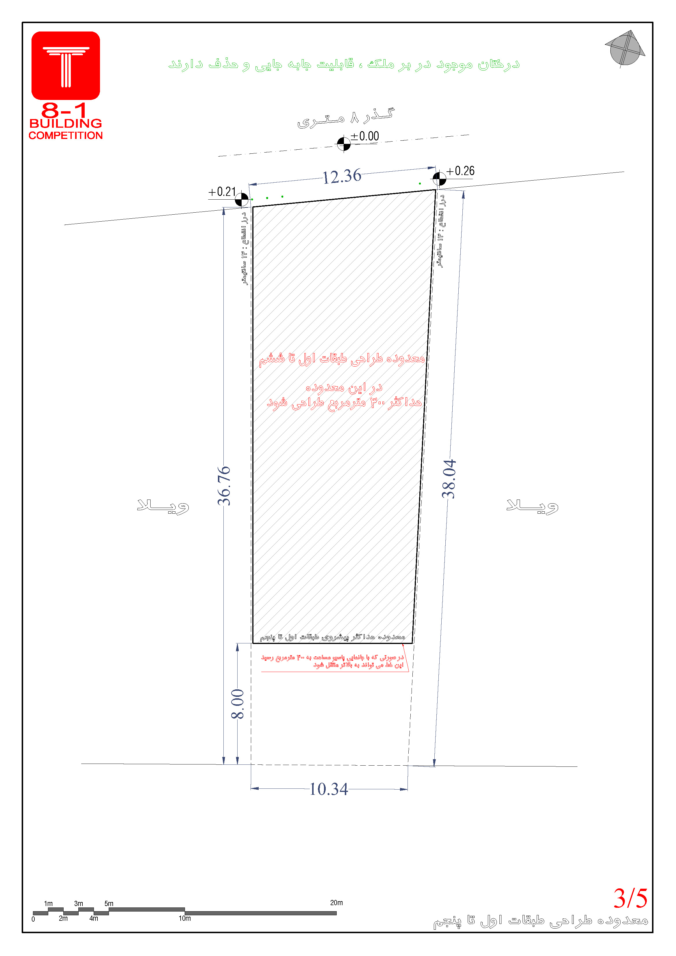 • سطح اشغال طبقه همکف حداقل 338 مترمربع و حداکثر 100 درصد زمین میباشد، مطابق با فایل اتوکد آپلود شده در بخش فایلهای راهنما
