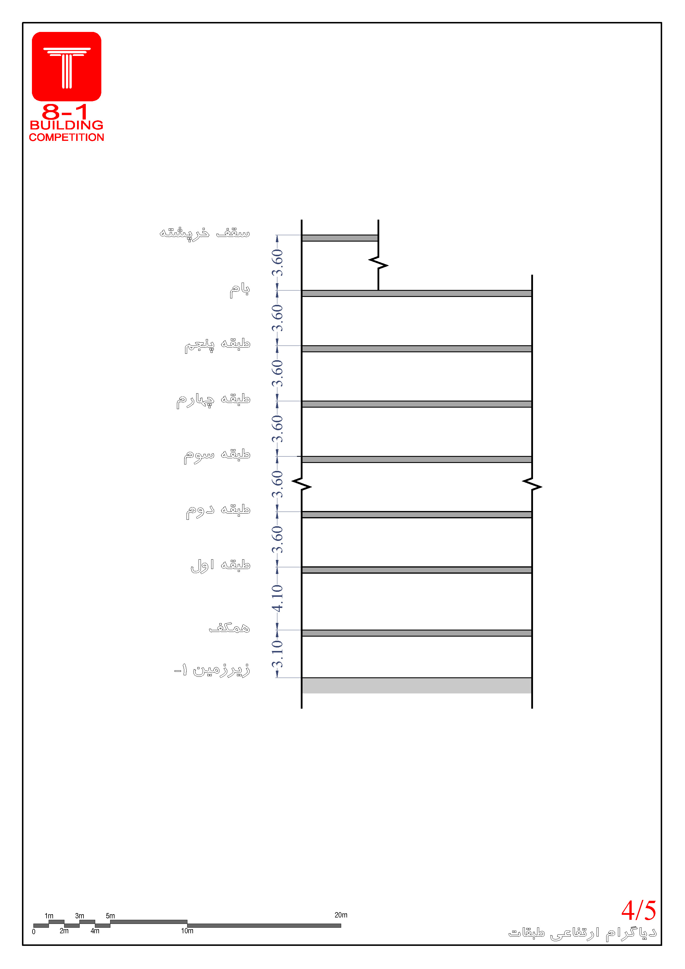 • تعداد طبقات بصورت 1 طبقه زیرزمین، همکف و 5 طبقه مسکونی روی همکف .