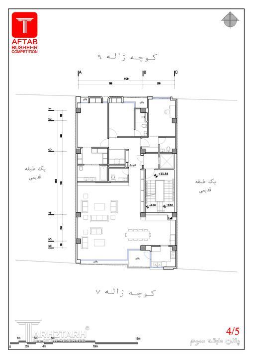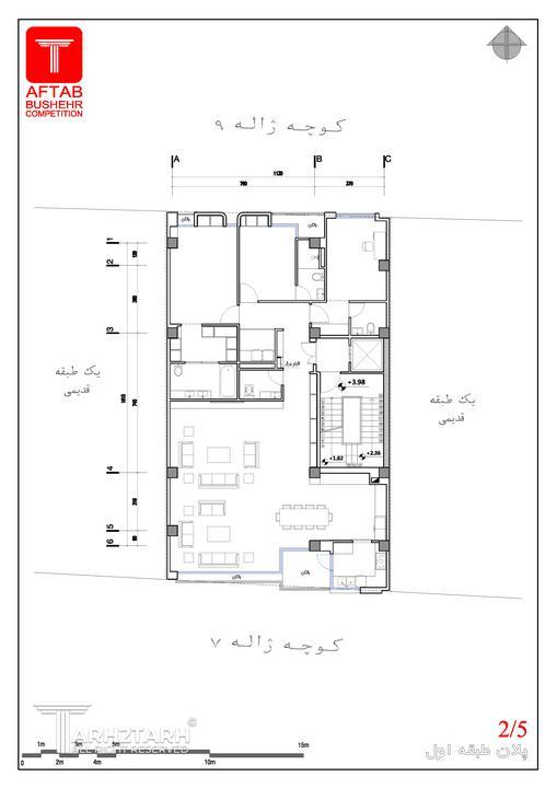 • پلان طبقات شامل محل راه پله و آسانسور و سایر موارد ثابت و غیر قابل تغییر است ولی به جهت طراحی نما،طراحان مجاز به تغییرات کم در محل و ابعاد بالکن ها هستند ولی به این نکته توجه شود که دسترسی مستقیم آشپزخانه به بالکن حفظ شود.
