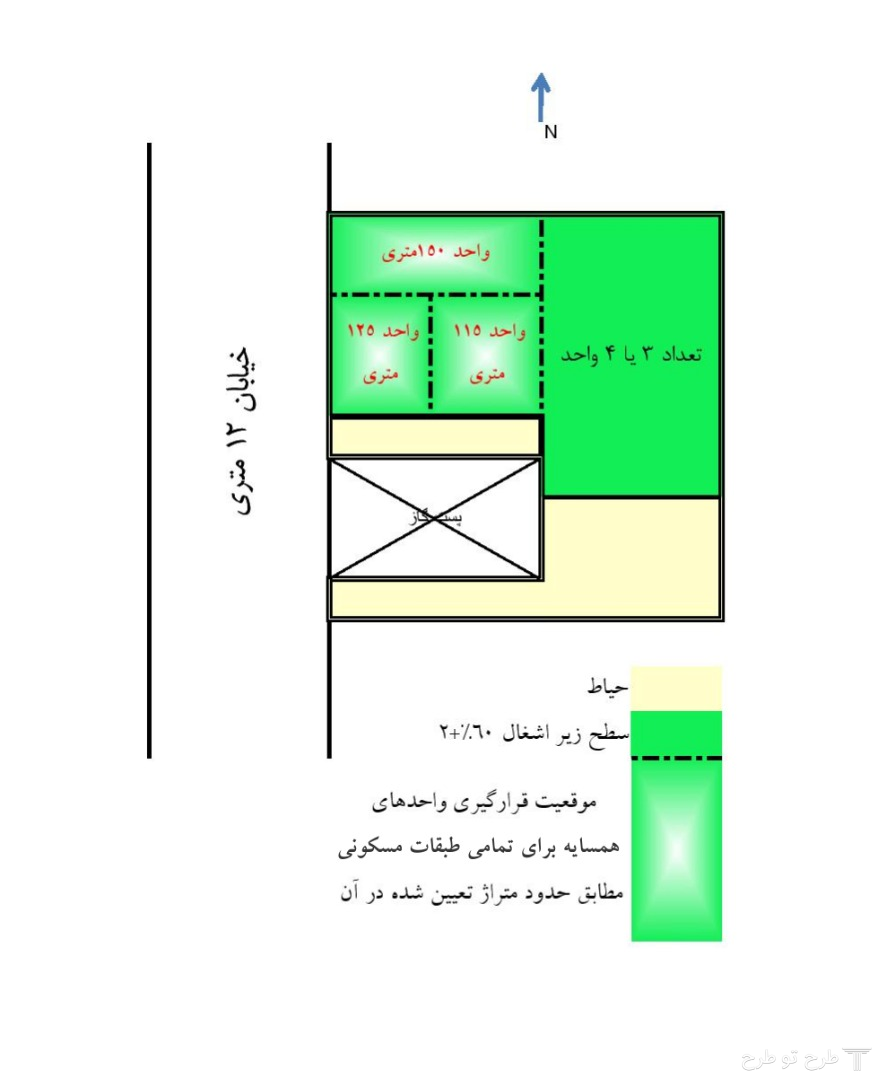 2- تعداد واحدهای مسکونی در هر طبقه 6 الی 7 واحد در نظر گرفته شود با در نظر گرفتن همسان بودن کیفیت متراژ واحدها(واحدهای خیلی بزرگ در مجاورت واحدهای خیلی کوچک قرار نگیرند) که در هر طبقه تعداد 3واحد مسکونی در موقعیتی (کروکی پیوست) که نشان داده شده است می بایستی به متراژهای 115 ، 125 و 150 مترمربع ( با اختلاف 5% ) لحاظ شود و برای مساحت واحدهای دیگر در طبقات محدودیتی نداریم (به پیشنهاد طراح سه یا چهار واحد) لیکن مساحت واحدها بایستی با میزان کیفیت نوردهی متناسب باشند.