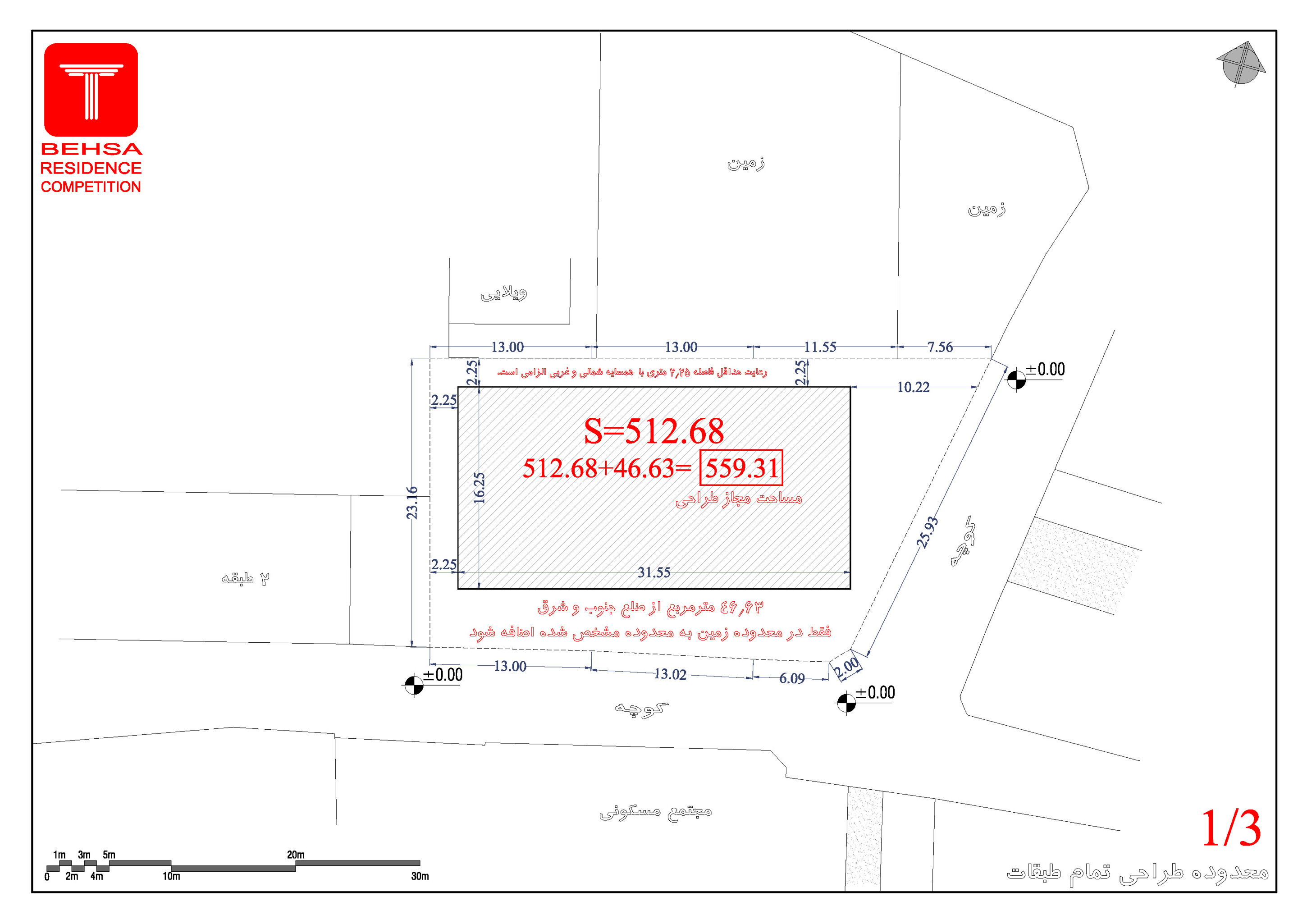 • سطح اشغال طبقات مسکونی روی همکف برابر 559.31 مترمربع، مطابق با فایل اتوکد آپلود شده در بخش فایلهای راهنما