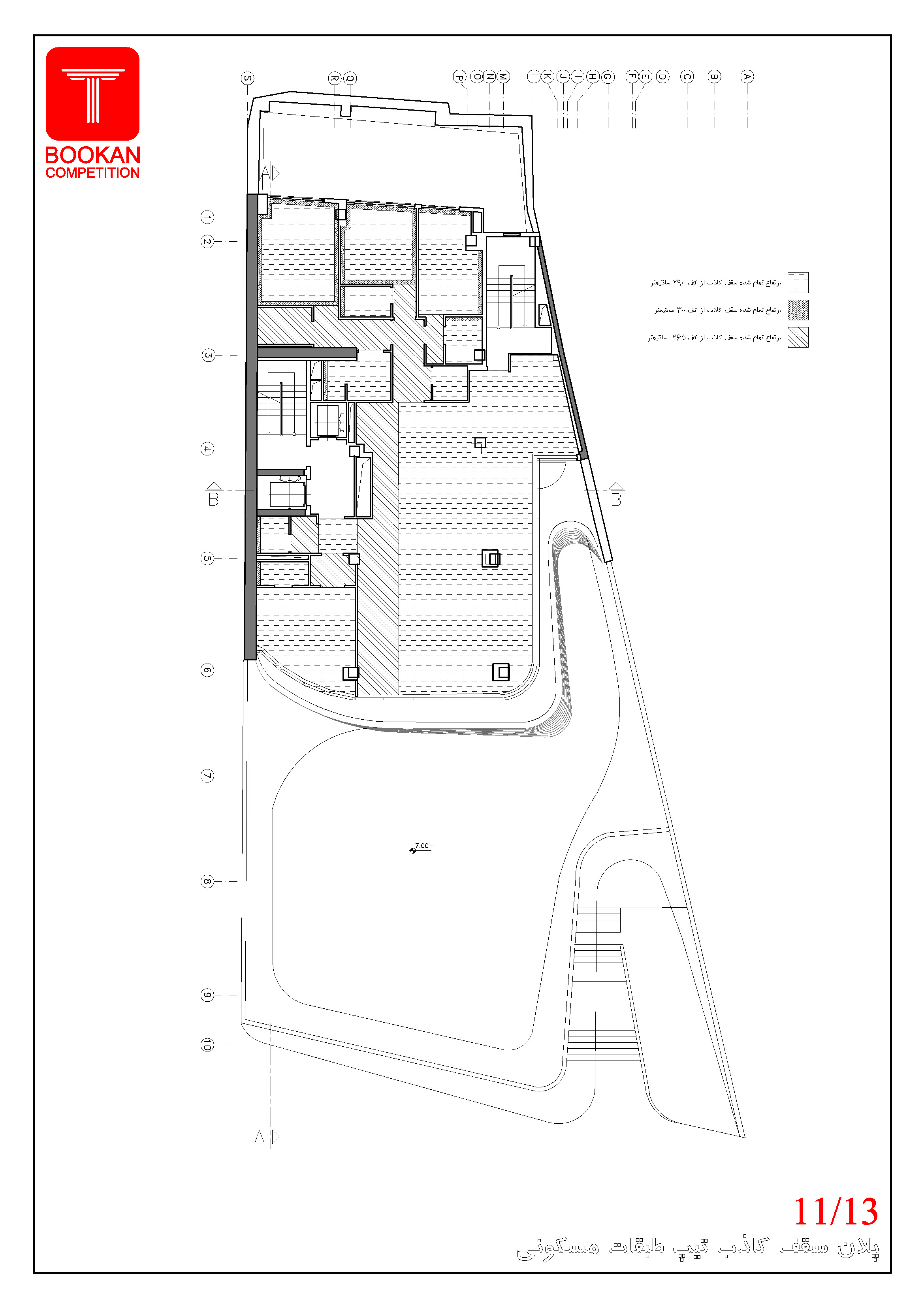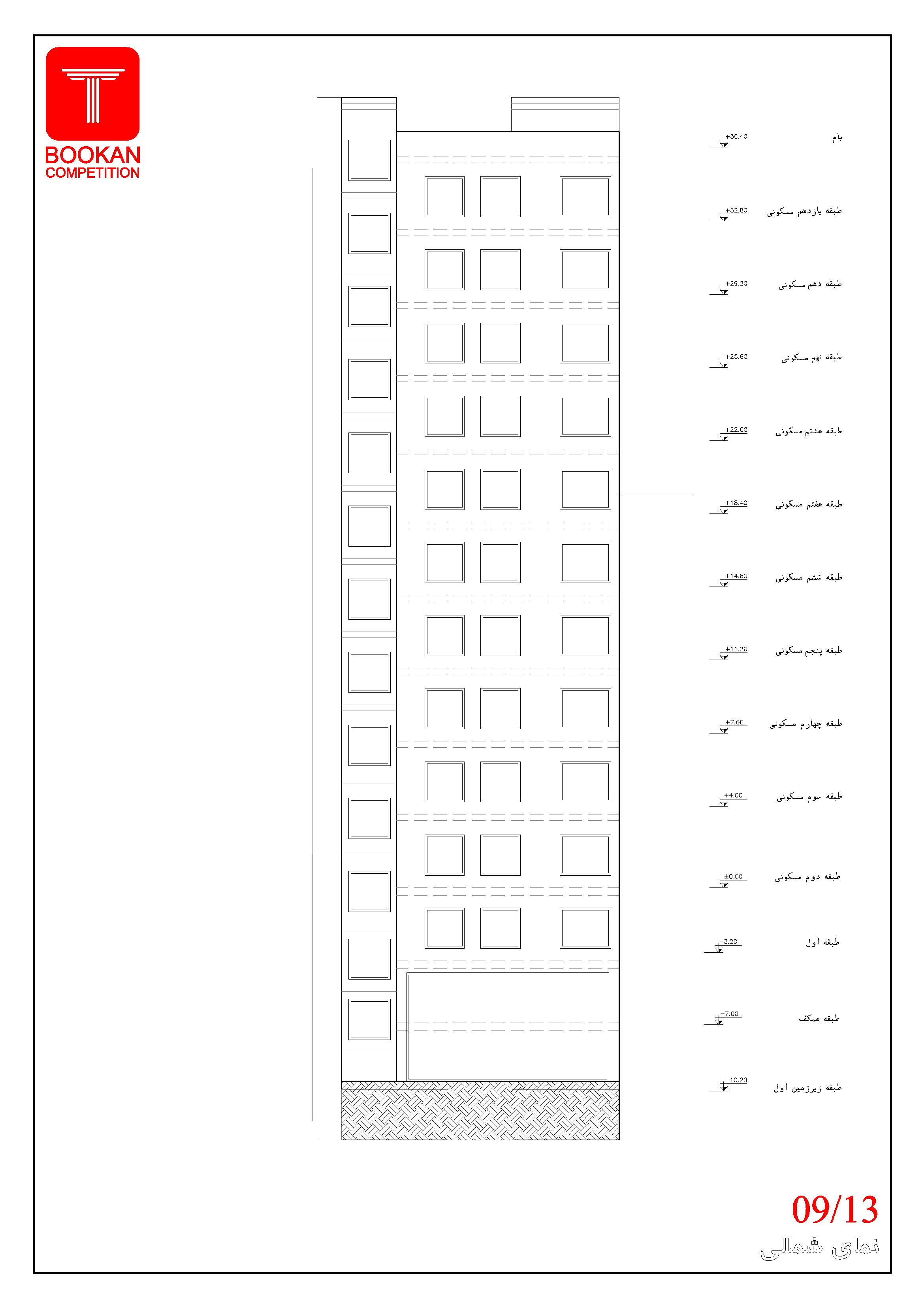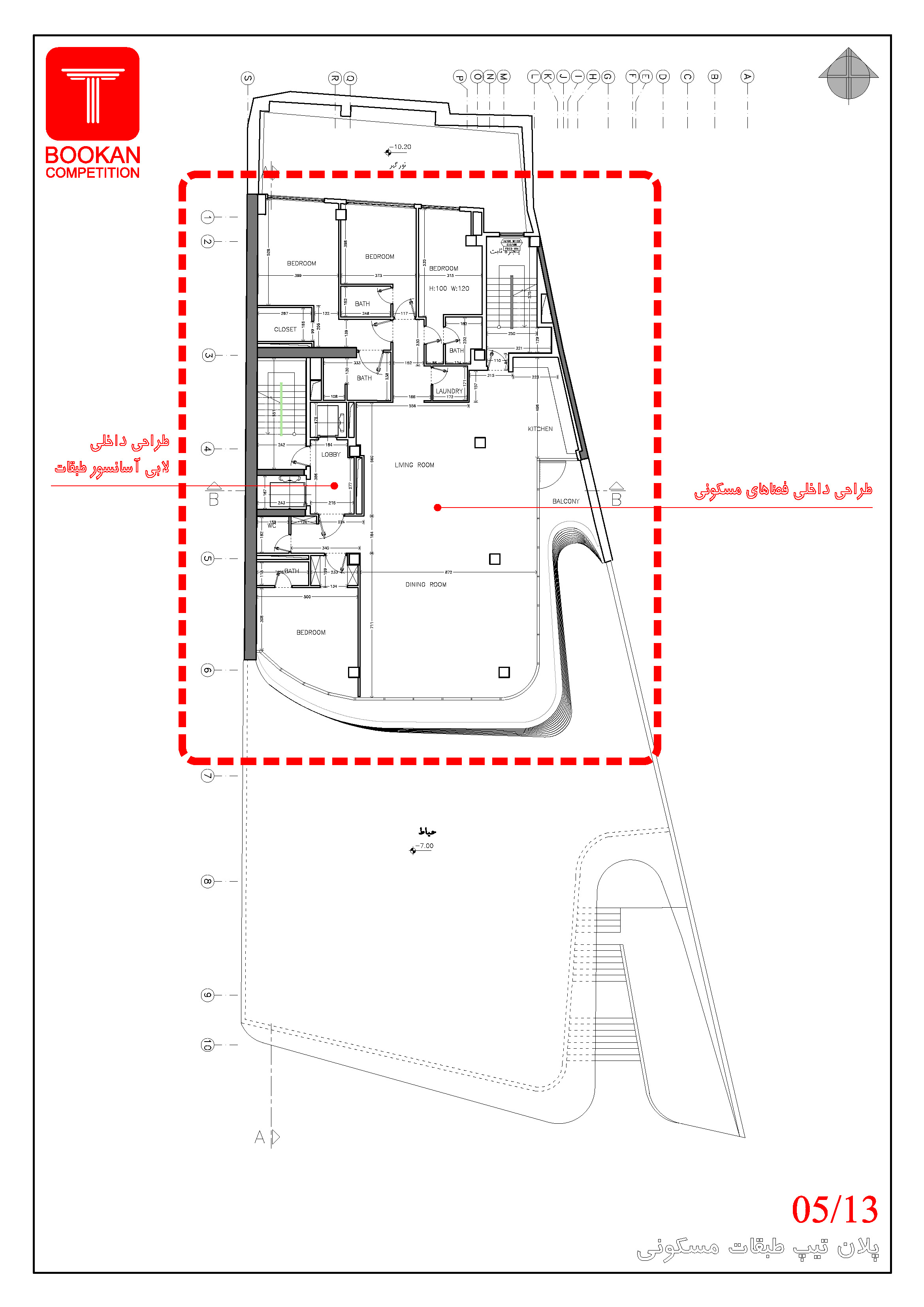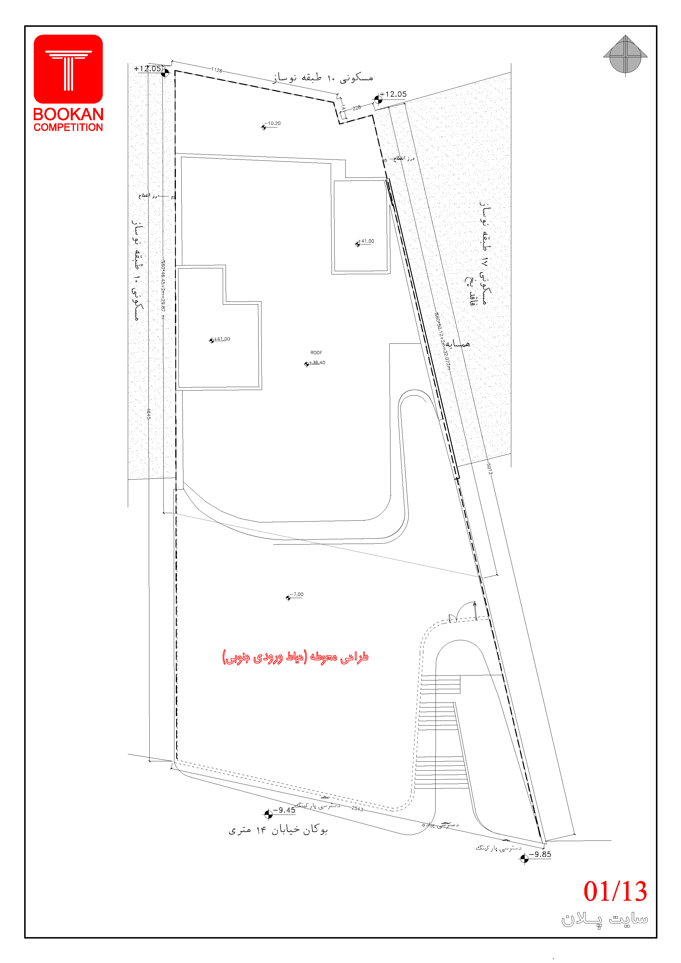 • ساختمان در زمینی به مساحت 892 متر مربع در خیابان بوکان اجرا شده است، محل راه پله ها ، آسانسورها و عناصر سازه ای ثابت و غیرقابل تغییر هستند، و اولویت با حفظ پلان موجود است ولی در صورت پیشنهادات بهینه معماری ، امکان ایجاد تغییرات جزئی در پلان طبقات مسکونی و سایر فضاهای مورد طراحی است. و حداقل تخریب در وضعیت موجود صورت بگیرد.