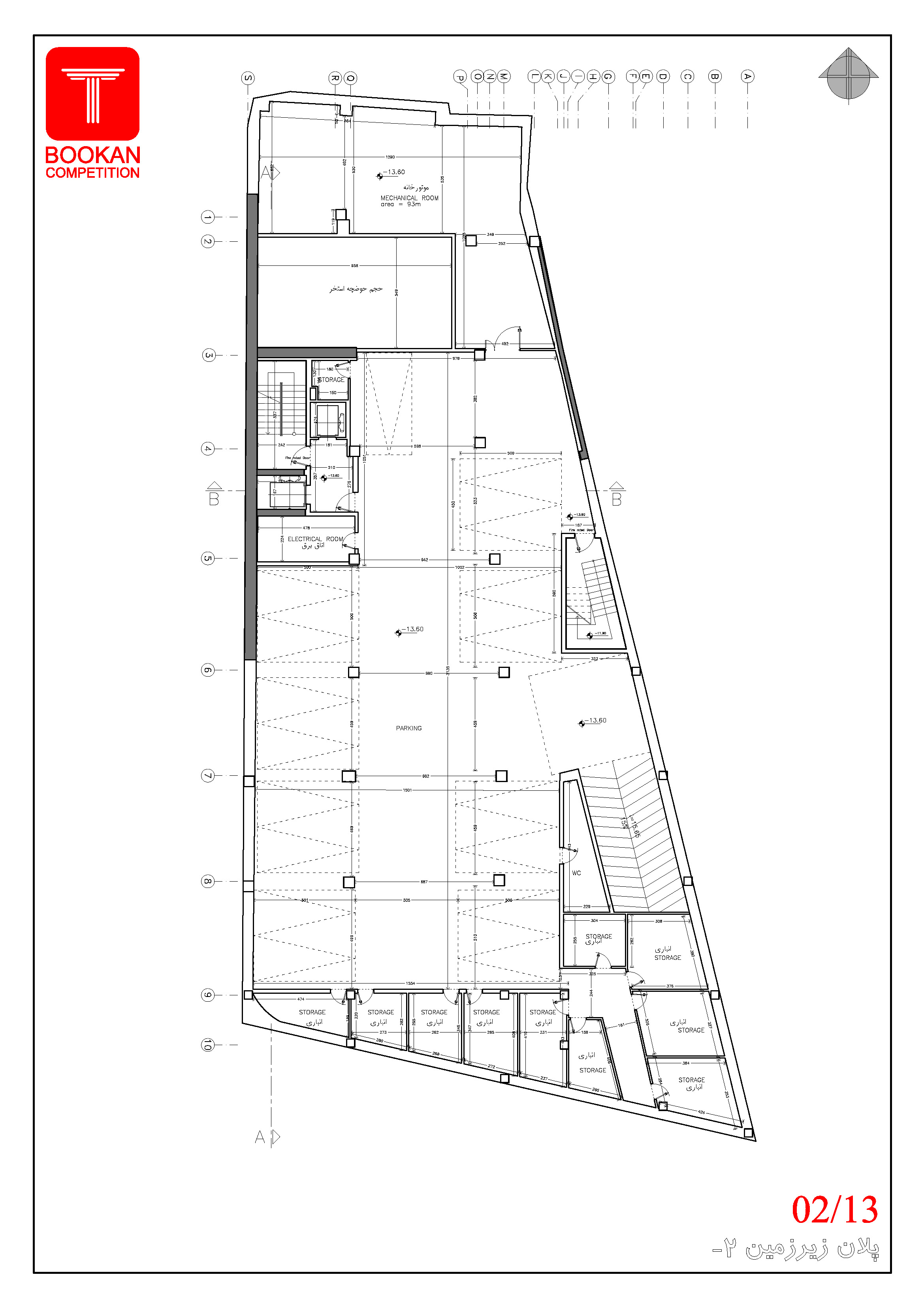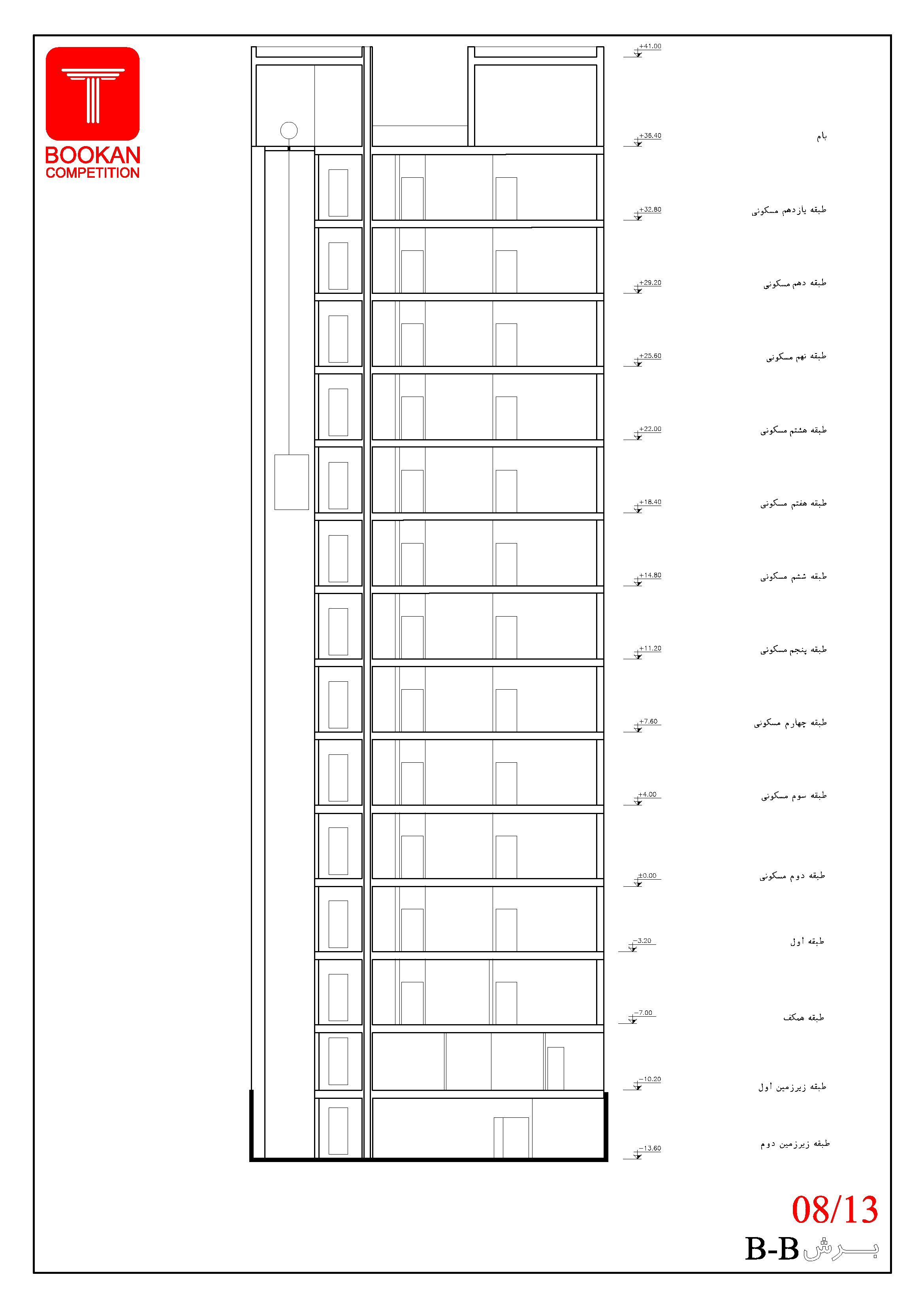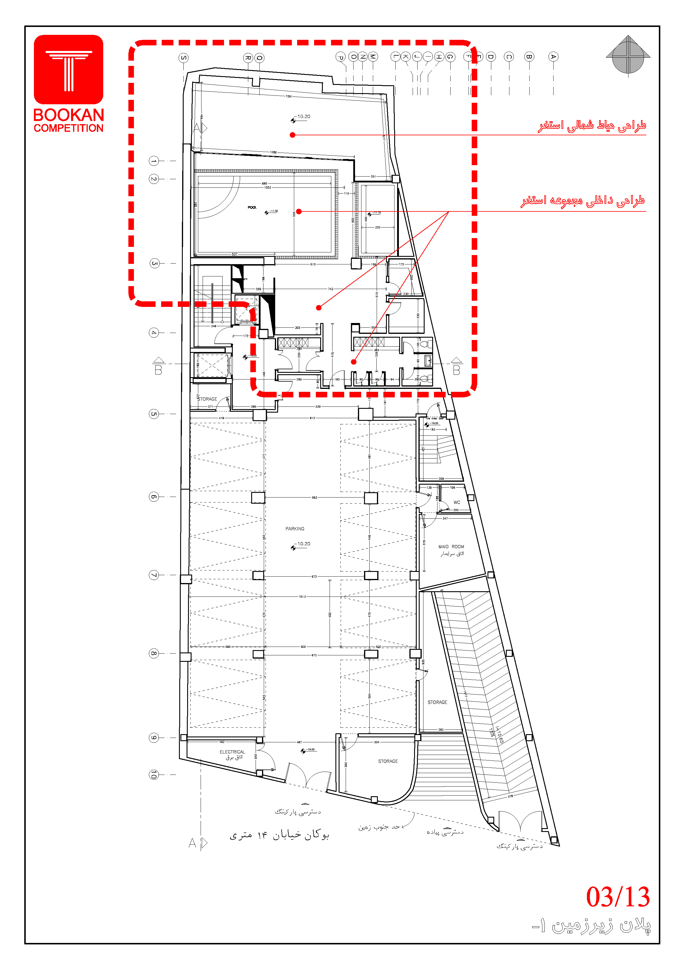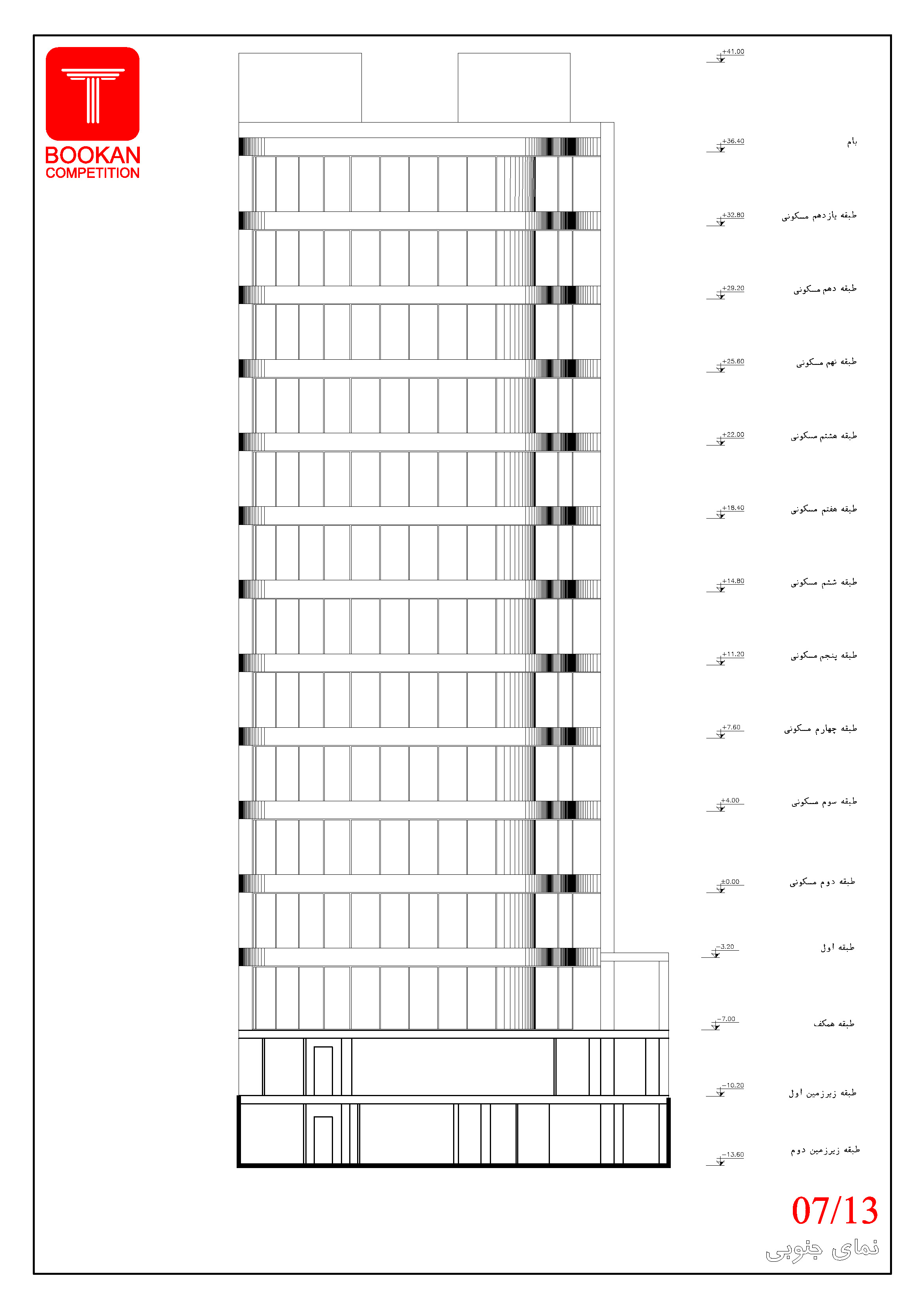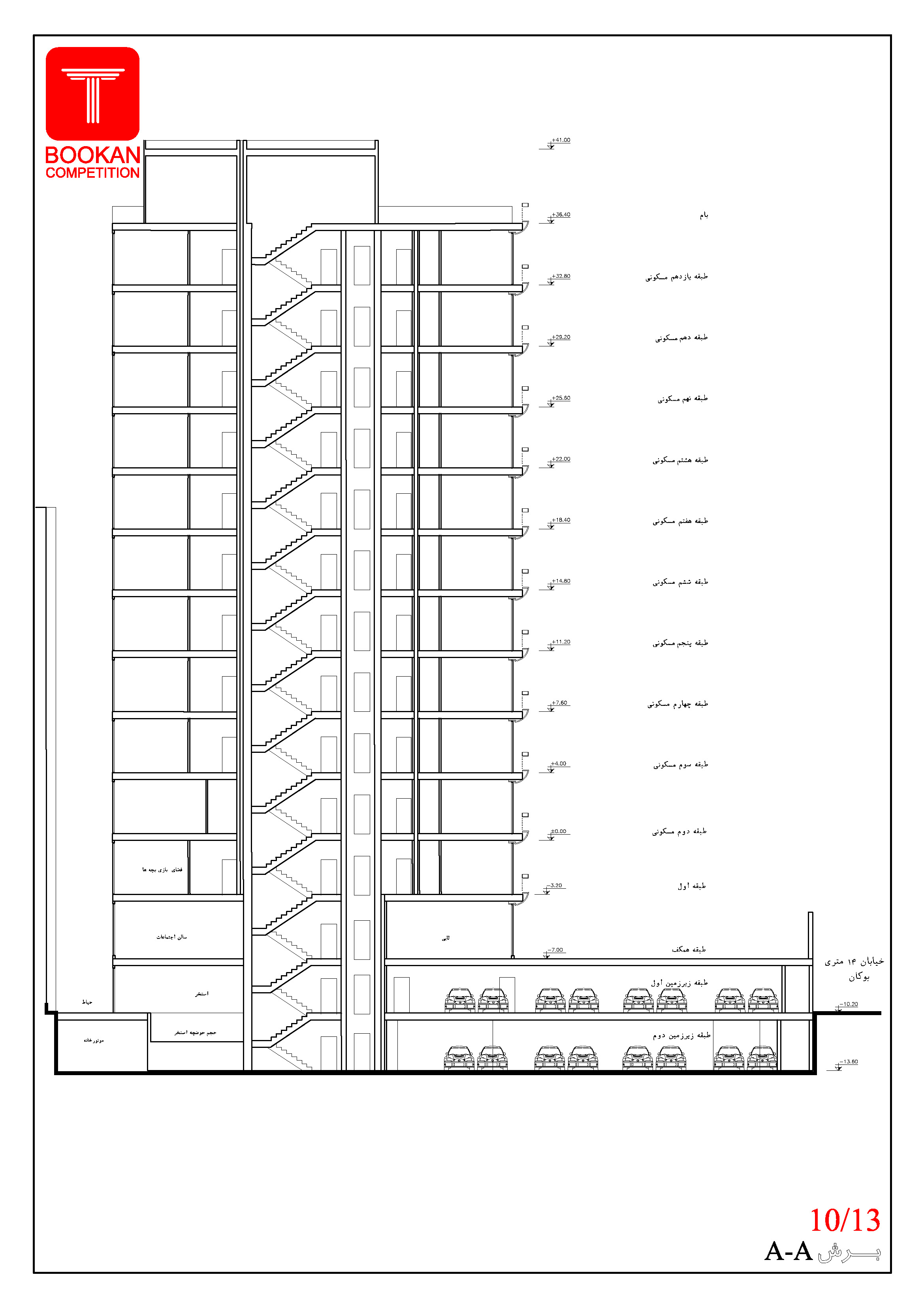 • ساختمان در زمینی به مساحت 892 متر مربع در خیابان بوکان اجرا شده است، محل راه پله ها ، آسانسورها و عناصر سازه ای ثابت و غیرقابل تغییر هستند، و اولویت با حفظ پلان موجود است ولی در صورت پیشنهادات بهینه معماری ، امکان ایجاد تغییرات جزئی در پلان طبقات مسکونی و سایر فضاهای مورد طراحی است. و حداقل تخریب در وضعیت موجود صورت بگیرد.