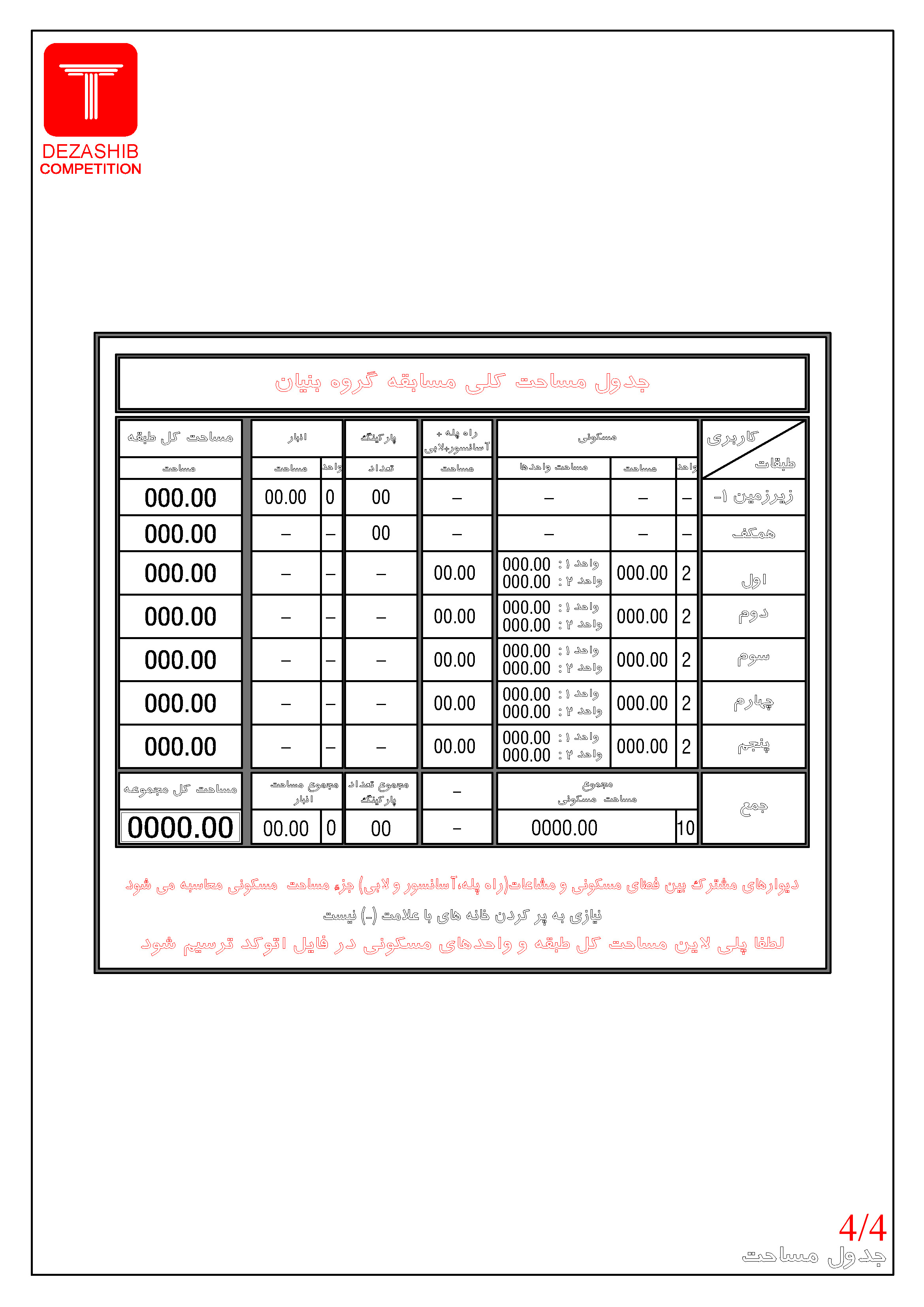 • سطح اشغال تمامی طبقات مسکونی ، طبق توضیحات فایل اتوکد میباشد.(توده گذاری در هر نقطه از زمین به اختیار طراح است ولی تمام طبقات باید هم پوشانی تقریبی داشته باشد)
