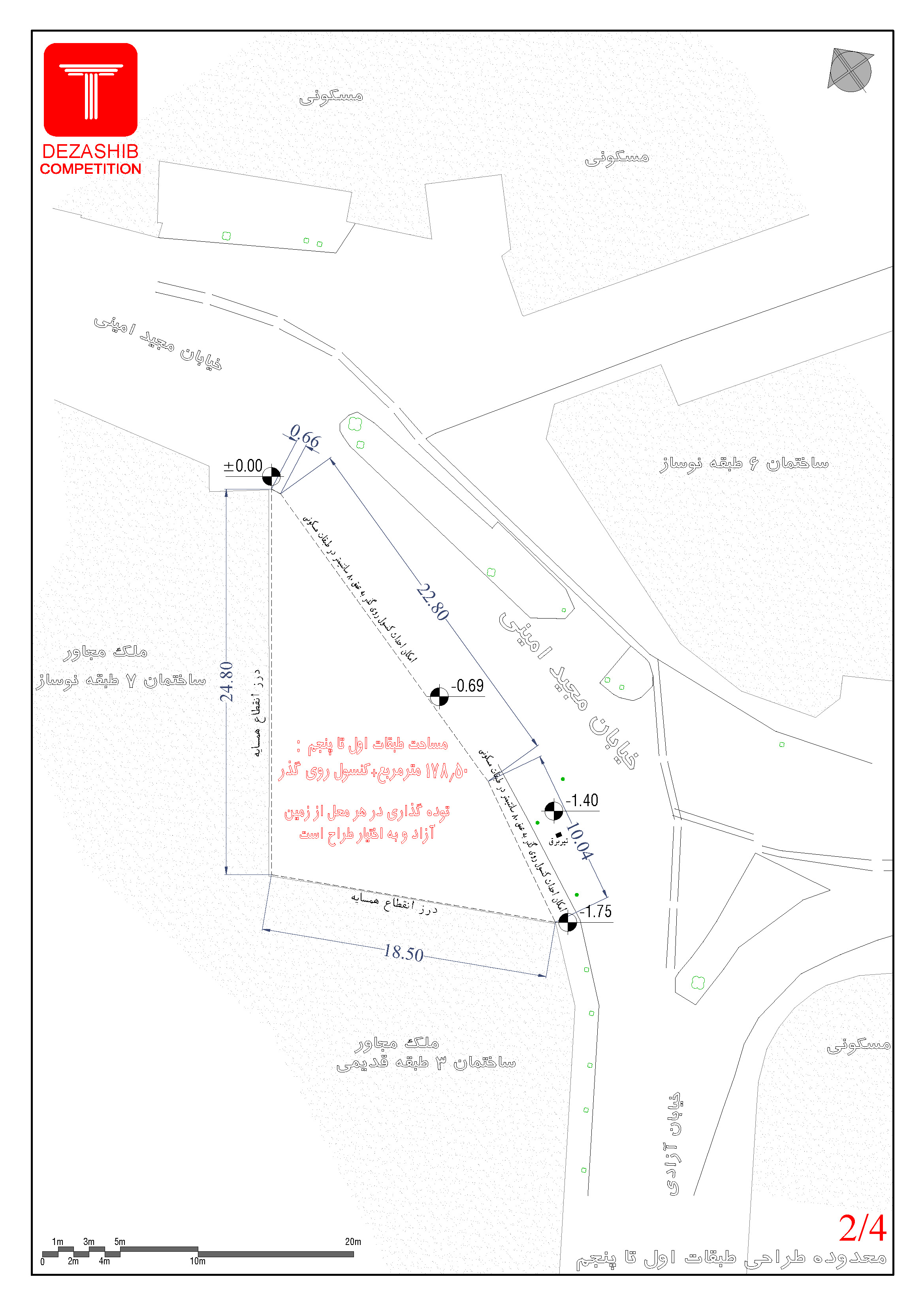 • طبقات اول تا پنجم هر طبقه 178.5 مترمربع میباشد(به اضافه کنسول روی گذر)، طبق توضیحات فایل اتوکد میباشد.(توده گذاری در هر نقطه از زمین به اختیار طراح است ولی تمام طبقات باید هم پوشانی داشته باشد)