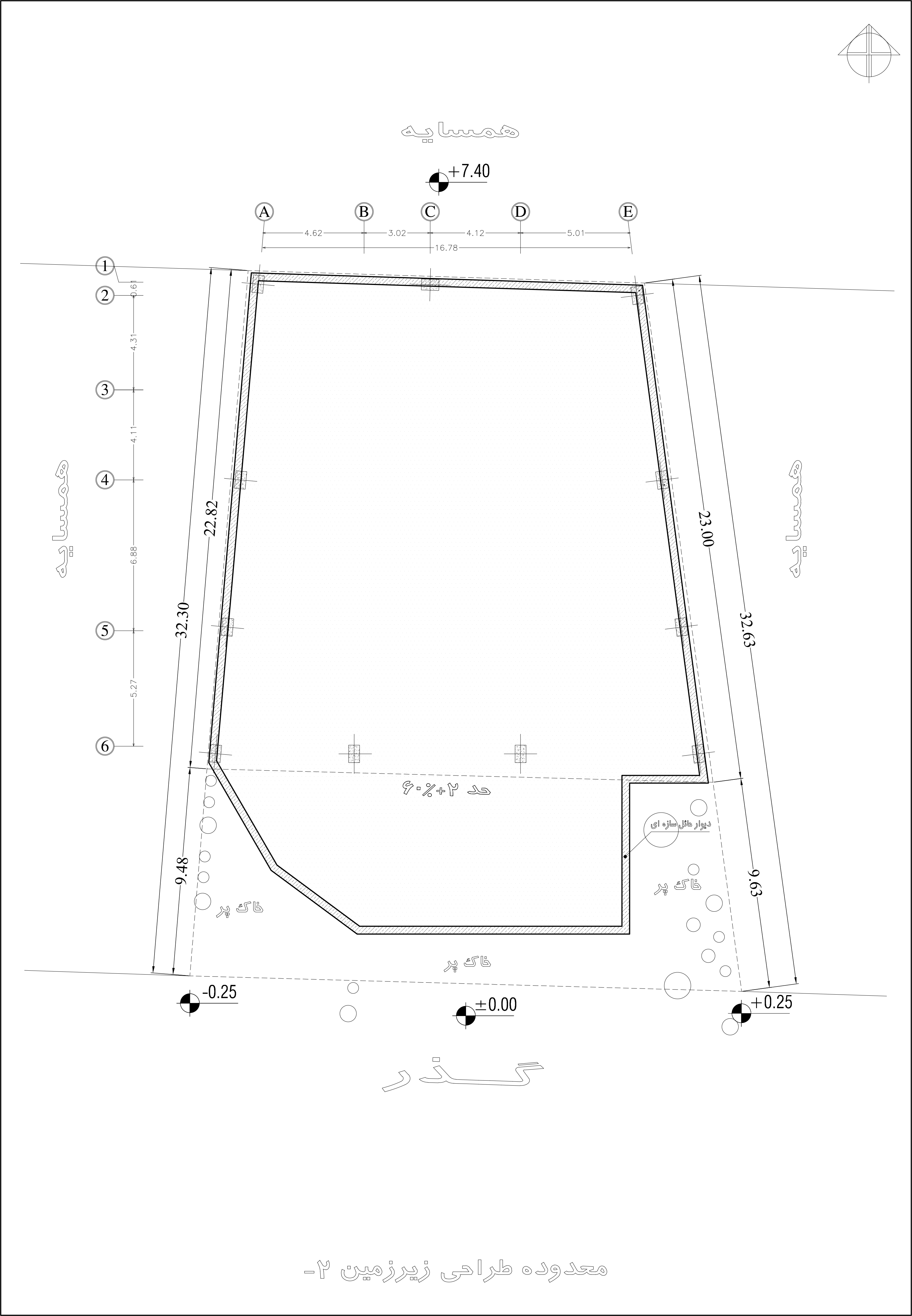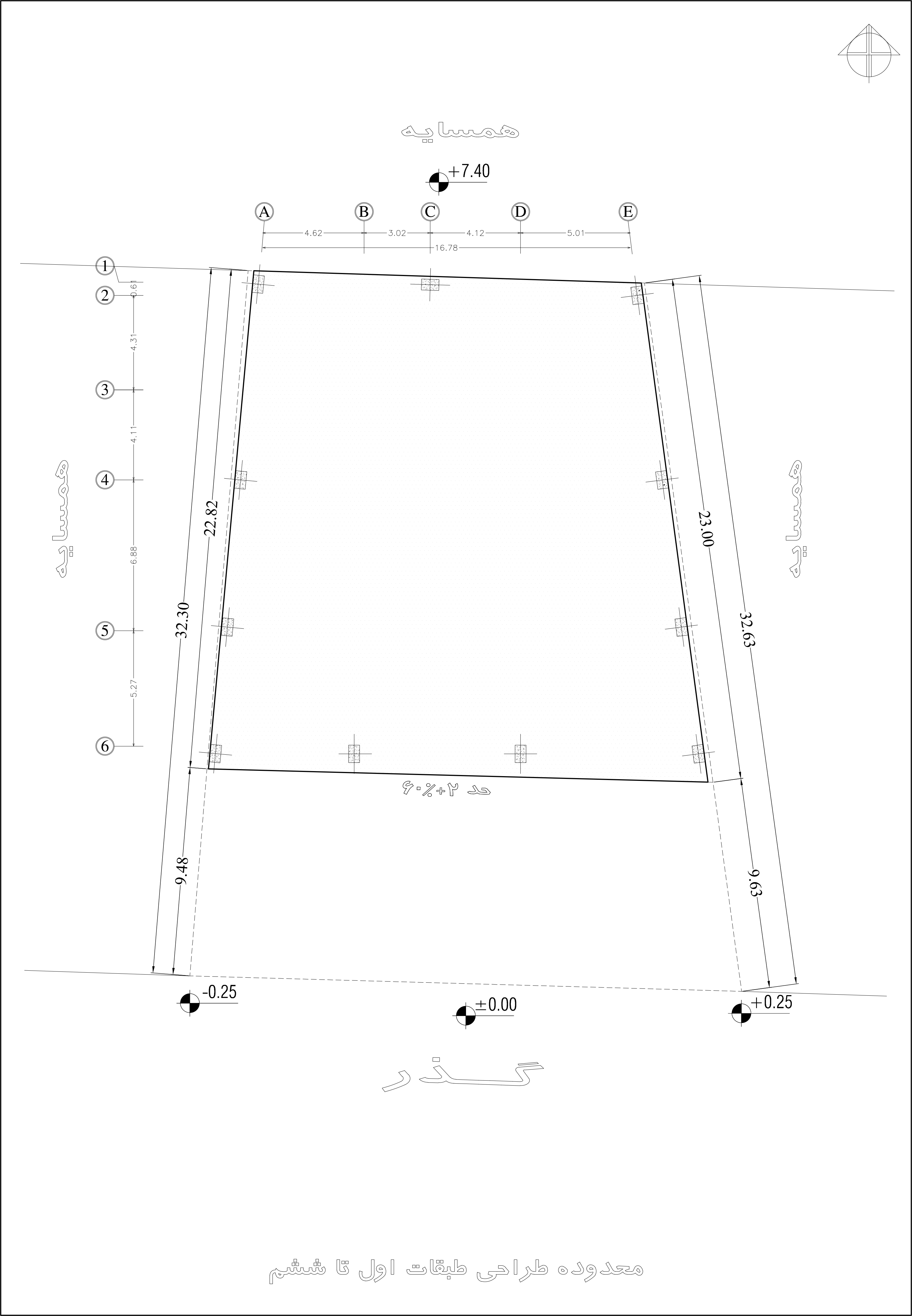 • یک طبقه همکف، شش طبقه مسکونی روی همکف و دو طبقه زیرزمین براساس کدهای ارتفاعی ارسال شده ملاک عمل برای طراحی است.