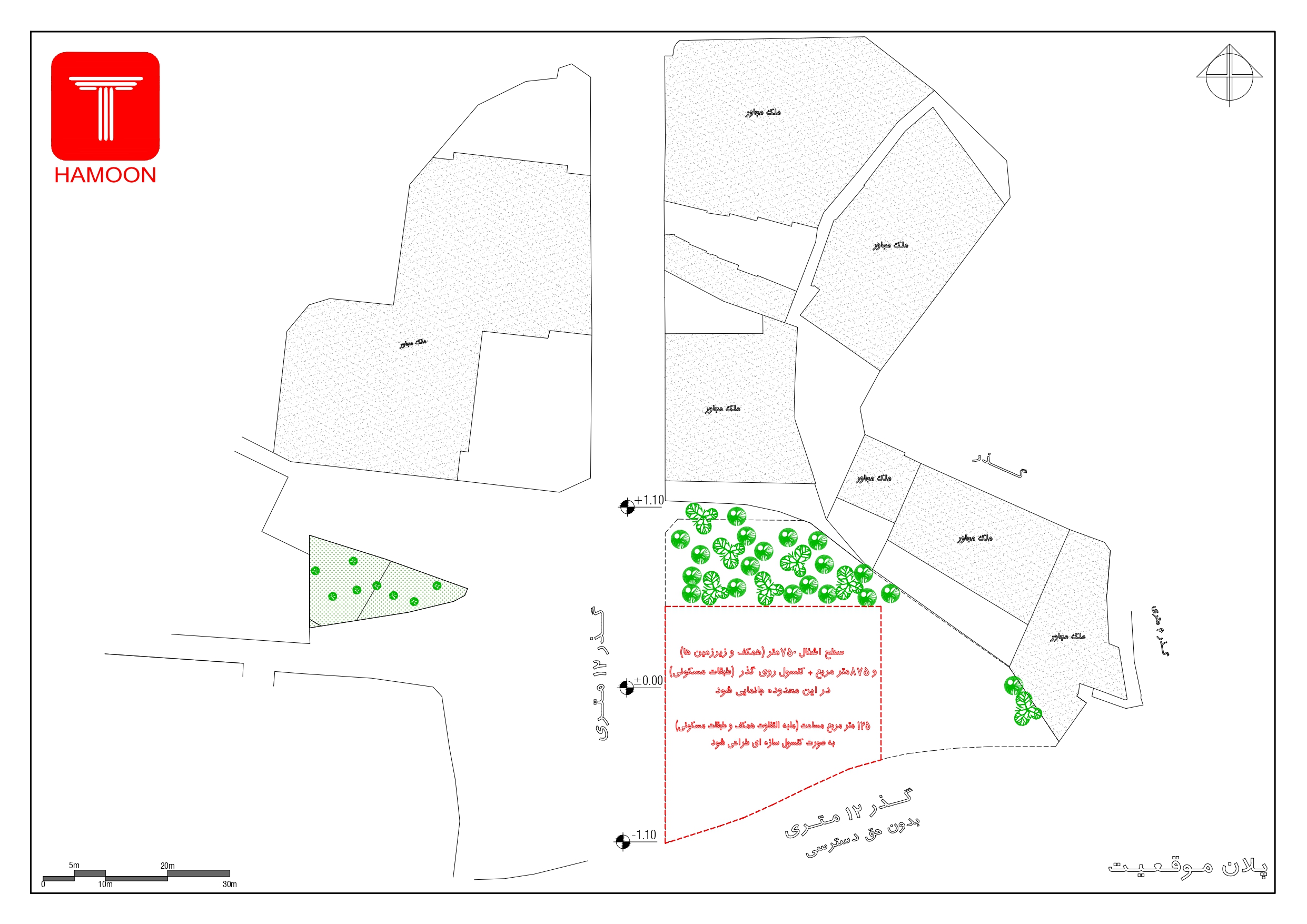 2- علاوه بر اضلاع دیگر از ضلع جنوب هم میتوان نورگیری داشت ولی دسترسی سواره و پیاده از ضلع جنوب امکانپذیر نیست.