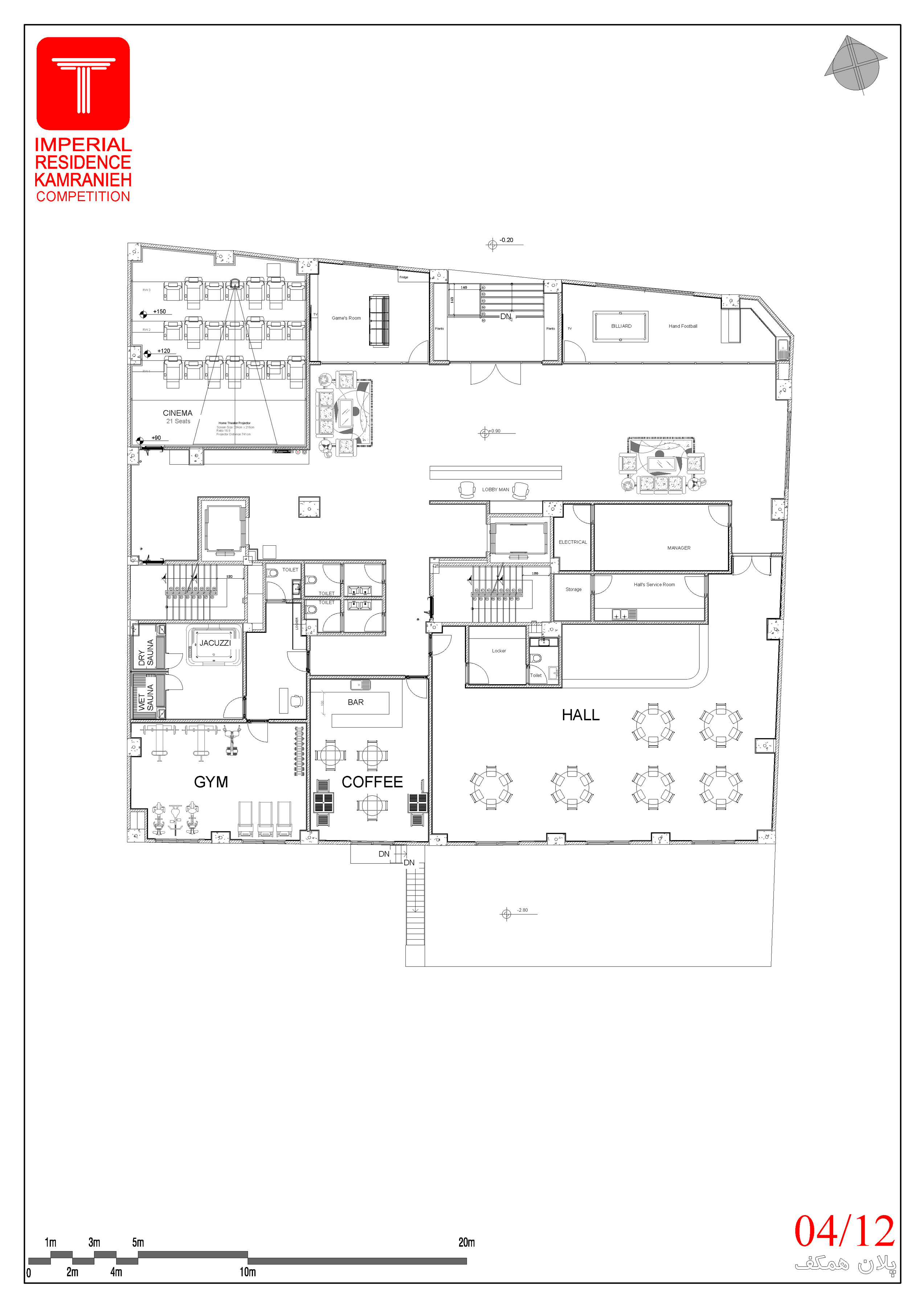 • یک عدد فایل شامل تمام پلان ها، رندرهای نمای شمالی، شرقی و جنوبی، داخلی لابی،داخلی GYM، داخلی اتاق بیلیارد و فوتبال دستی، داخلی اتاق بازی دیجیتال، داخلی سالن اجتماعات، داخلی سالن سینما، روف گاردن، محوطه و جدول متریال (تمامی مدارک ) جهت ارائه طرح با فرمت pdf