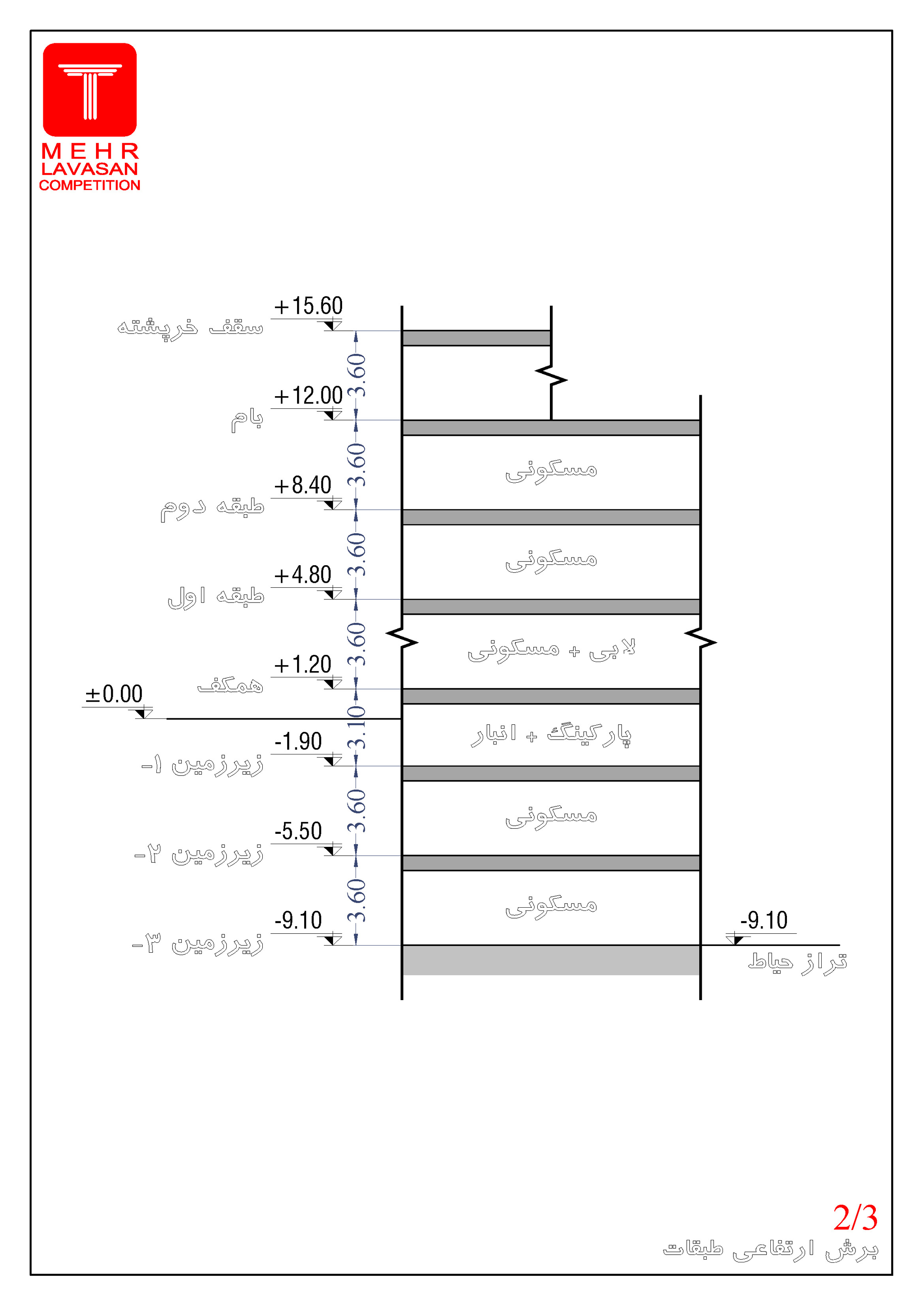 • تعداد طبقات بصورت زیرزمین 2-و3- (مسکونی)،زیر زمین 1- (پارکینگ و انبار)، همکف(لابی ورودی و مسکونی) و 2 طبقه مسکونی روی همکف میباشد.
