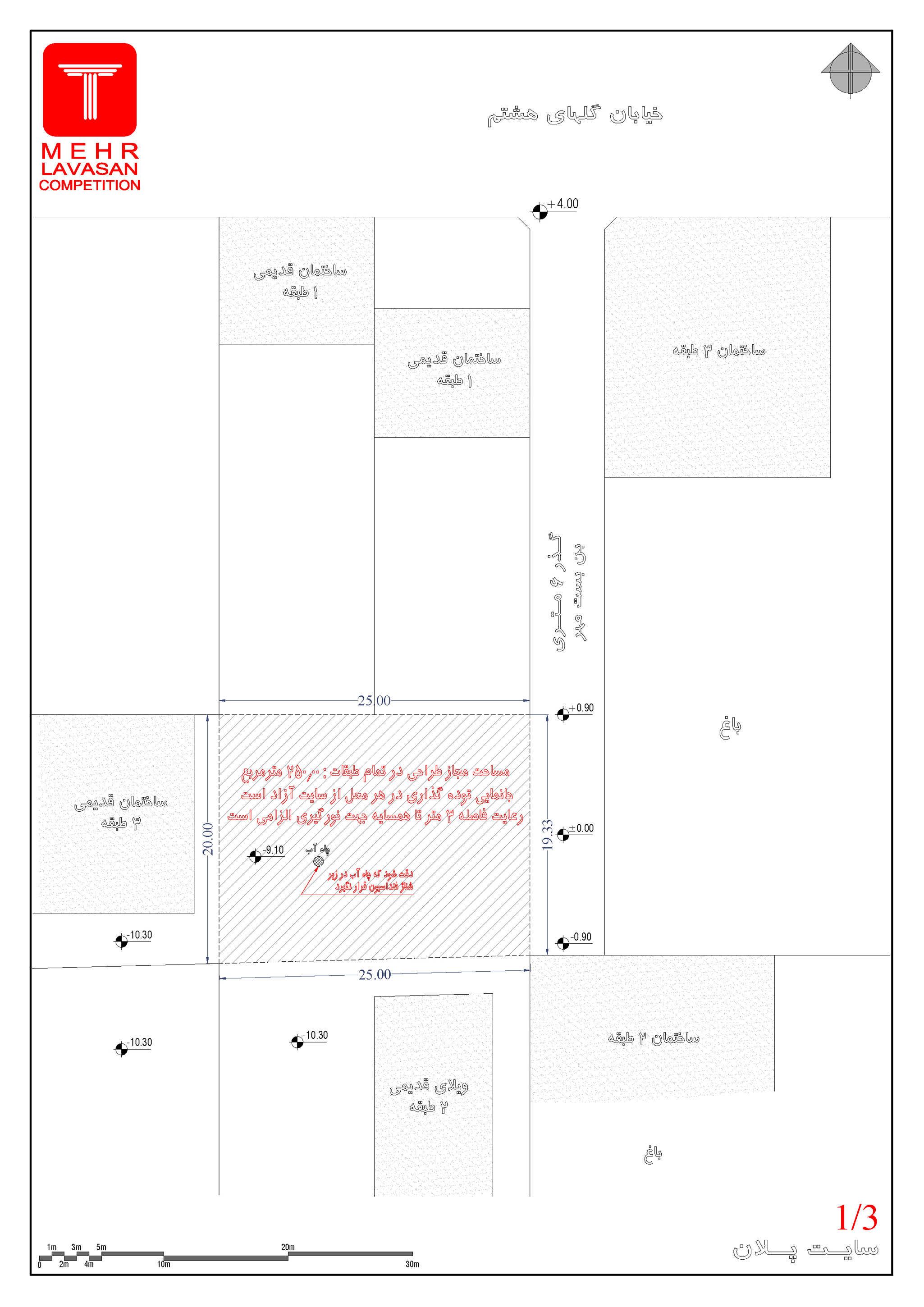 • سطح اشغال تمامی طبقات مسکونی،همکف و طبقات زیرزمین برابر 250 مترمربع با توده گذاری آزاد میباشد.(رعایت فاصله 3 متر تا همسایه جهت نورگیری الزامیست)