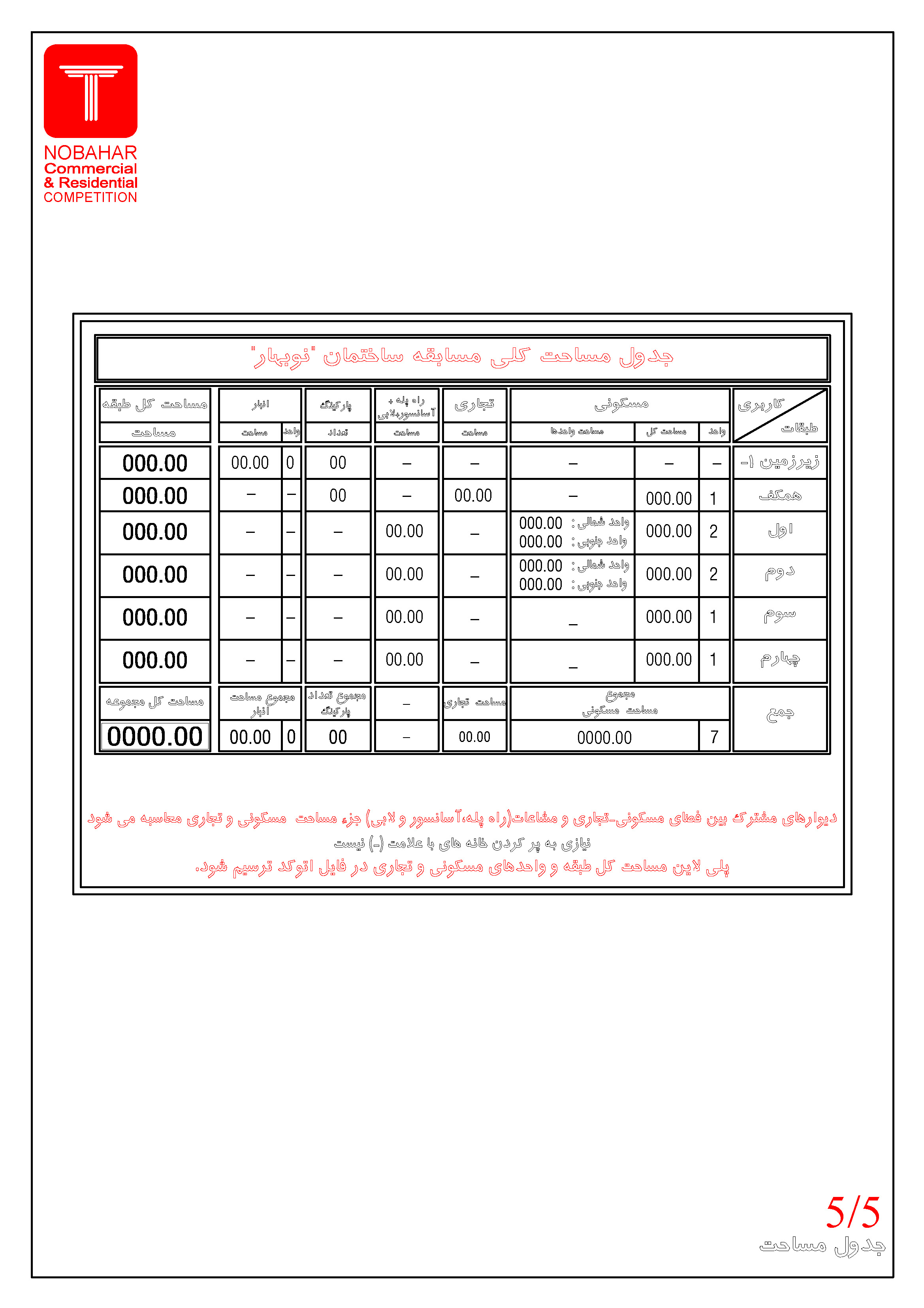 • فایل DWG شامل تمام پلان ها و برشها و جدول مساحت (تایتل) فایل اتوکد الزاما با ورژن ۲۰۱۰یا پایین تر ذخیره و ارسال شود.