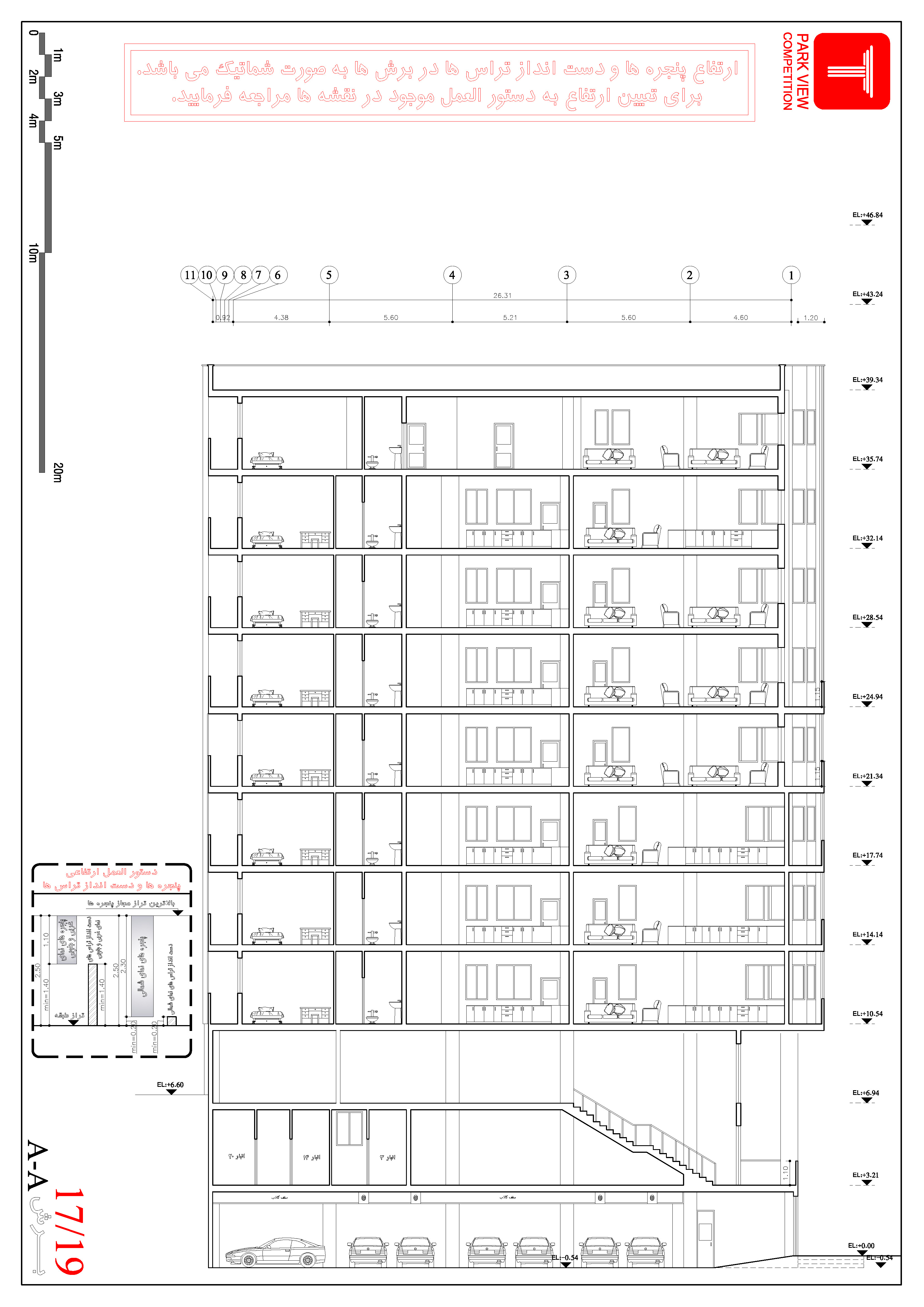• ارتفاع پنجرهها و دستانداز تراسها در برشها به صورت شماتیک میباشد، برای تعیین ارتفاع به دستورالعمل موجود در نقشهها مراجعه کنید.