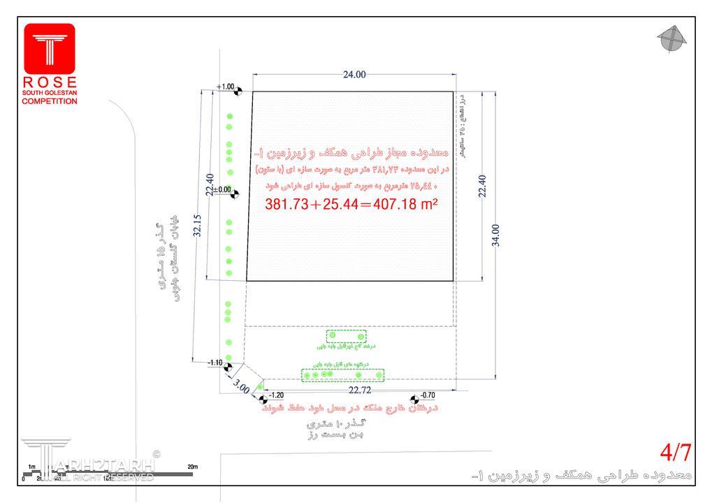 • سایت این پروژه در نبش شمال شرقی تقاطع خیابان گلستان جنوبی و کوچه رز واقع شده است و در هر طبقه مسکونی ۲ واحد، یک واحد شرق، یک واحد غرب مدنظر است که طراحی شود و در طبقه همکف نیز 3 واحد مسکونی طراحی می شود.