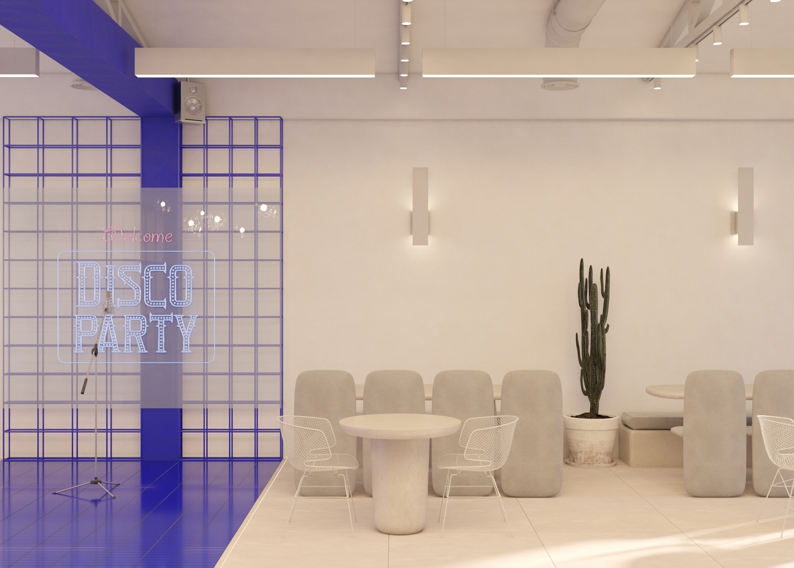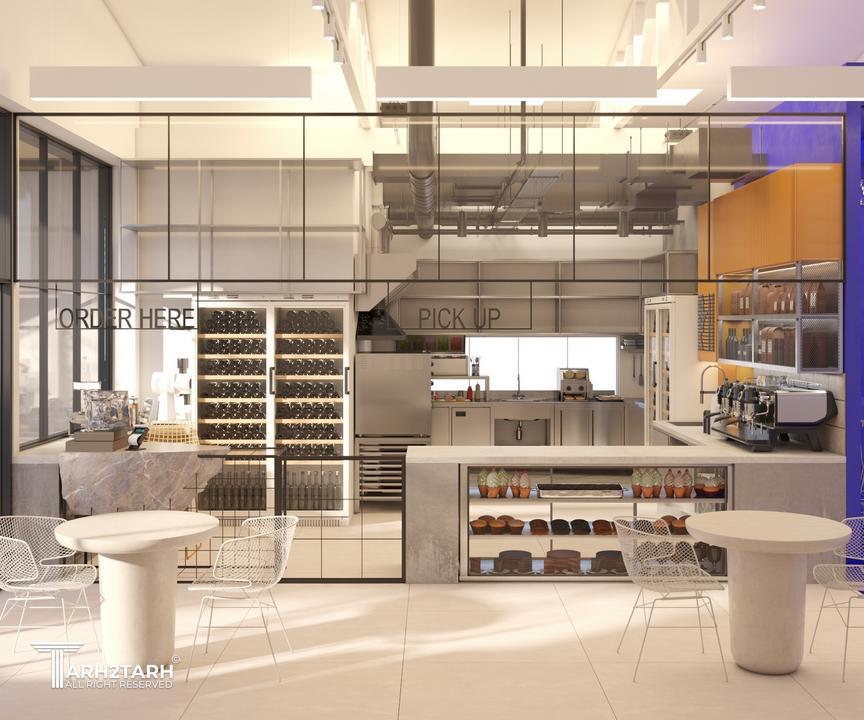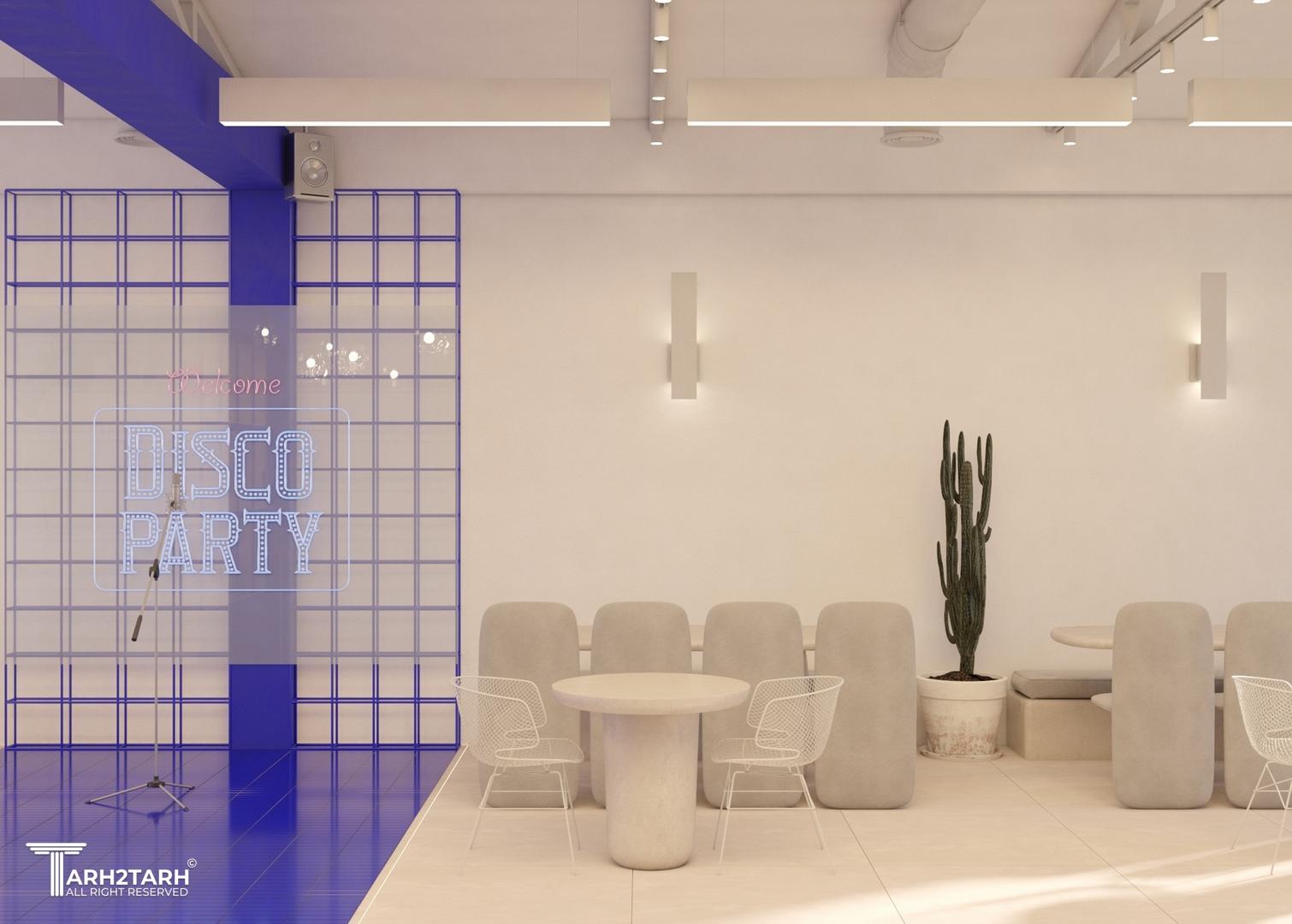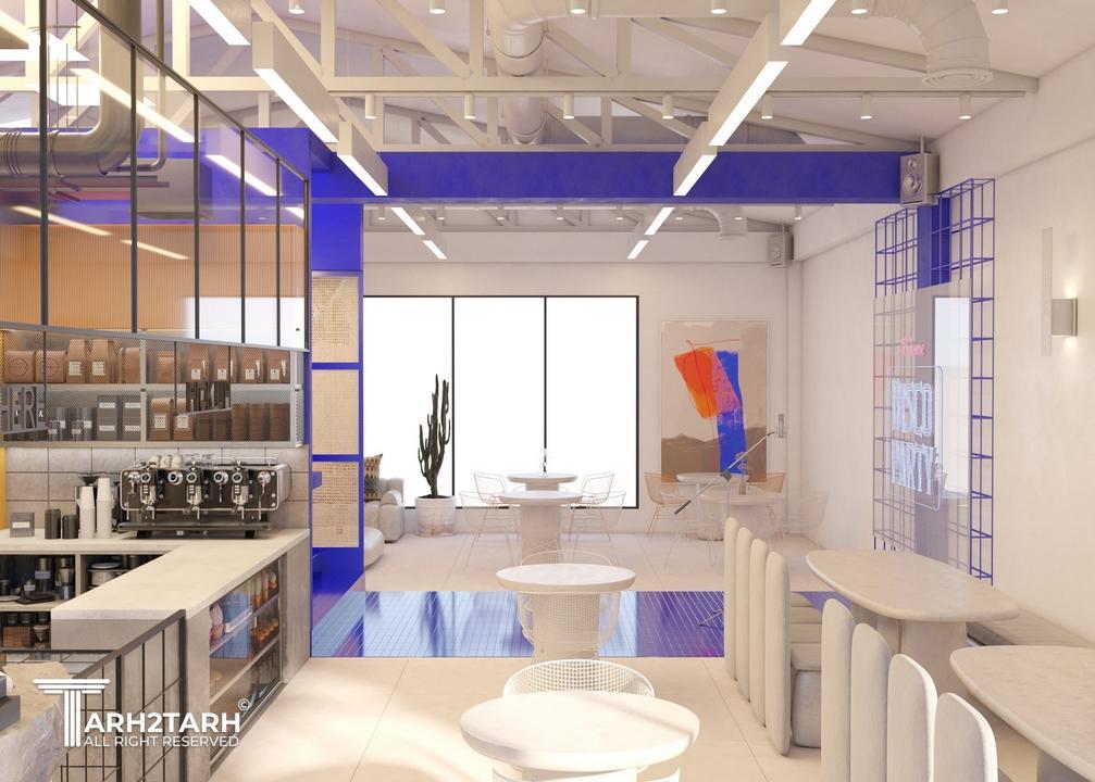بازسازی یک فضای صنعتی با رنگهای مینیمال سفید و آبی، حفظ ساختار سقف و جزئیات اصلی، و طراحی کافهای در ارتفاع با روف در طبقه پنجم
