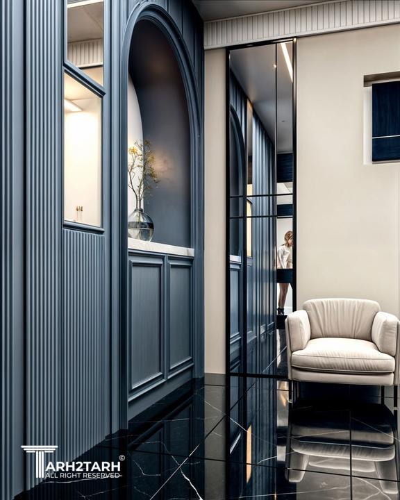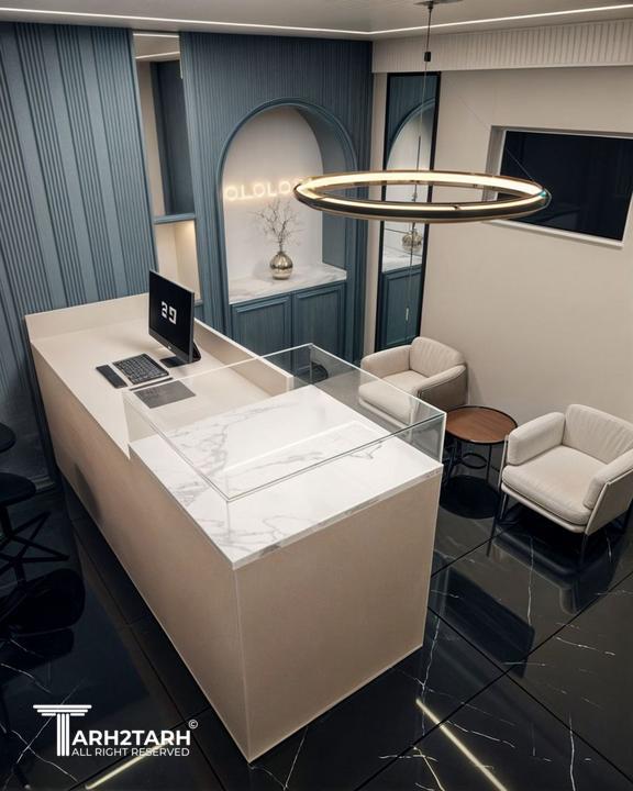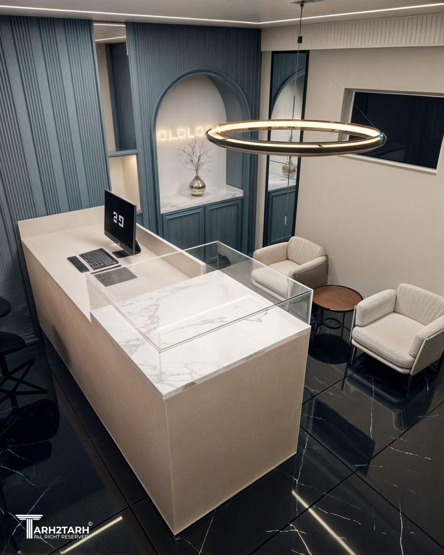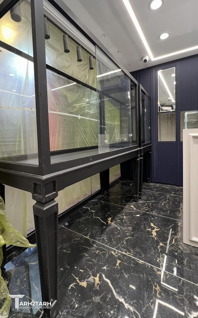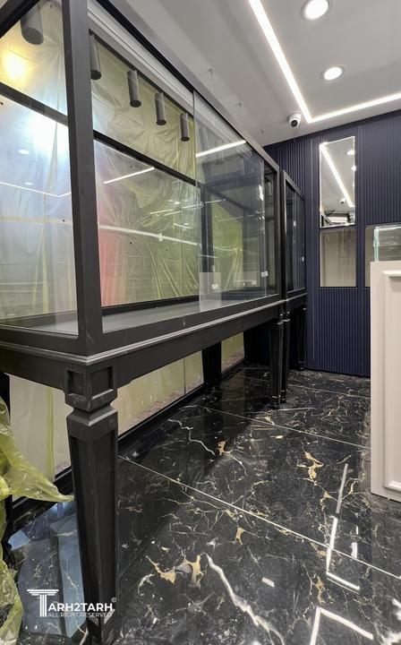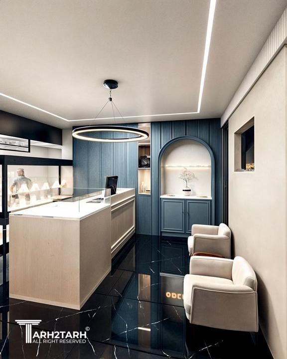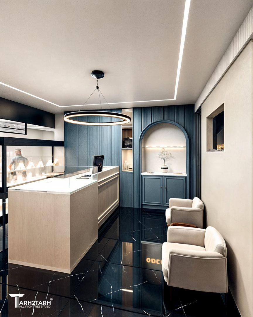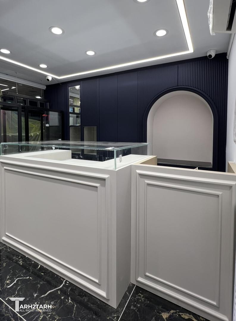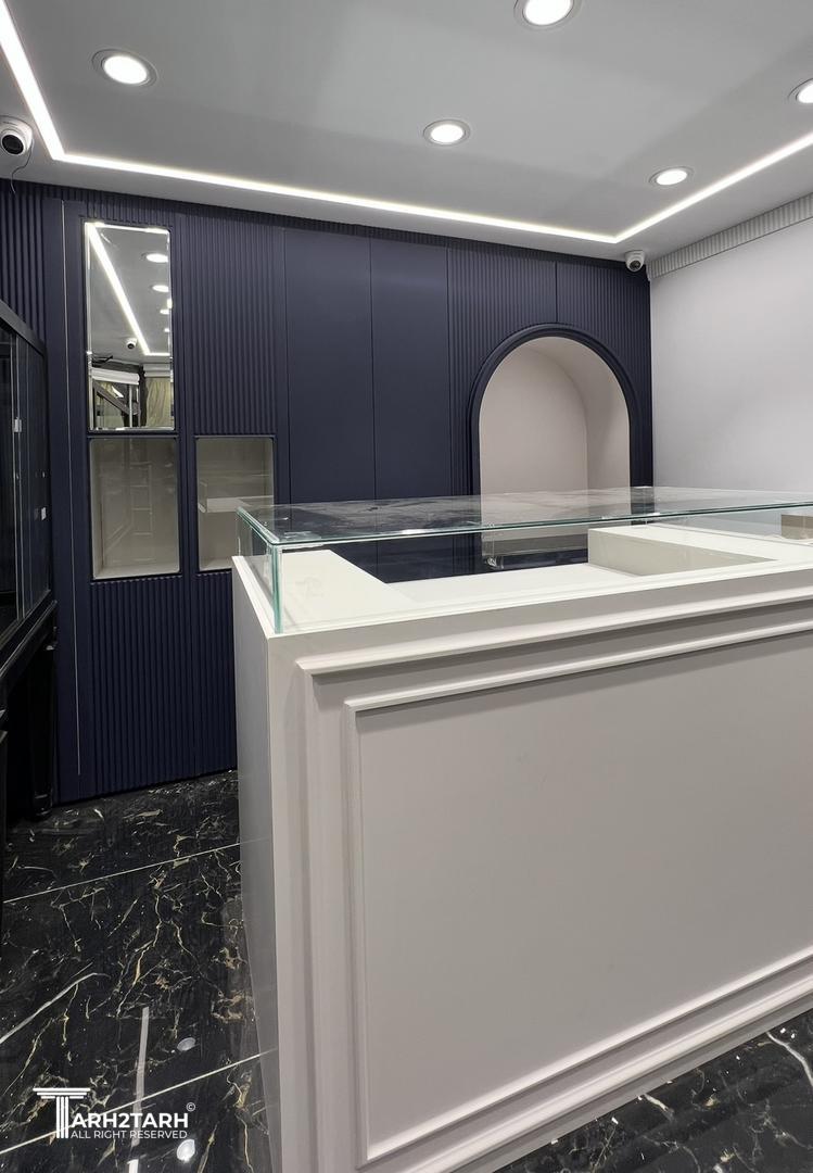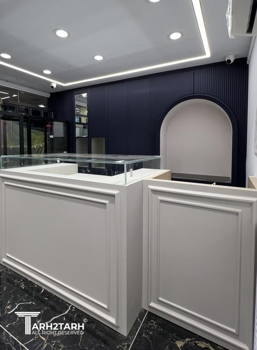 طراحی نئوکلاسیک با جزییات کم بدلیل ابعاد فروشگاه و استفاده از رنگ غالب سرمه ای بعنوان رنگ سازمانی مجموعه