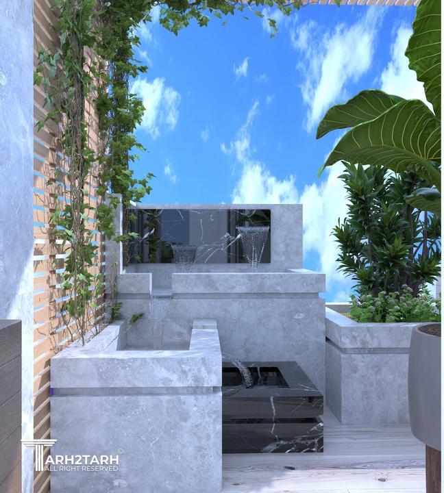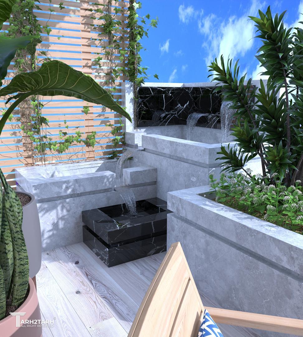 طراحی تراس به سبک مدرن تلفیق گیاه و آب و چوب برای ایجاد حس طبیعت
