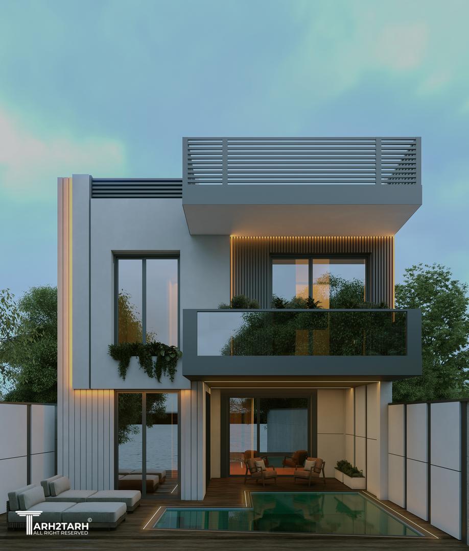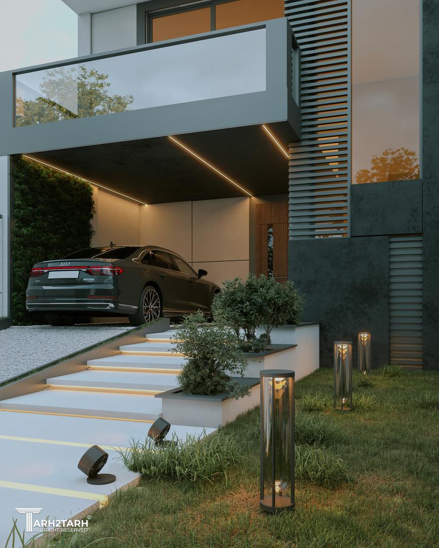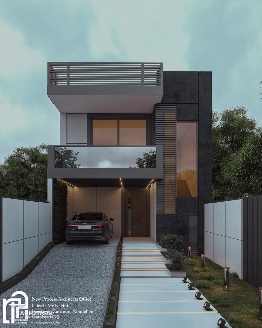 پروژه ویلای نائینی در زمینی واقع در منطقهای کریتون رودهن طراحی شده و شامل دو طبقه مسکونی میباشد. فرم کلی بنا با ترکیب احجام ساده و خطوط افقی شکل گرفته و ورودی ساختمان از طریق مسیری مدرن و نورپردازیشده به سمت لابی و پارکینگ مسقف هدایت میشود.