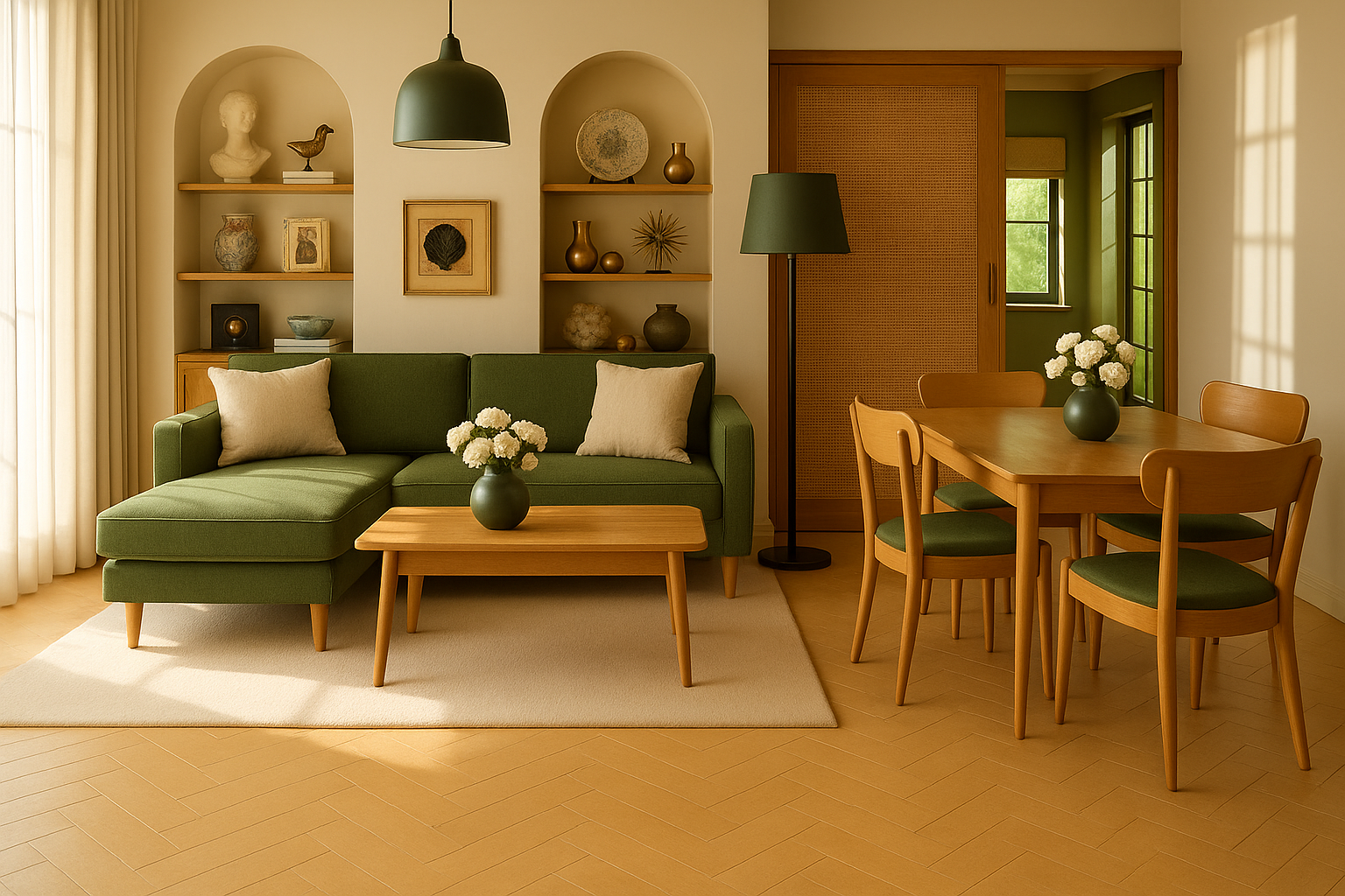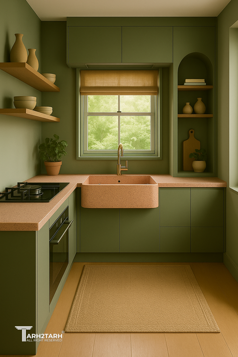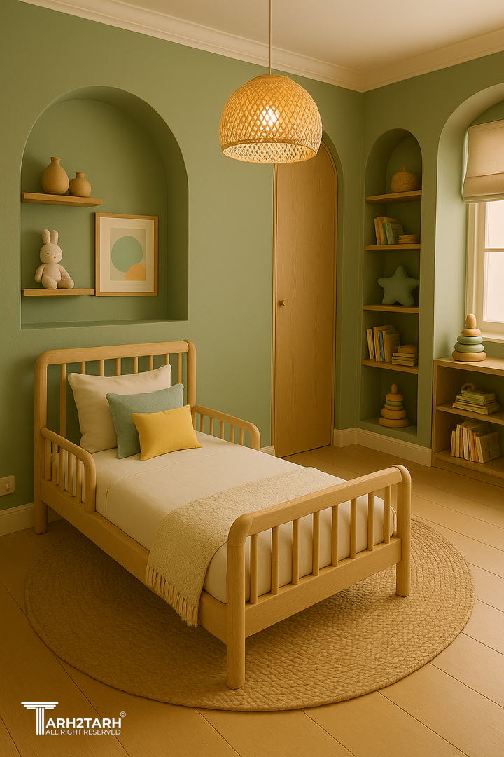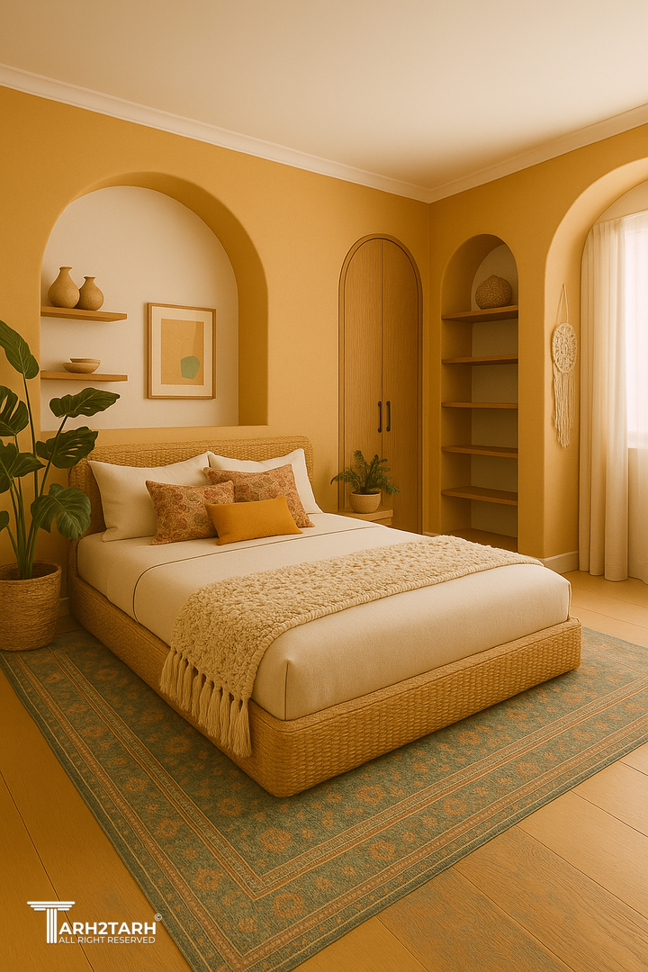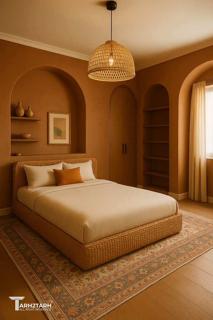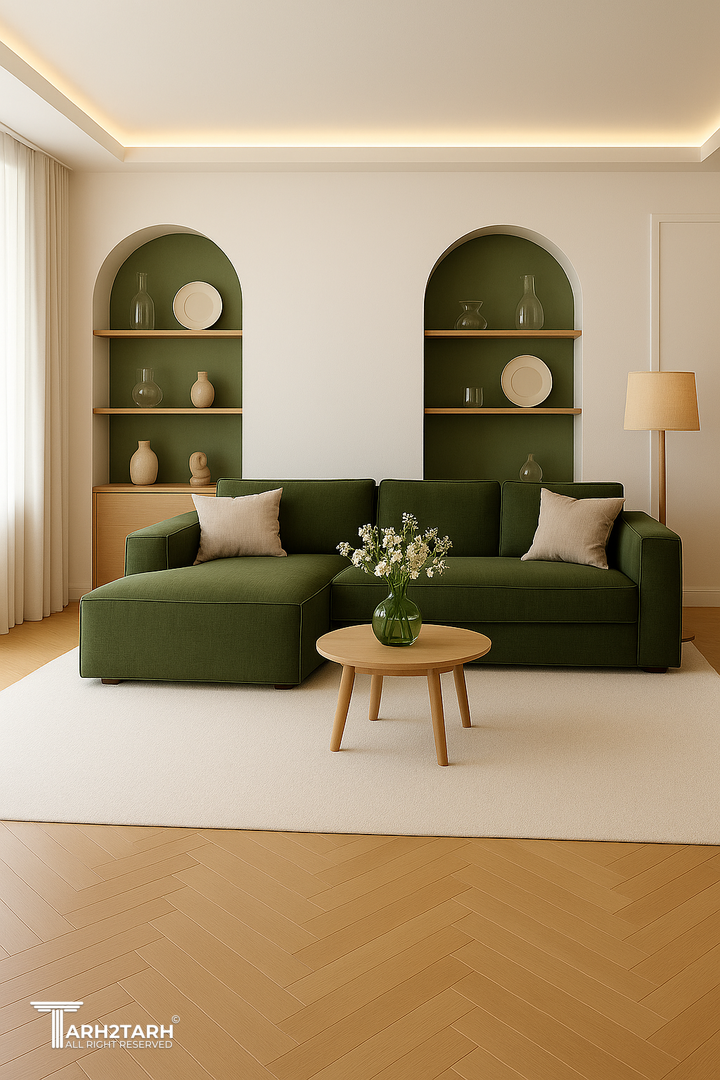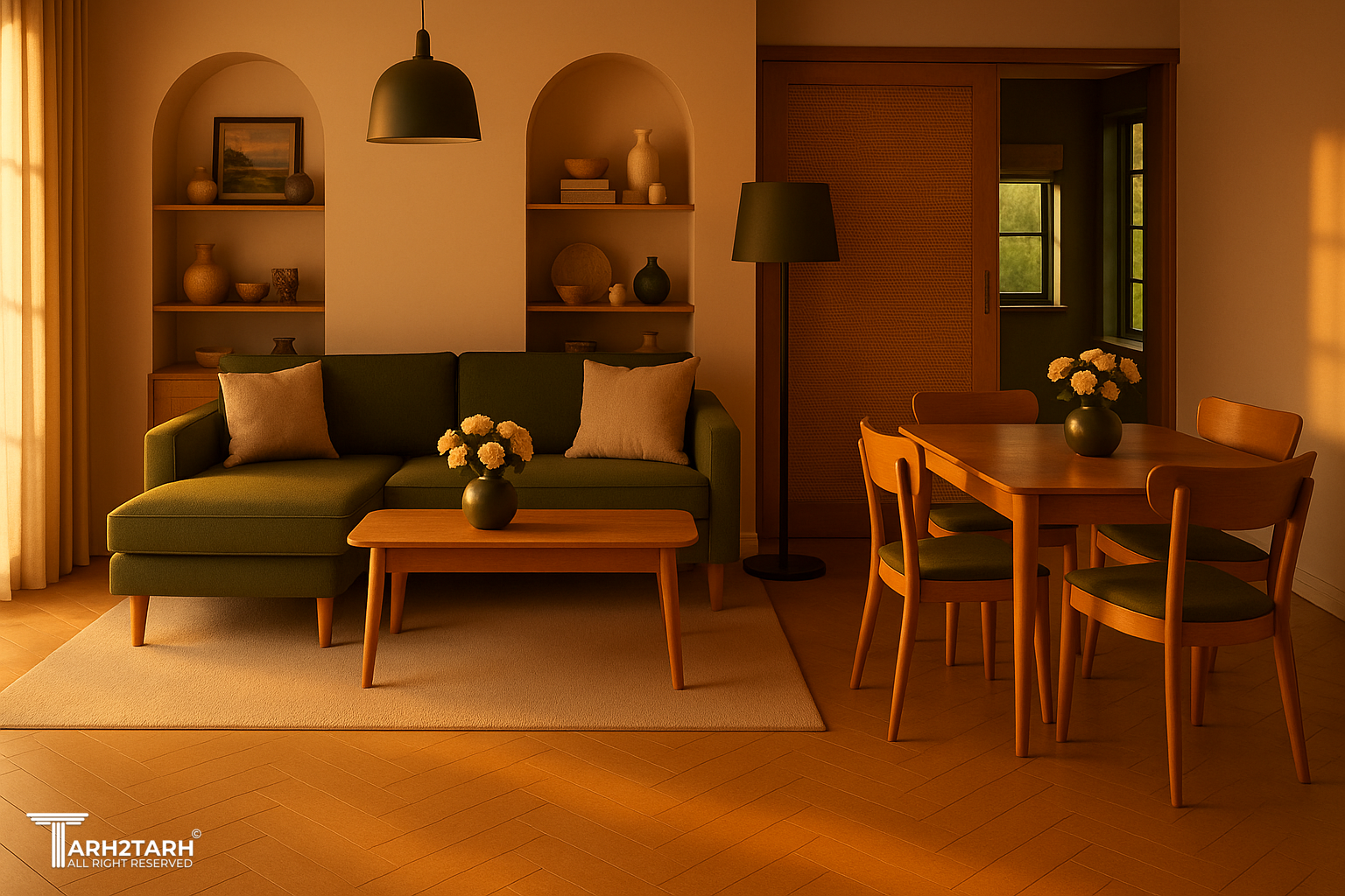 «طراحی داخلی گرم و مینیمال با ترکیب رنگهای طبیعی، قوسهای معماری، چوبهای روشن، مبلمان هماهنگ و هارمونی کامل میان اتاقخواب، حمام، آشپزخانه و نشیمن.»
