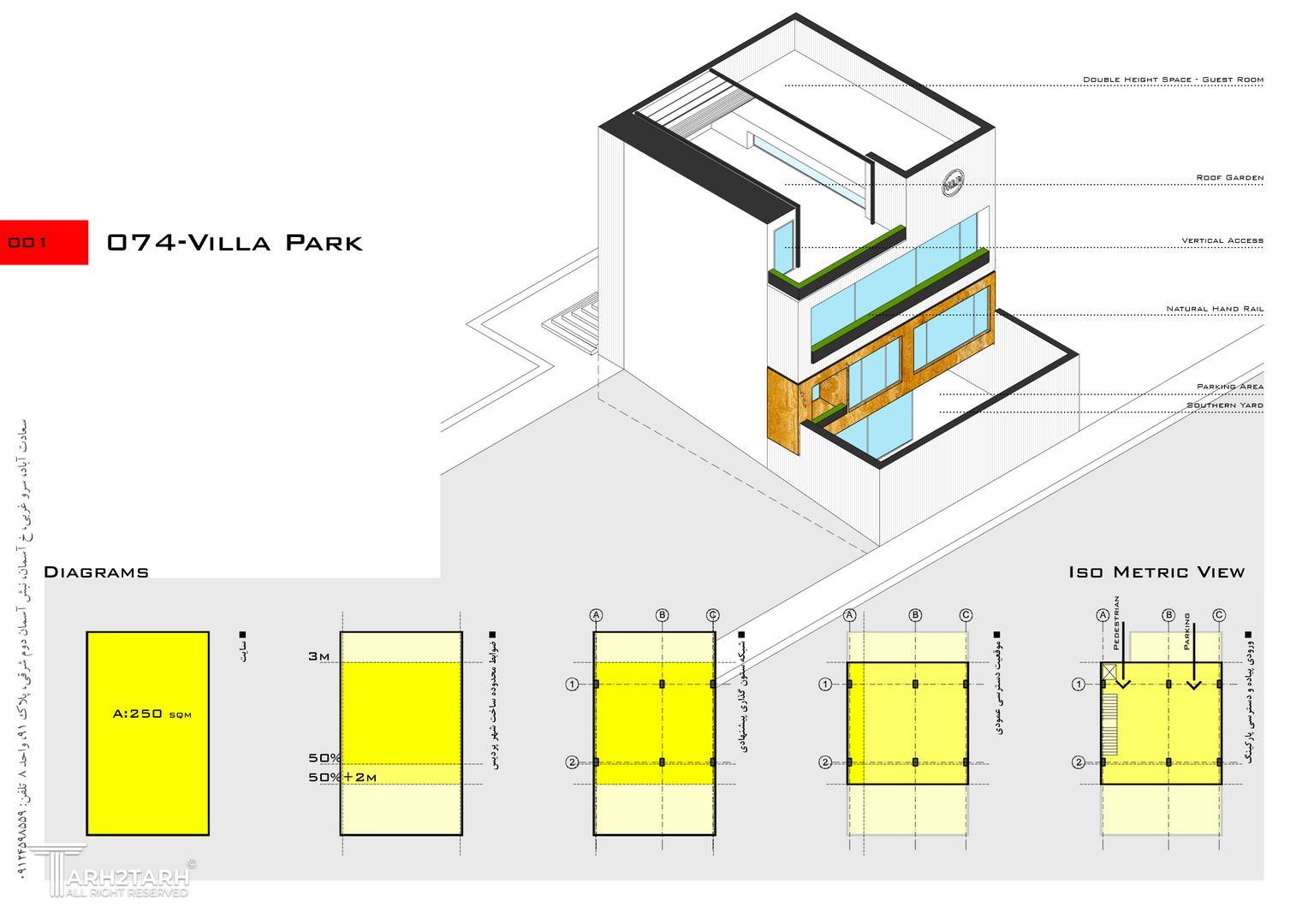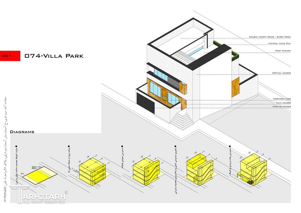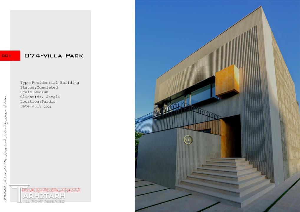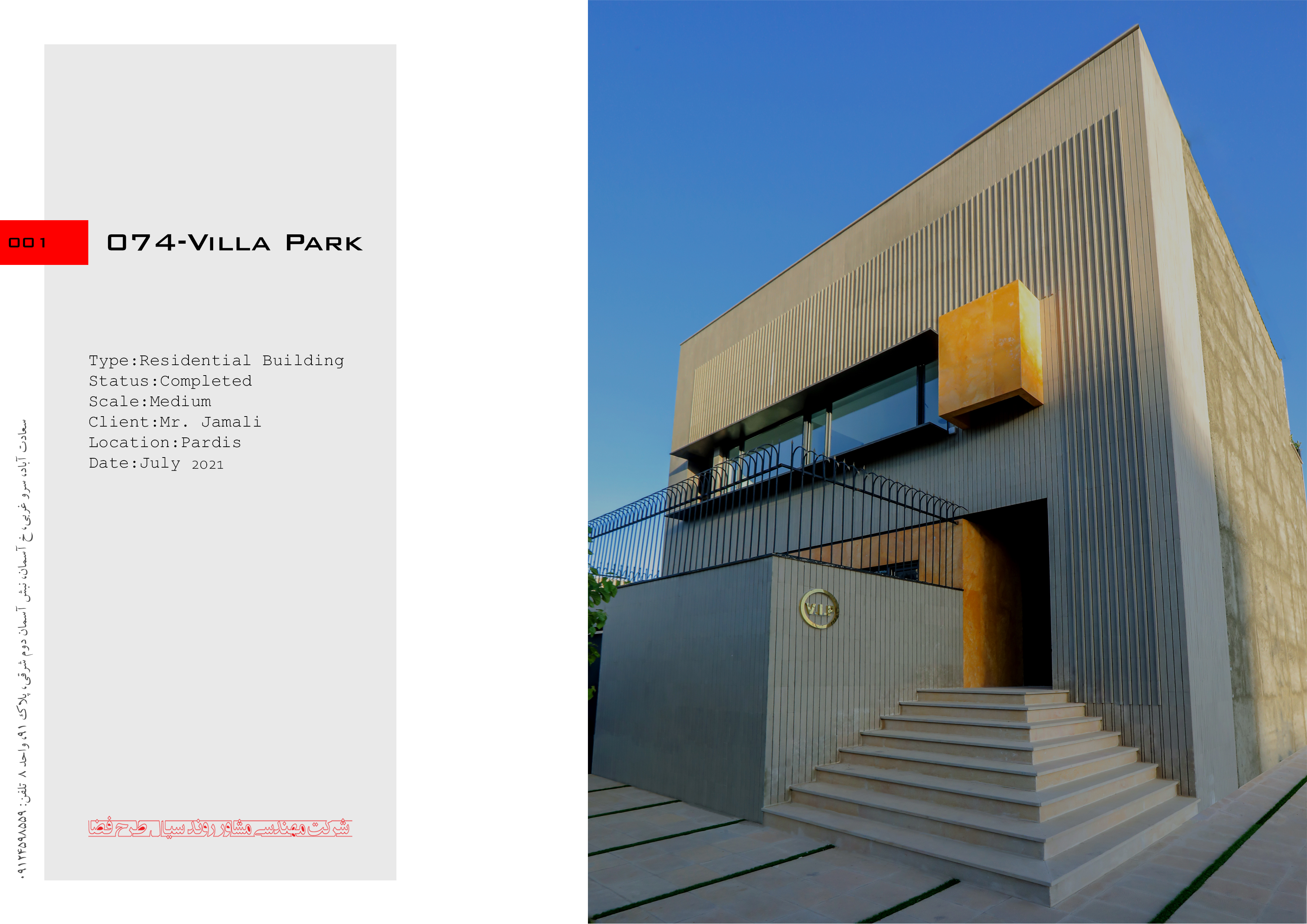 خانه ویلا پارک یه ساختمان دو طبقه در فاز 4 پردیس است که برای زندگی یک خانوار 5 نفره روبروی بوستان امام رضا ساخته شده است. چالش اصلی ما در این پروژه چیدمان دانه بندی عملکردهای داخلی پروژه بود که علاوه بر نمایش بهترین ترکیب چیدمان عملکردی، تاثیری بصری قابل قبولی نیز در نما و حجم ساختمان داشته باشد. و حجم گویای اهمیت عملکردها بوده و برآورده کننده نیازهای عملکردی داخل فضا باشد.