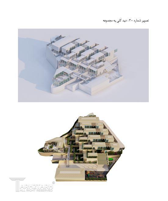 در مرحله اولیه، جنبه حیاتی طراحی یک هتل بوتیک با کیفیت بالا، حصول اطمینان از دارا بودن ویژگیهایی است که آن را نه تنها به مکانی برای استراحت و اقامت، بلکه به مقصدی برای مسافران تبدیل کند. این نشان دهنده عملکرد اصلی یک موسسه تعیین شده به عنوان هتل بوتیک است. پس از بررسی محل پروژه، تصمیم گرفته شد که طراحی و ویژگیهای مورد نیاز باید از خود زمینه بیرون بیاید و از تحمیل یا اضافه کردن یک سازه بیگانه به بافت اجتناب شود. در عوض، باید بدنه موجود را با شکلی معاصر و در خدمت نیازهای مداوم جامعه شکل دهد. برای دستیابی به این هدف، خانههای سنتی محله شمیران از دیدگاههای مختلف مورد مطالعه قرار گرفت و انتخاب فرم، جزئیات و تکنیکهای ساخت از این منابع گرفته شد. این مجموعه شامل اتاقهای مجزایی است که به طرز پیچیدهای در جریان و تداوم بافت محلی بافته شدهاند و از خانههای "زگالی" الهام گرفته شدهاند. این خانهها دارای قاب چوبی، خشت، زاگال یا چوب استفاده نشده، دیوارهای برشی بتن مسلح و سقفهای خرپایی هستند. مسیرهایی که از فضاهای مختلف عبور میکنند، از کوچههای محلی الهام گرفته شدهاند و حرکت را در سطوح مختلف ارتفاعی ادامه میدهند و دسترسی به کیفیتهای متنوع را فراهم میکنند. واحدهای اقامتی شامل چهار نوع چیدمان مختلف هستند که هر کدام دارای باغهای خصوصی در مقیاس کوچک هستند. علاوه بر این، این مجموعه شامل یک زمین بازی کودکان، یک رستوران، فضاهای عمومی و یک آمفی تئاتر روباز است.