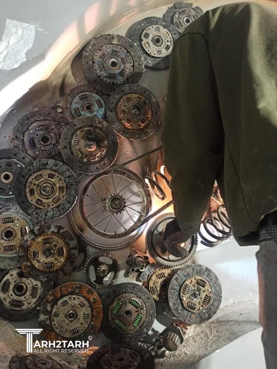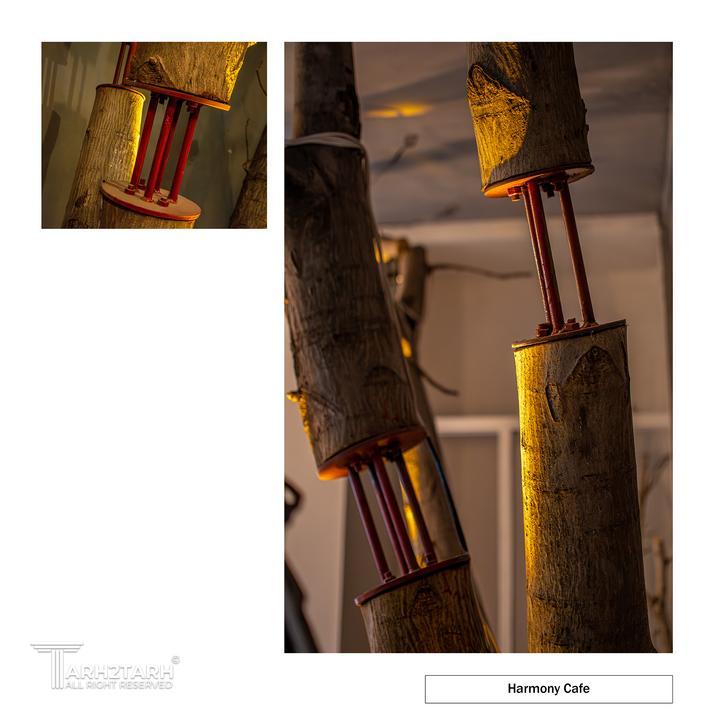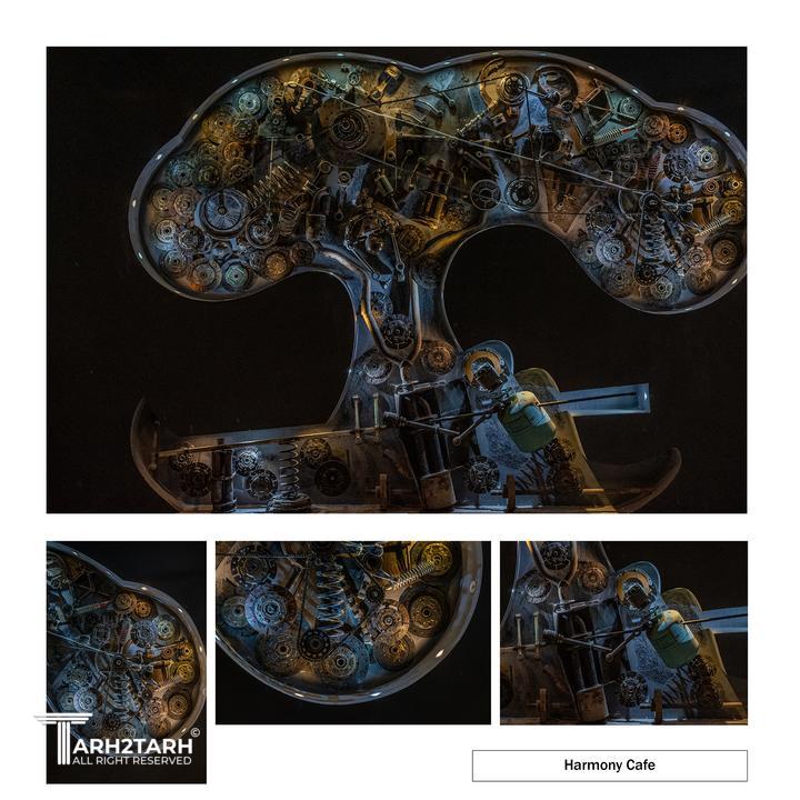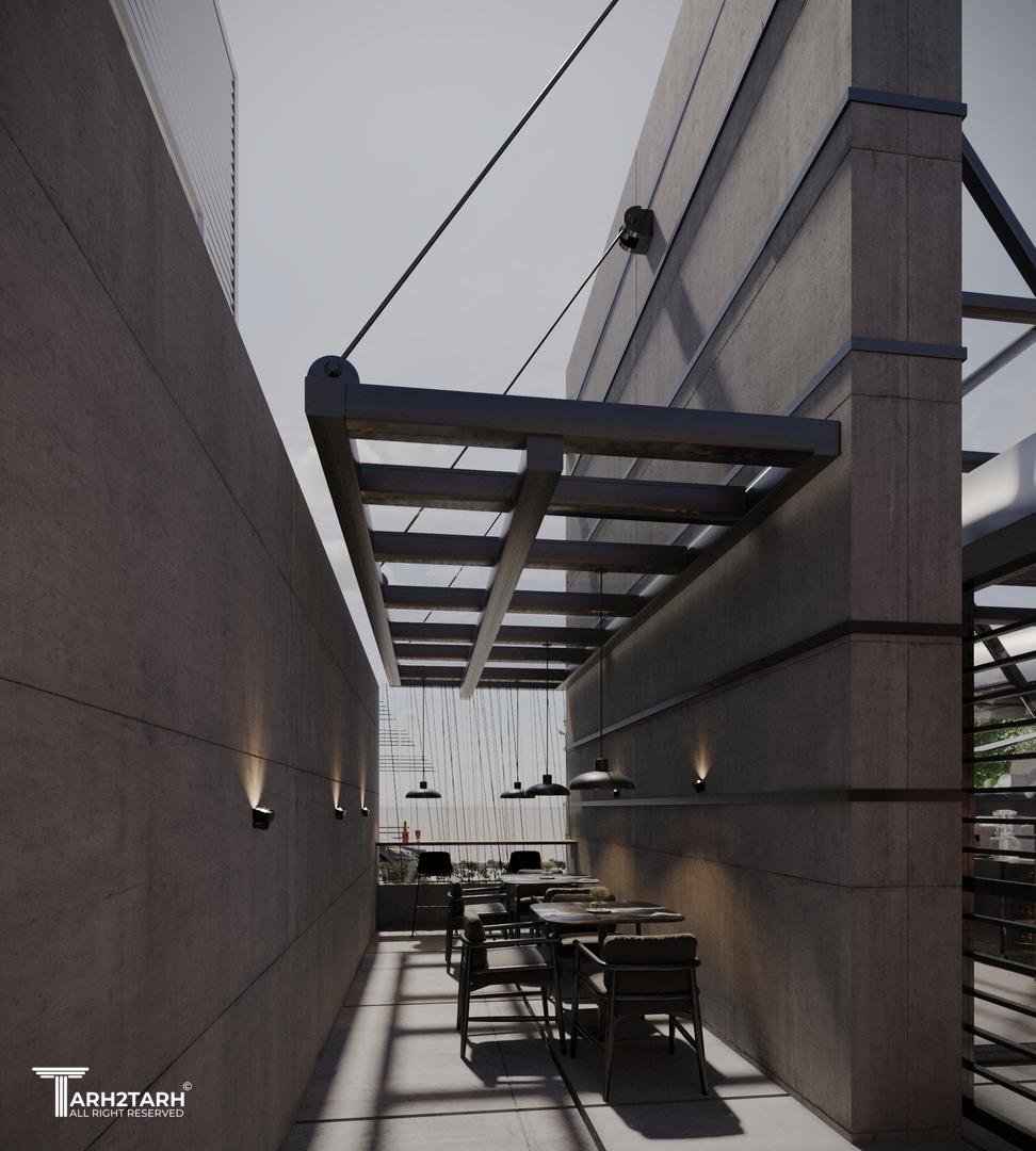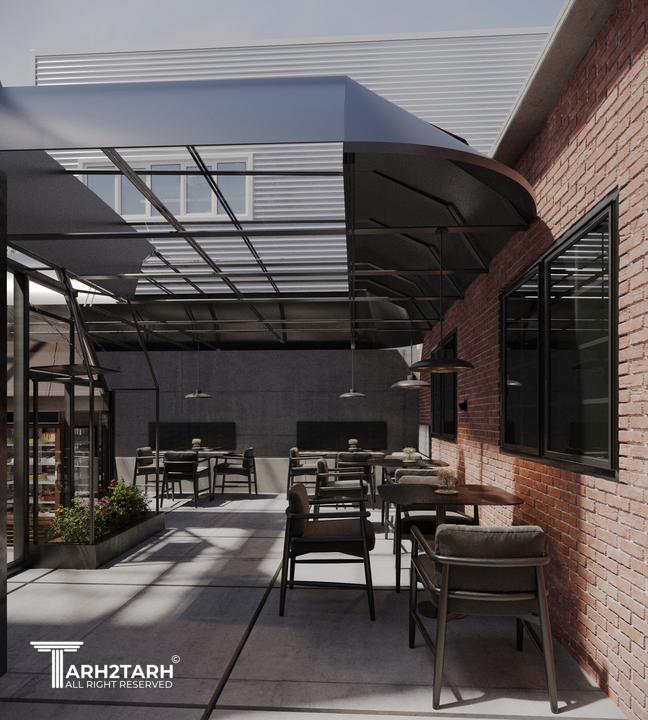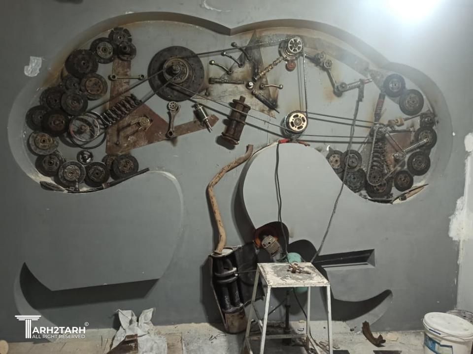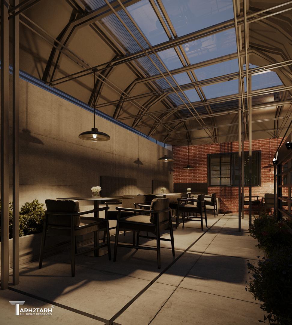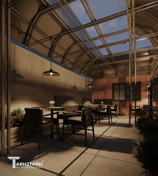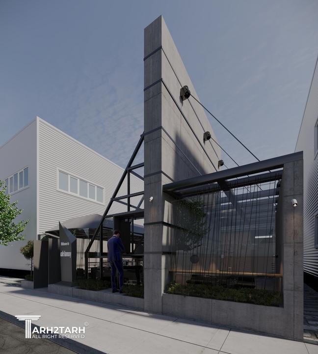 برای ایجاد تفاوت با بافت زمینه خط آسمان متفاوتی با شکستگی مثلث گونه و دیوار بتنی ایجاد کردیم و سایبانی رو با کابل آویز کردیم و در طراحی داخلی از ضایعات خودرو برای اکسنت وال بهره گرفتیم و درخت خشکی را در سالن دیگه با مفصل فلزی از نو ساختیم و با میز چوبی پیوند زدیم