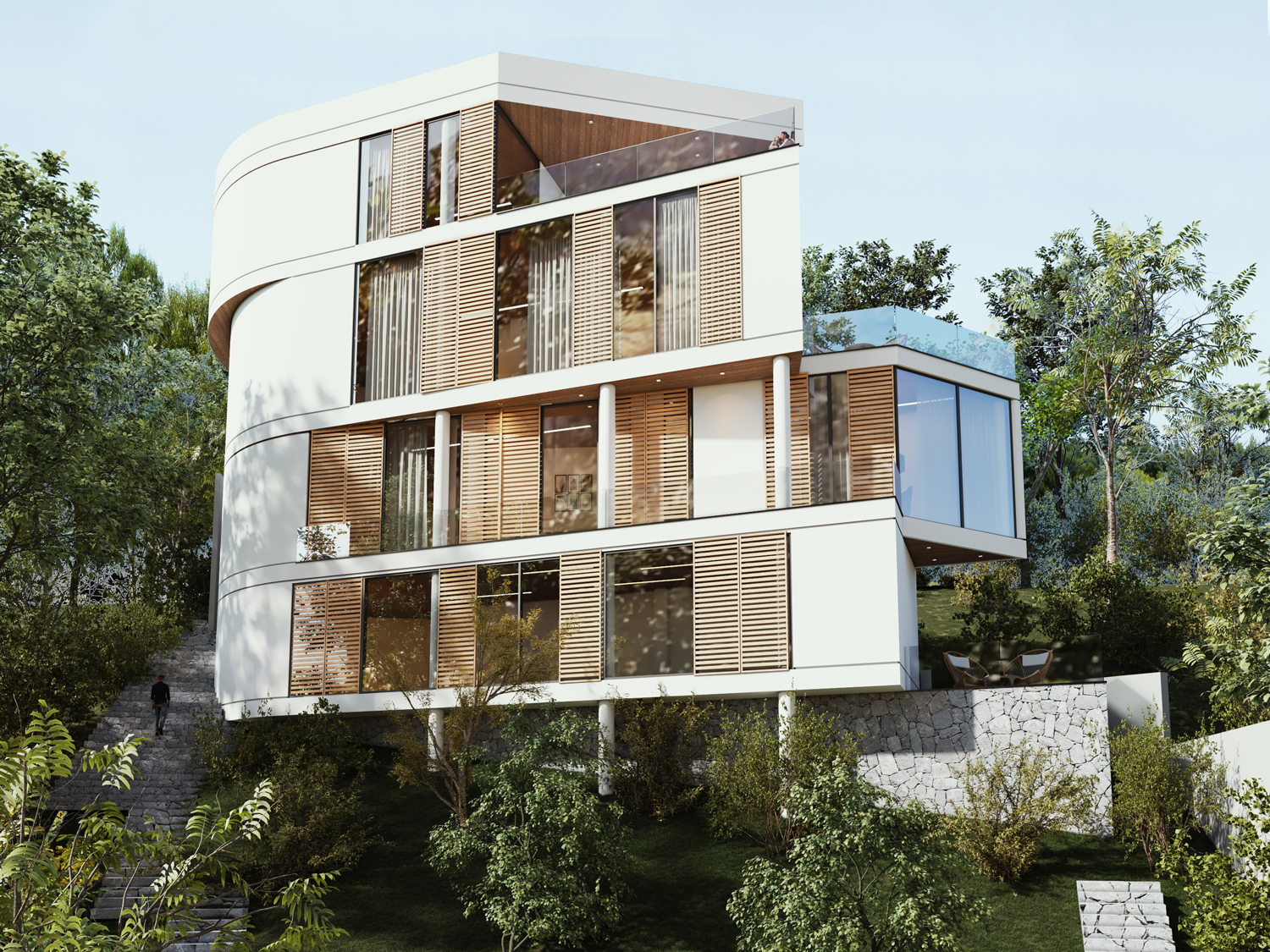 چالش طراحی خانه کلاچای جانمایی ساختمان در شیب 45 درجه با منظره ای رو به دره و باغهای مرکبات کلاچای است