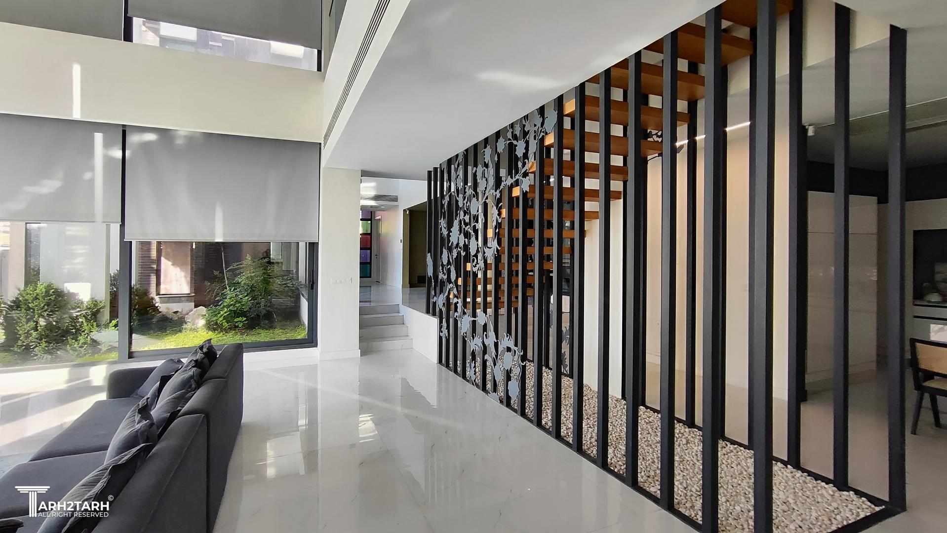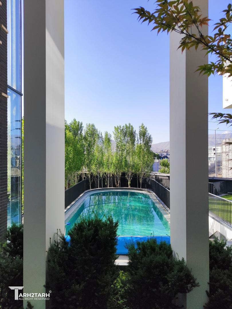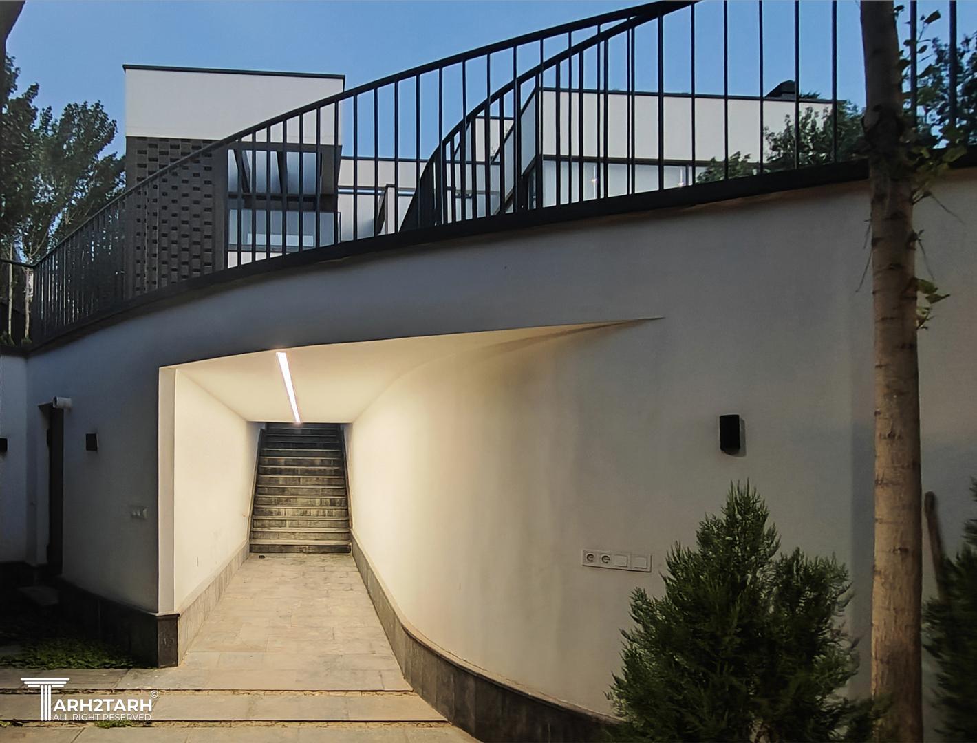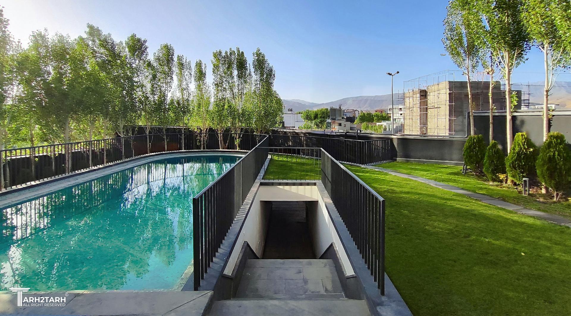 خانه "رخ" در قطعه زمینی از یک شهرک مسکونی در منطقه گیلاوند طراحی و اجرا شده است. بر اساس نیاز کاربر، هدف اصلی پروژه خلق فضایی برای سکونت فصلی و آرامش خانوادگی بود که بتواند در عین عملکردگرایی، واجد تنوع و کیفیتهای فضایی معاصر، ارتباط مؤثر با طبیعت و خوانایی حجمی باشد. پلان خانه در 4 طبقه شکل گرفته و به گونهای طراحی شده که تفکیک مشخصی بین فضاهای عمومی و خصوصی ایجاد شود.الگوی فضایی پروژه با توجه به نیازهای اقلیمی و عملکردی، مبتنی بر تفکیک عملکردها و در عین حال ایجاد ارتباط منطقی بین آنها تنظیم شده است. حجم پروژه با رویکردی پویا و تخلخلیافته شکل گرفته تا علاوهبر ایجاد فضاهای نیمهباز و سایهدار، به جریان طبیعی نور، باد و منظر اجازه عبور دهد. پیشآمدگیها، عقبنشستگیها و قابهای خالیشده در توده بنا نهتنها فرم را متنوع کردهاند، بلکه با درگیری بیشتر با فضای سبز، کیفیت اقلیمی مناسبی نیز فراهم آوردهاند. حیاط شمالی خانه شامل استخر روباز، درختان کاشتهشده در امتداد دیوارها و چمنکاری منظم است. استخر به عنوان عنصر محوری طراحی منظر، در امتداد محور دید سالن نشیمن قرار گرفته و پیوند بصری قوی بین داخل و خارج ایجاد میکند. استفاده از شکافهای حجمی، پنجرههای سرتاسری و متریالهای متخلخل، باعث شکلگیری سایهاندازهای پویا و متغیر در ساعات مختلف روز شده که به تجربهای زیباشناختی از فضا دامن میزند. پیرو علاقه کاربر به استفاده از المان های شناخته شده فرهنگ و هنر ایرانی ، راه پله اصلی ساختمان با برداشتی انتزاعی از نقش قالی سالاری تبریز طراحی شده است. همچنین در بدنه ی رو به شرق ساختمان شیشه های رنگی (ترکیب رنگ های ایرانی) نور طلوع خورشید را به فضای داخلی ساختمان بازتاب می کند.