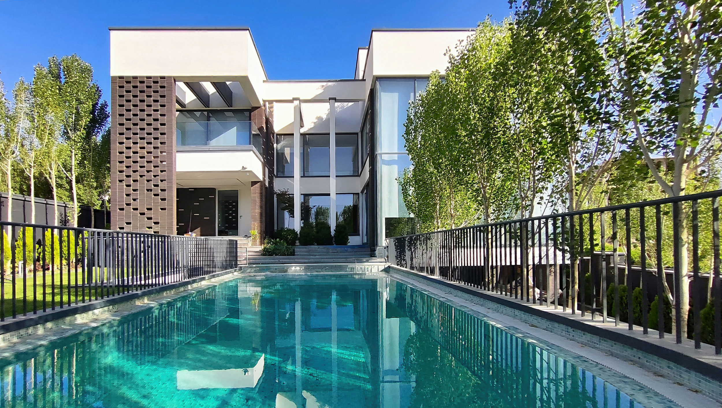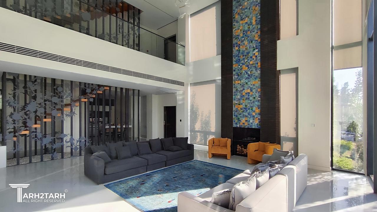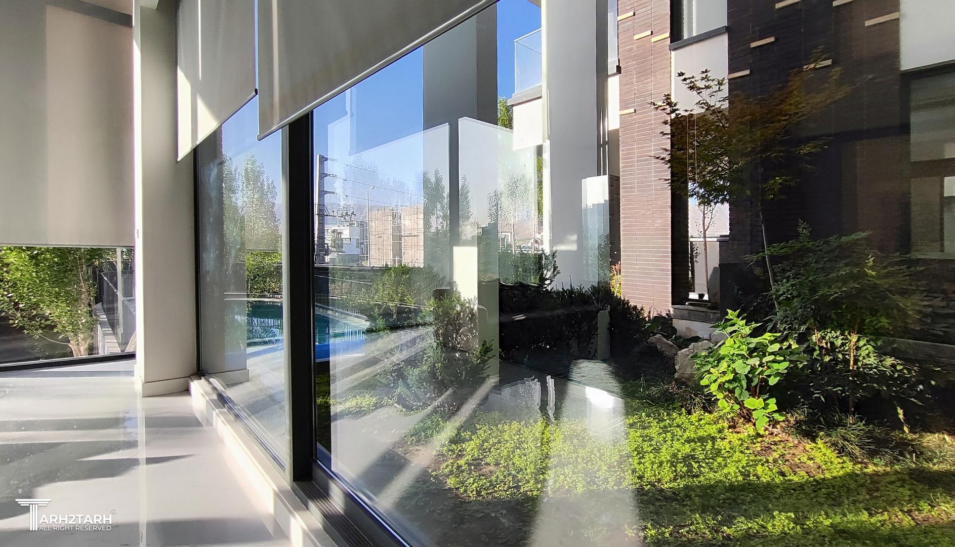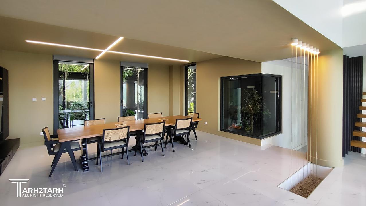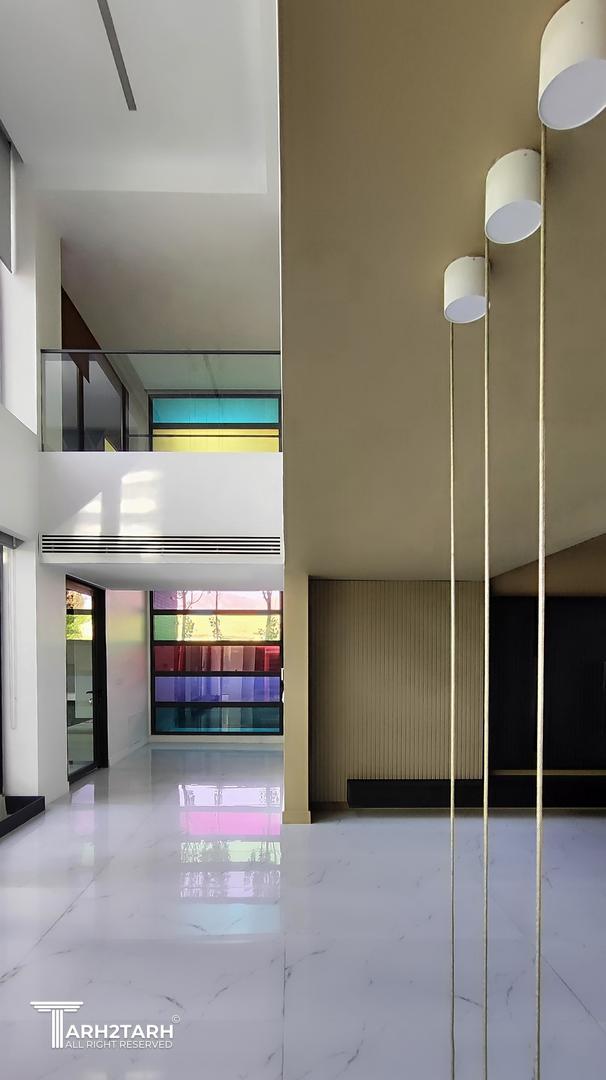 خانه "رخ" در قطعه زمینی از یک شهرک مسکونی در منطقه گیلاوند طراحی و اجرا شده است. بر اساس نیاز کاربر، هدف اصلی پروژه خلق فضایی برای سکونت فصلی و آرامش خانوادگی بود که بتواند در عین عملکردگرایی، واجد تنوع و کیفیتهای فضایی معاصر، ارتباط مؤثر با طبیعت و خوانایی حجمی باشد. پلان خانه در 4 طبقه شکل گرفته و به گونهای طراحی شده که تفکیک مشخصی بین فضاهای عمومی و خصوصی ایجاد شود.الگوی فضایی پروژه با توجه به نیازهای اقلیمی و عملکردی، مبتنی بر تفکیک عملکردها و در عین حال ایجاد ارتباط منطقی بین آنها تنظیم شده است. حجم پروژه با رویکردی پویا و تخلخلیافته شکل گرفته تا علاوهبر ایجاد فضاهای نیمهباز و سایهدار، به جریان طبیعی نور، باد و منظر اجازه عبور دهد. پیشآمدگیها، عقبنشستگیها و قابهای خالیشده در توده بنا نهتنها فرم را متنوع کردهاند، بلکه با درگیری بیشتر با فضای سبز، کیفیت اقلیمی مناسبی نیز فراهم آوردهاند. حیاط شمالی خانه شامل استخر روباز، درختان کاشتهشده در امتداد دیوارها و چمنکاری منظم است. استخر به عنوان عنصر محوری طراحی منظر، در امتداد محور دید سالن نشیمن قرار گرفته و پیوند بصری قوی بین داخل و خارج ایجاد میکند. استفاده از شکافهای حجمی، پنجرههای سرتاسری و متریالهای متخلخل، باعث شکلگیری سایهاندازهای پویا و متغیر در ساعات مختلف روز شده که به تجربهای زیباشناختی از فضا دامن میزند. پیرو علاقه کاربر به استفاده از المان های شناخته شده فرهنگ و هنر ایرانی ، راه پله اصلی ساختمان با برداشتی انتزاعی از نقش قالی سالاری تبریز طراحی شده است. همچنین در بدنه ی رو به شرق ساختمان شیشه های رنگی (ترکیب رنگ های ایرانی) نور طلوع خورشید را به فضای داخلی ساختمان بازتاب می کند.