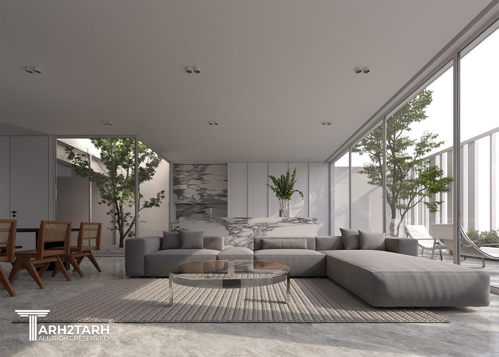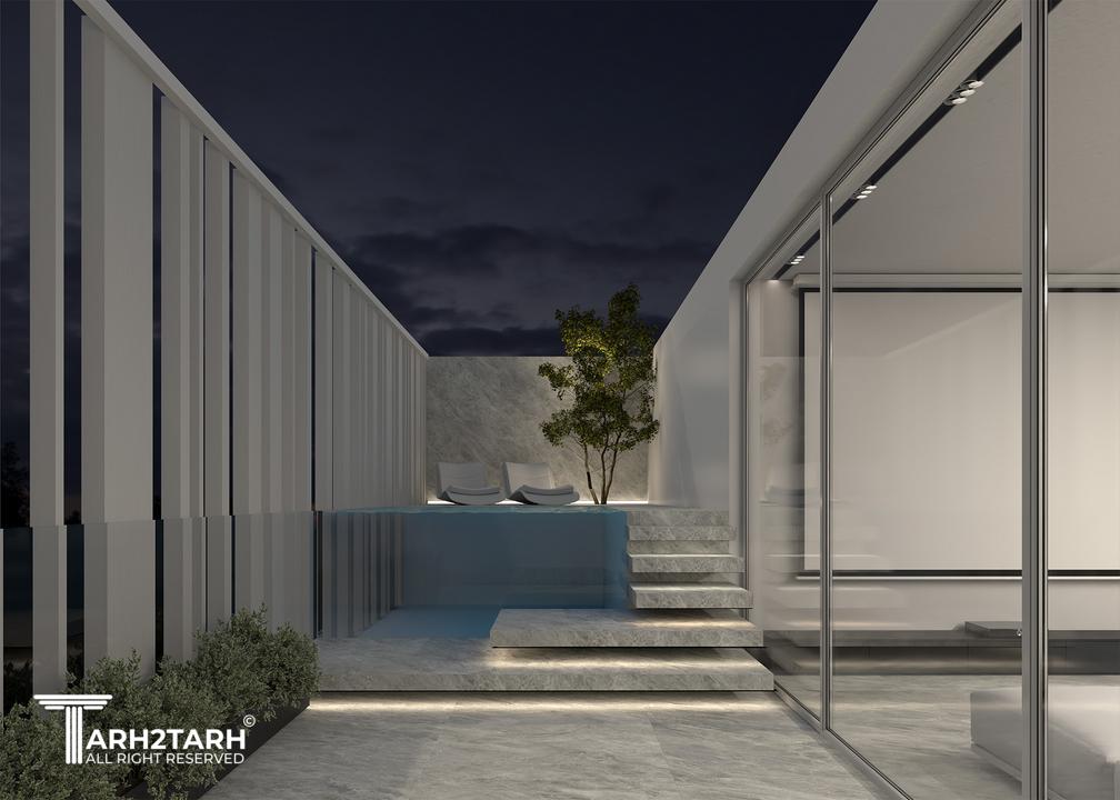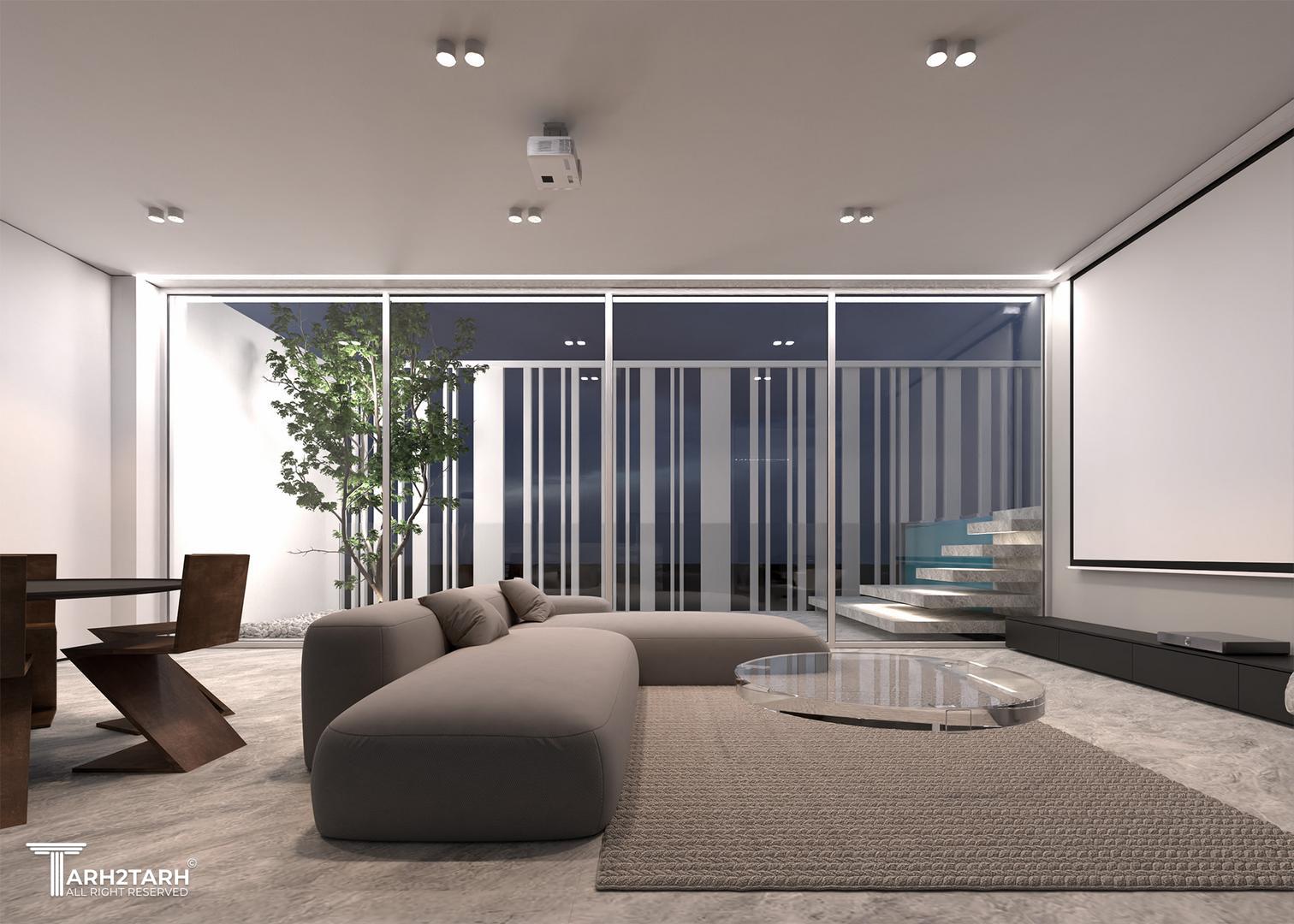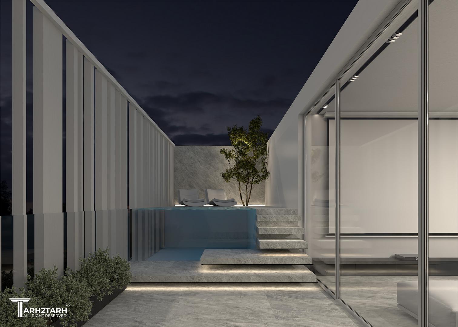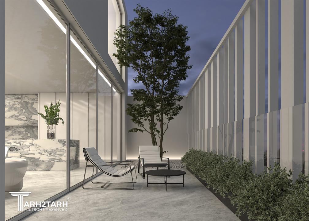 هدف طراحی دو واحد بوده که هر کدام از واحدها حس یک خانه ویلایی رو تداعی کنه. پس با چرخش دو واحد روی هم تراس هایی ایجاد شدند که مسقف نباشن و حس یک حیاط کوچک را بدهد. برای استفاده بهتر و راحتتر از تراس لوورهای باز شونده ای طراحی شده ک برای حس محرمیت بیشتر بشه از اون استفاده کرد.