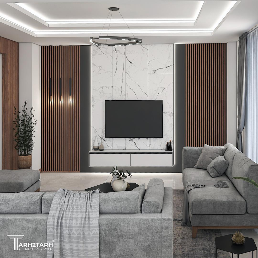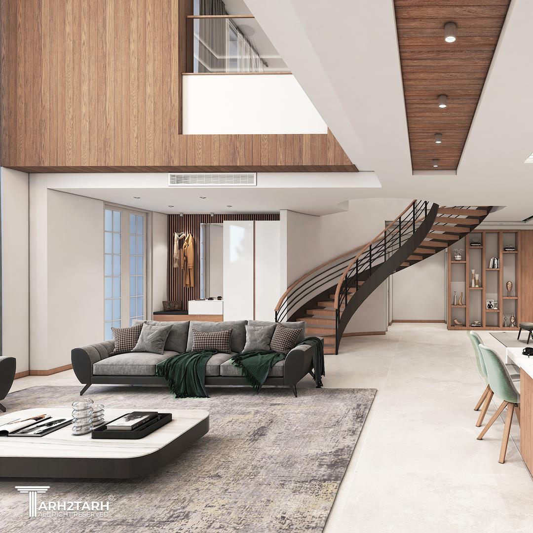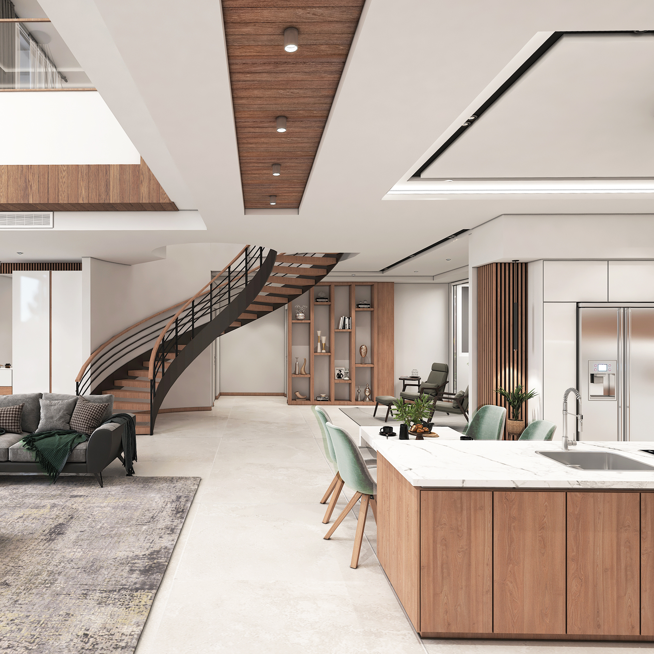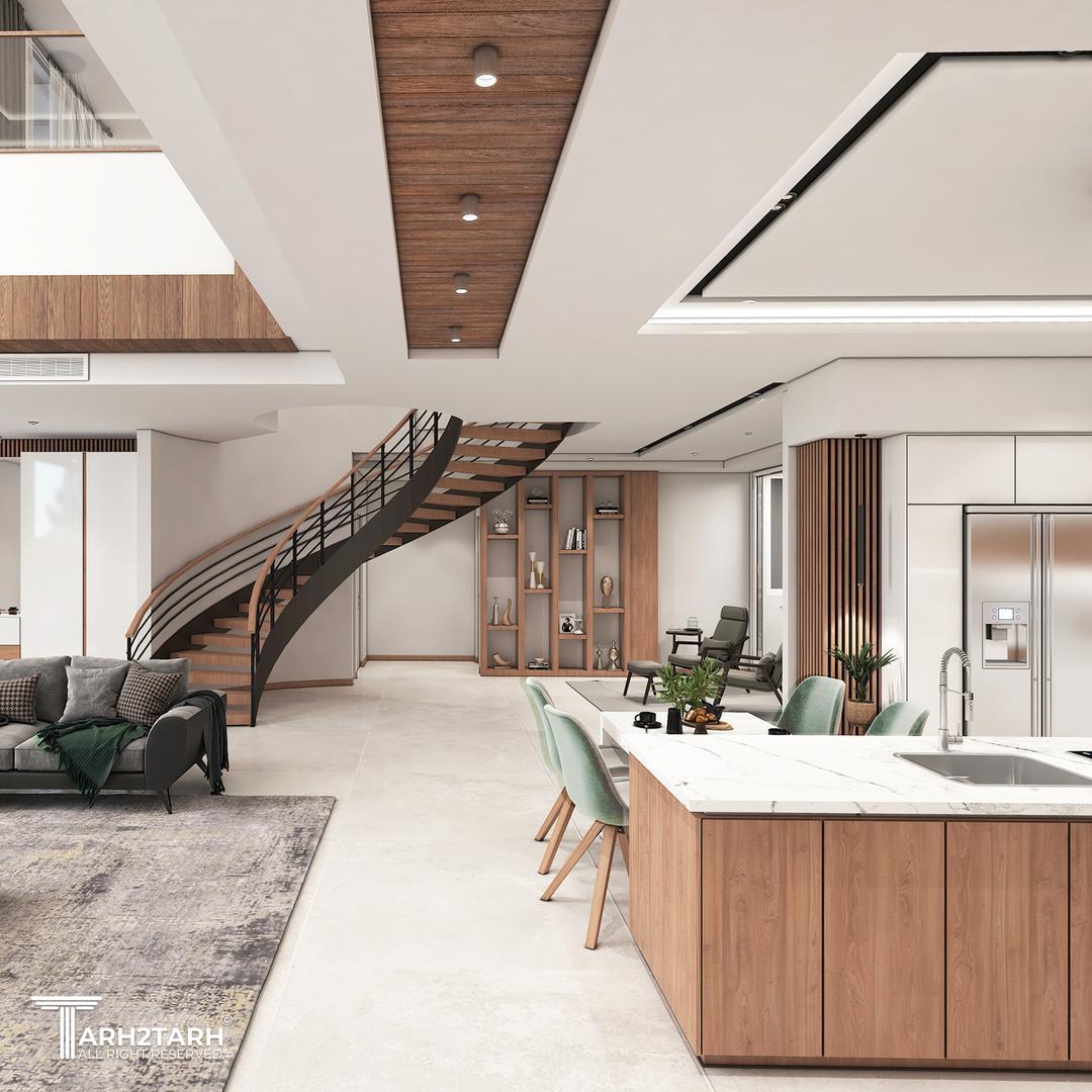 کانسپتهای اصلی طراحی فضای باز طراحی یکپارچه بین نشیمن آشپزخانه و فضای راهپله دیوارهای جداکننده حذف شده و این باعث میشه فضا بزرگتر و روشنتر حس بشه استفاده از چوب طبیعی چوب بهصورت گسترده در سقف دیوارها کابینتها و قفسهها استفاده شده این متریال گرم در تضاد با کف و دیوارهای روشن فضای خیلی دلنشین و مدرن ساخته پله منحنی پلهی شناور با نرده فلزی مشکی نقطهی کانونی این فضاست این نوع پله هم شیکه و هم حس جریان و حرکت به محیط میده مینیمالیسم در مبلمان مبلمان ساده با رنگ خنثی خاکستری سبز ملایم انتخاب شده میز وسط کوتاه و سادهست تا فضا خلوت بمونه و تمرکز روی معماری باشه ترکیب رنگها پالت رنگی شامل سفید خاکستری روشن چوب قهوهای و سبز آرامشبخش این ترکیب هم مدرن و هم طبیعی حس میشه نورپردازی خطی و مخفی در سقف از نورهای خطی و هالوژن استفاده شده روشنایی یکنواخت و بدون لوستر پرزرقوبرق مناسب سبک مدرن طراحی آشپزخانه جزیرهای جزیرهی بزرگ با صفحه مرمر سفید صندلیهای سبز پاستلی هم کاربردی برای پختوپز و هم دکوراتیو برای مهمانپذیری اکسسوریها و قفسهبندی تزئینی سمت راست پله قفسههای توکار با وسایل دکوراتیو دیده میشه این باعث میشه فضا روح داشته باشه و خیلی خشک و مینیمال صرف نباشه