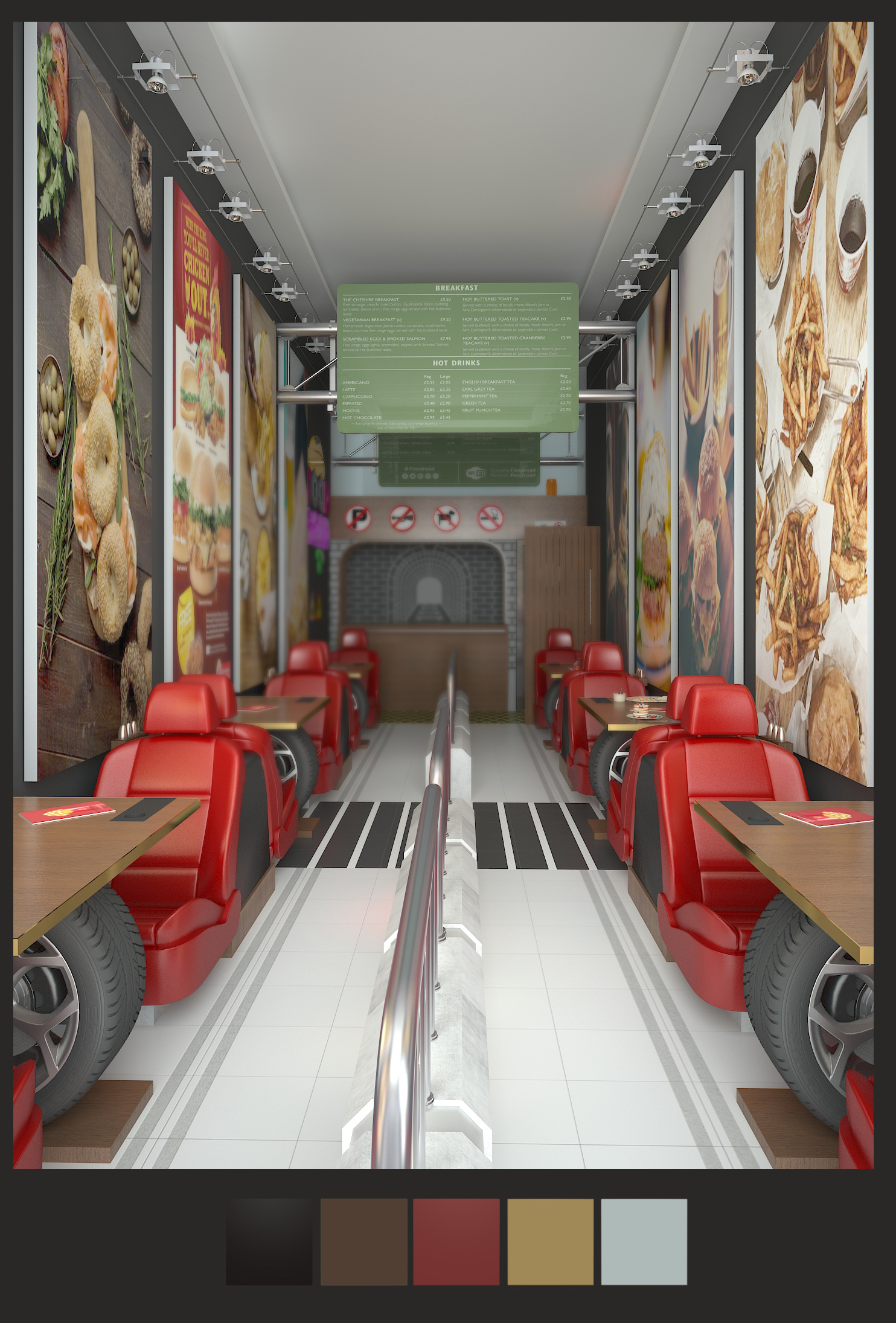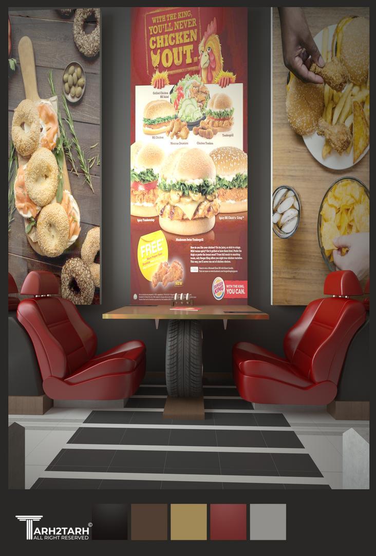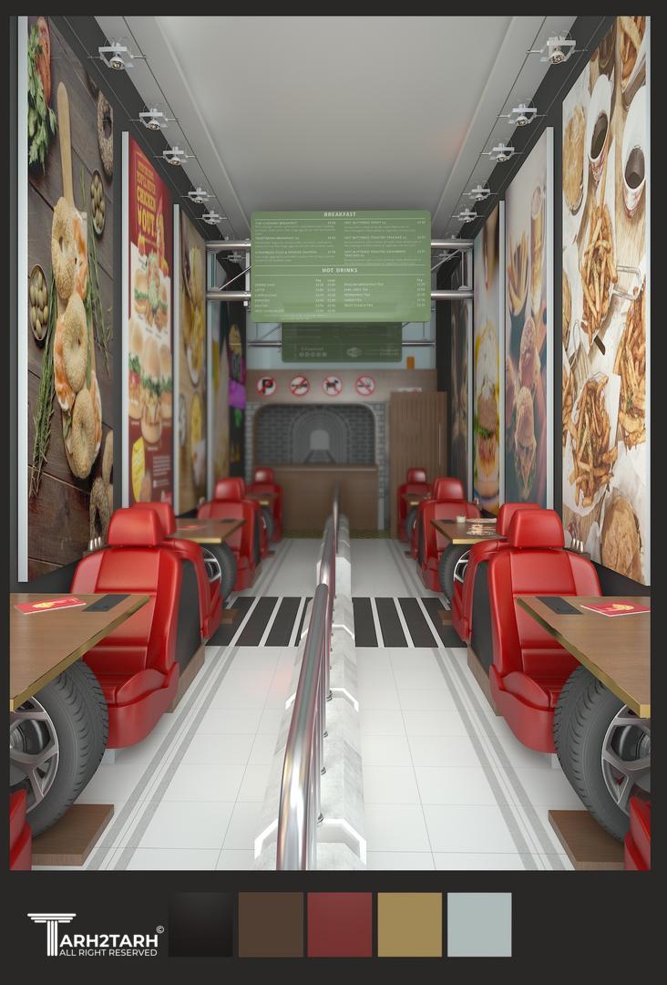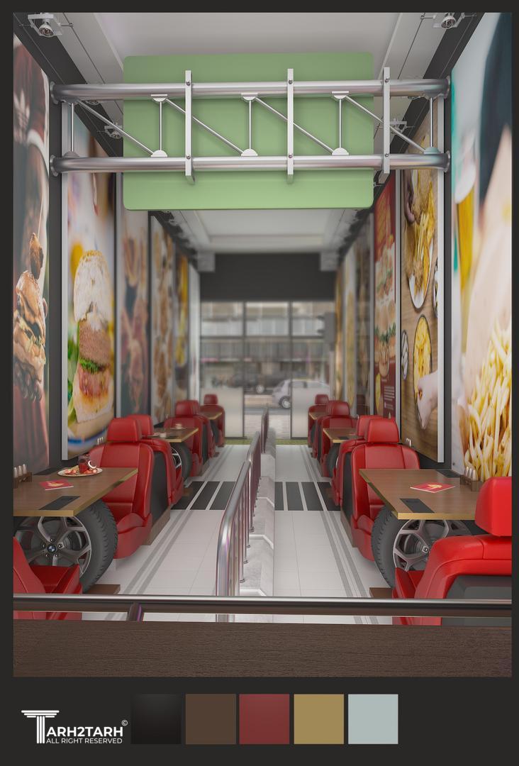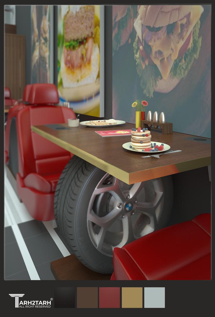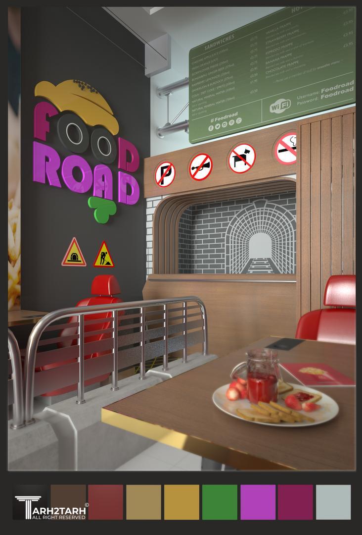رستورانی با حال و هوای یک بزرگراه که به تونل ختم میشه . ایده طراحی ما بر اساس یک راه و نقطه پایان بود. برای همین منظور تمام مبلمان نیز بصورت اختصاصی طراحی شده است