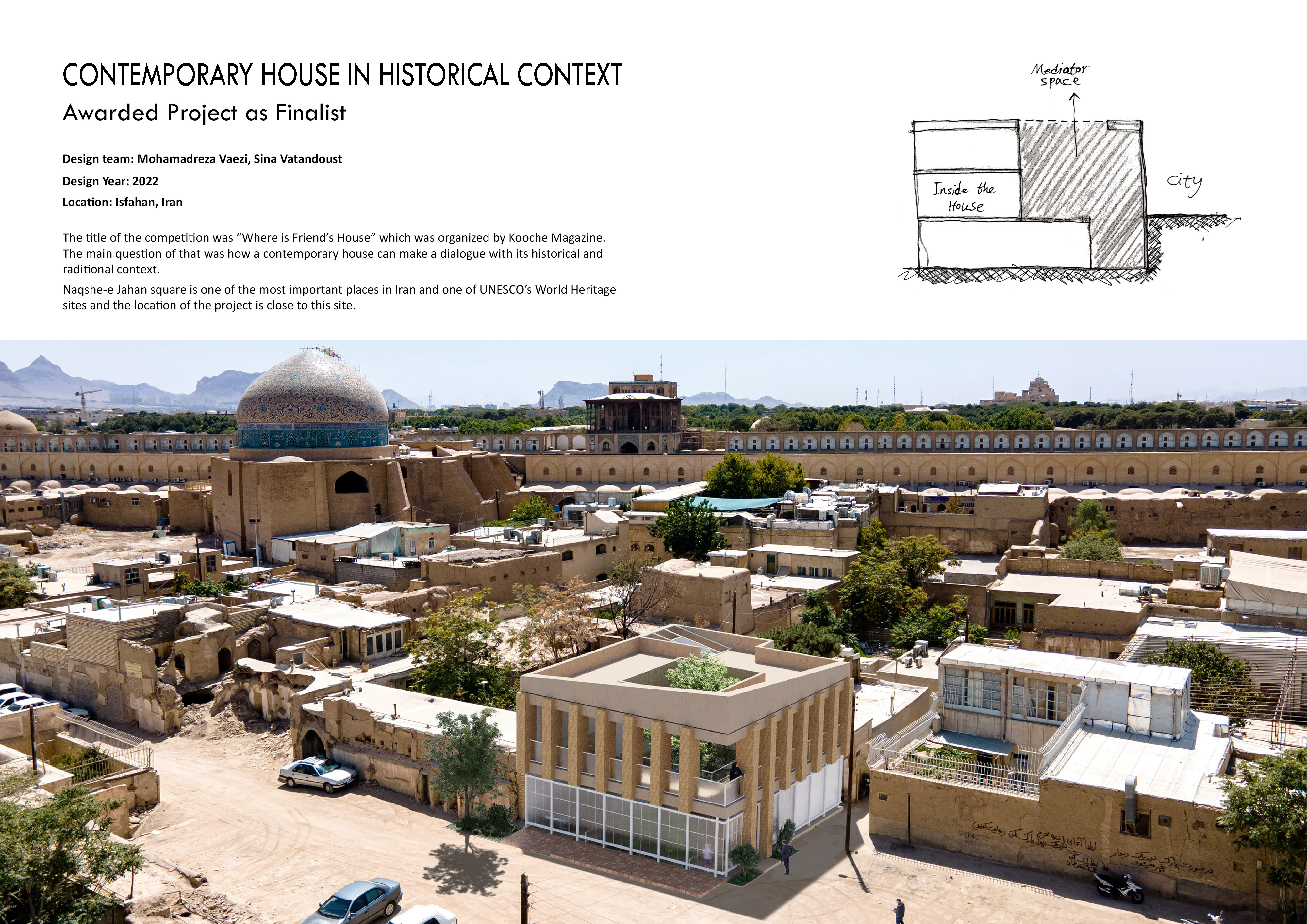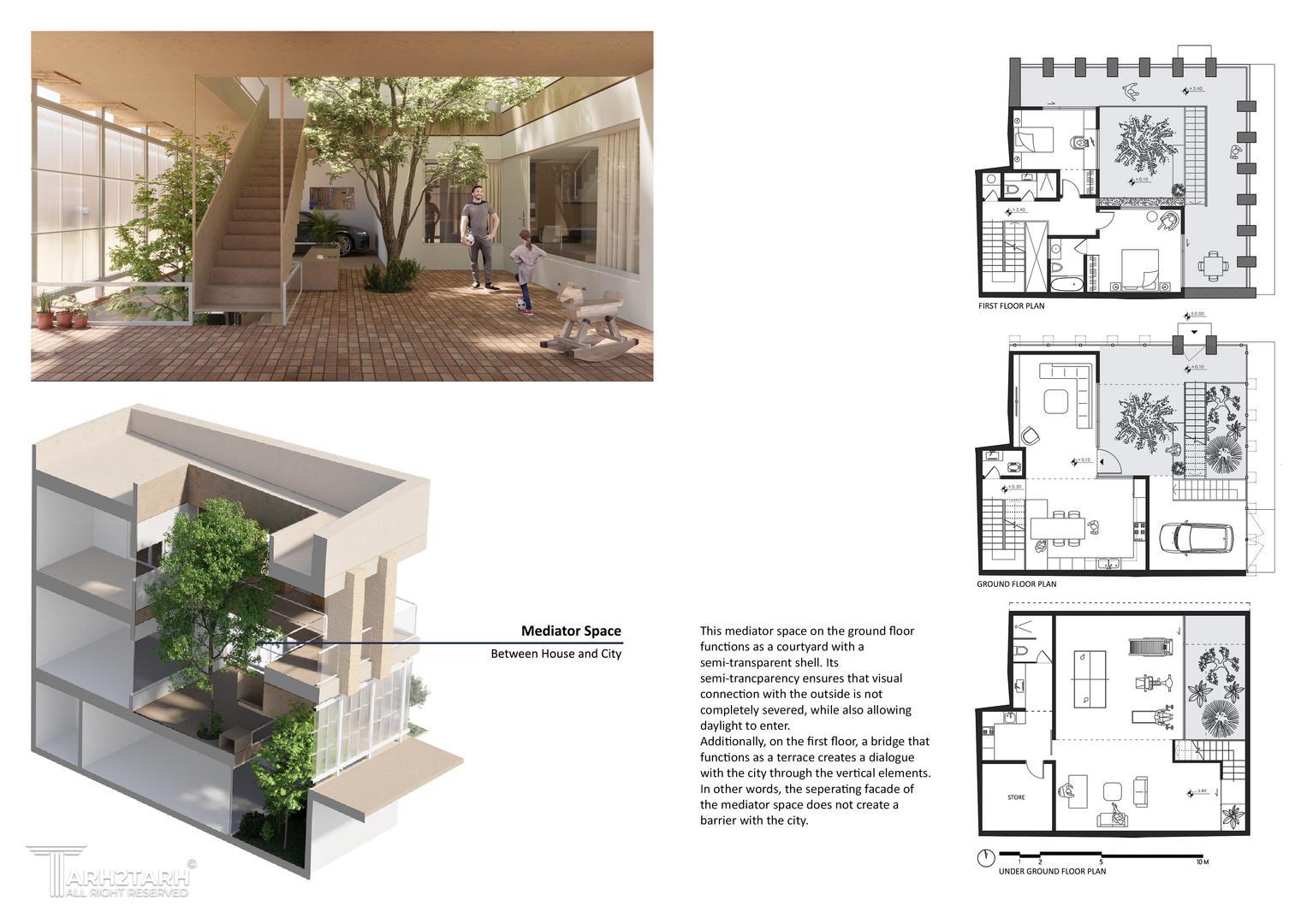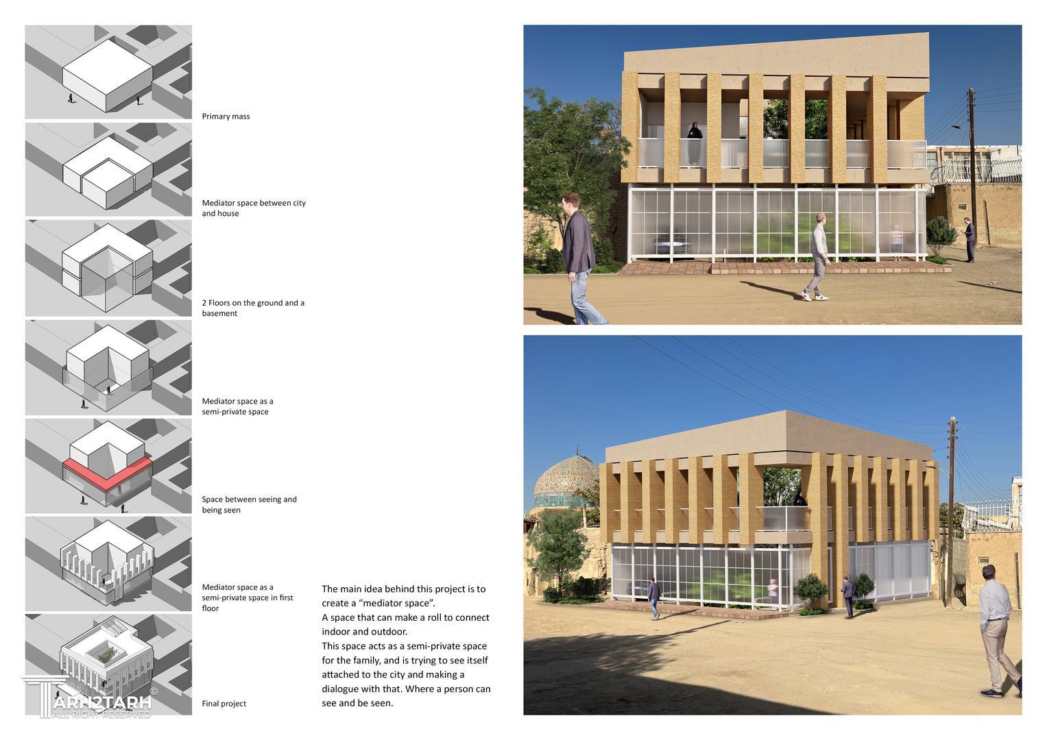 ایدهی «فضای میانجی» تلاشی است برای تضعیف مرز صُلب میان فضای خصوصی و عرصهی عمومی؛ جایگزینی برای حیاطهایی با جدارههای بسته، با فضایی بازتر و شفافتر که امکان تعریف درون و ارتباط با بیرون را به طور همزمان فراهم کند.