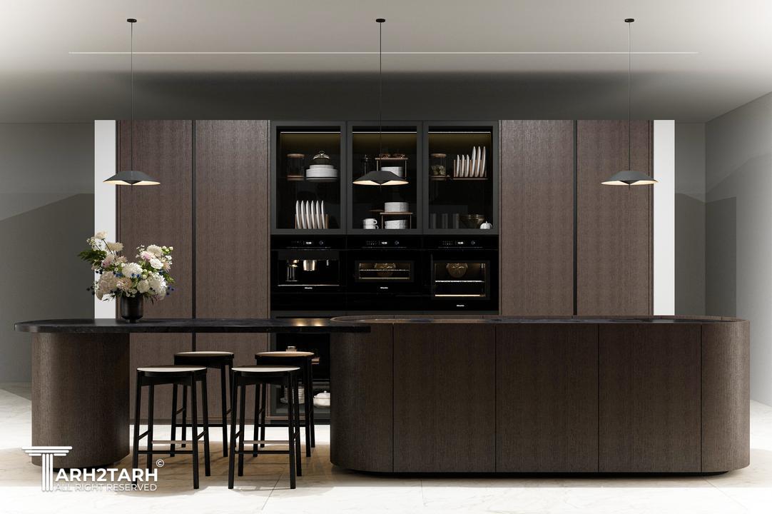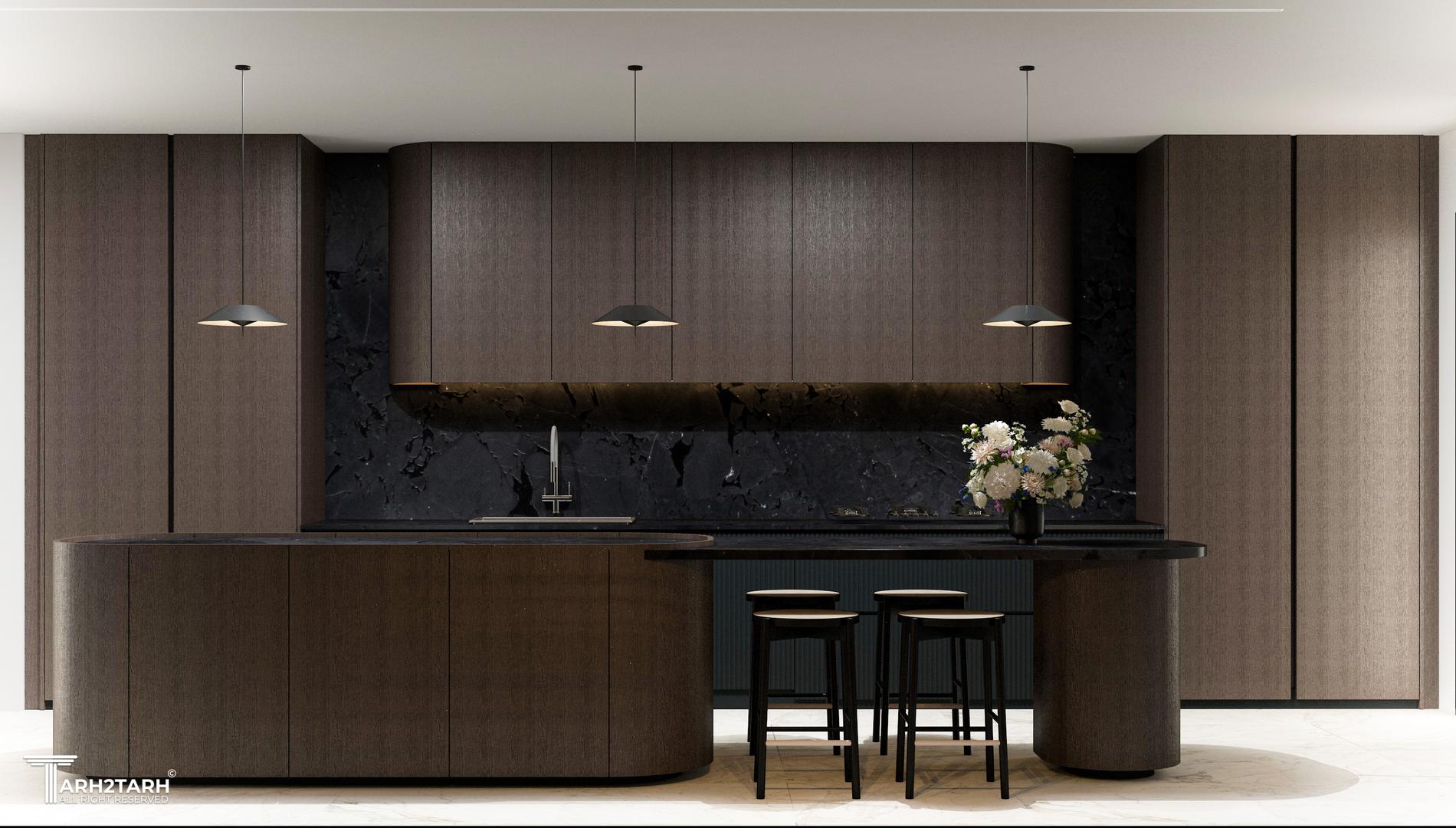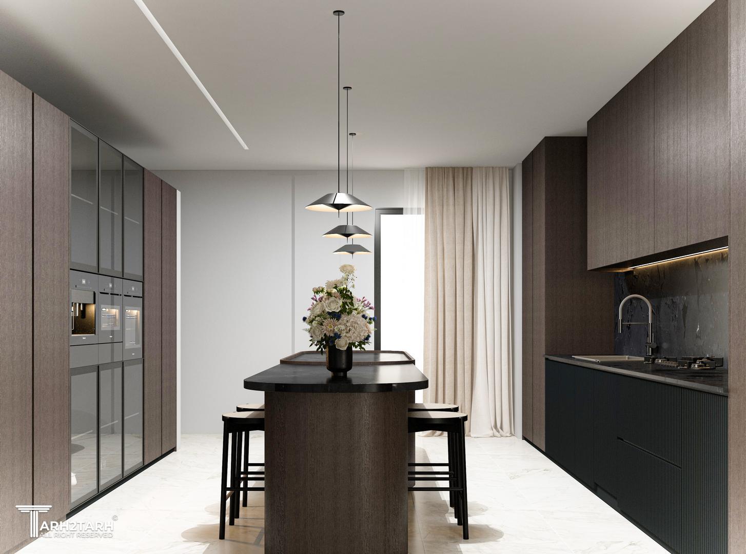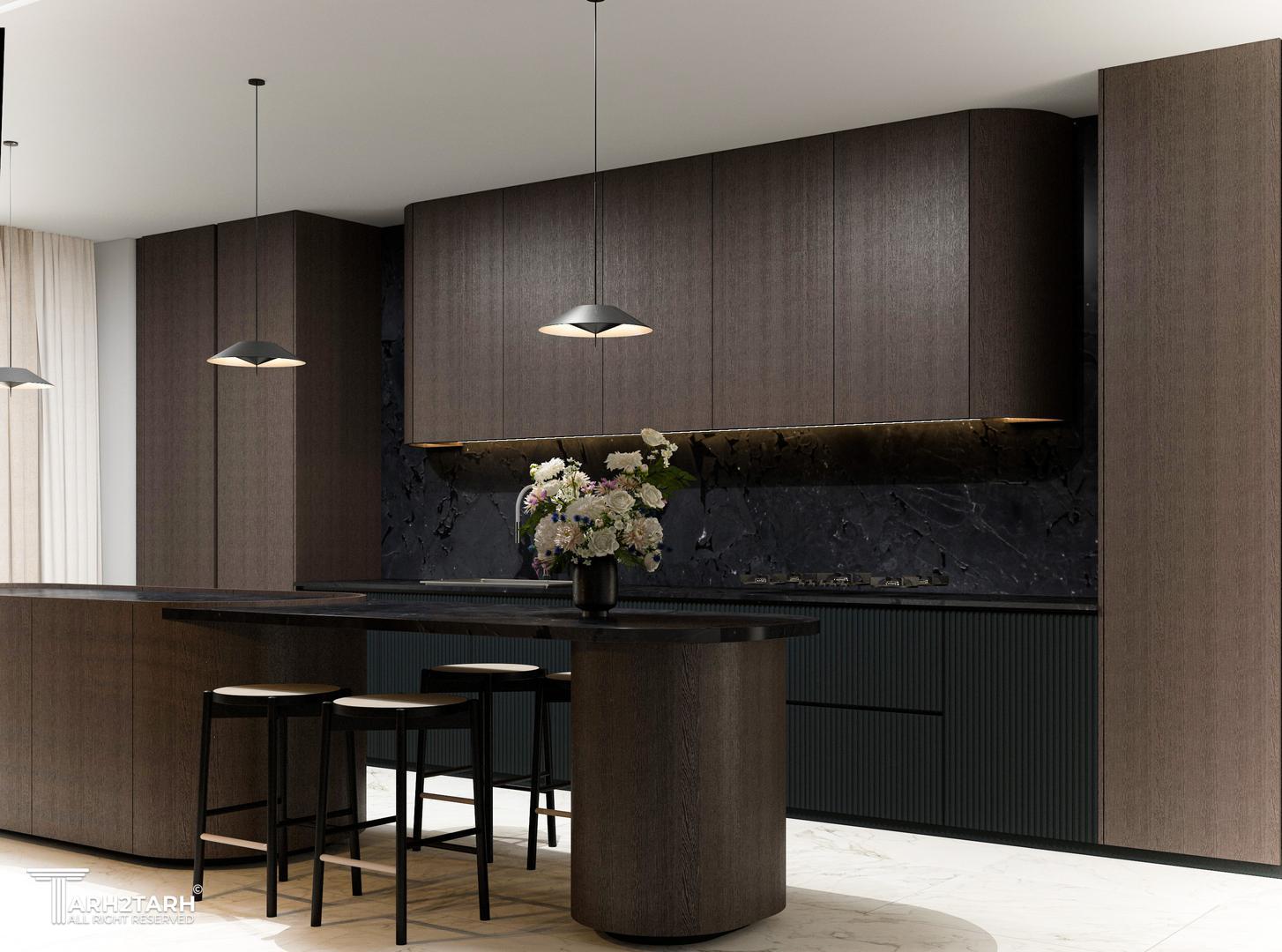 طراحی کابینت متفاوت پروژه 02 در این پروژه از ام دی اف روکش چوب تیره به خواسته کارفرما استفاده شده