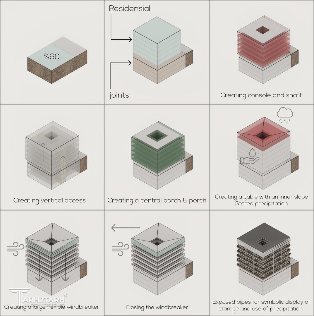 ارتباط بسیار ضعیف بافت مسکونی تهران با محیط و فضاهای طبیعی منجر شد که به فکر طرحواره هایی از حیاط ایرانی که عمودگرا باشد بیفتیم حتی با توجه به میزان کم فضا برای هر خانوار به نظر می آید این فضا به شکلی نیمه باز بتواند خود را به محیط داخل راه دهد. تهران شهری بسیار حساس به انرژی و منابع آبیست.از این رو به نظر می رسد با سادهترین برخورد های معمارانه بتوان سعی بر کاهش مصرف انرژی یا خودزایی انرژی در ساختمان کرد همچنین استفاده بهینه از منابع آبی در طرح معماری همچون جمعآوری آب حاصل از بارش های جوی برای مصارف مناسب باید مد نظر گرفته شود. با توجه به شرایط اقلیمی تهران بلاخص مناطق جنوبی و پر ازدحام آن که در منطقه ای گرم و خشک قرار گرفته و همچنین آینده کشور که رو به خشک سالی و گرم شدن پیش می رود به نظر می آید کنترل دمای آسایش محیطی نقش مهمی را در طرح ما ایفا کند لذا جلوگیری از نفوذ گرما به محیط خانه با راههایی ساده همچون چیدمان فضاهای غیر سکونتی و سبز بین فضاهای مسکونی در جهت ایجاد عایق حرارتی و عایق آلودگی جوی می تواند به شدت به ما کمک کند علاوه بر آن سبب فراهم آوری ارتباط انسان با طبیعت نیز میشود.تهران با داشتن بالغ بر ۸ میلیون جمعیت ساکن از اقوام و فرهنگ های مختلف با اختلاف طبقاتی متفاوت با معضل روبه روست.این مسئله نحوه ارتباط همسایگان با یکدیگر در موضوع آپارتمان نشینی ست مثال های ساده آن در ارتباط با نحوه بهره وری از مشاعات همچون پارکینگ و بام و تاسیسات مشاع همچون پمپ آب را میتوان مثال زد.به نظر میرسد با نگاهی وسواسی تر به "میان فضاها" ، ایجاد وضوح بیشتر در مرزهای مشاعی بتوان این موضوع را تا حدودی حل کرد به طور مثال عدم تلاش برای استفاده حداکثری از فضا جهت جانمایی پارکینگ و عدم سری سازی کاربری ها در کنار هم.
