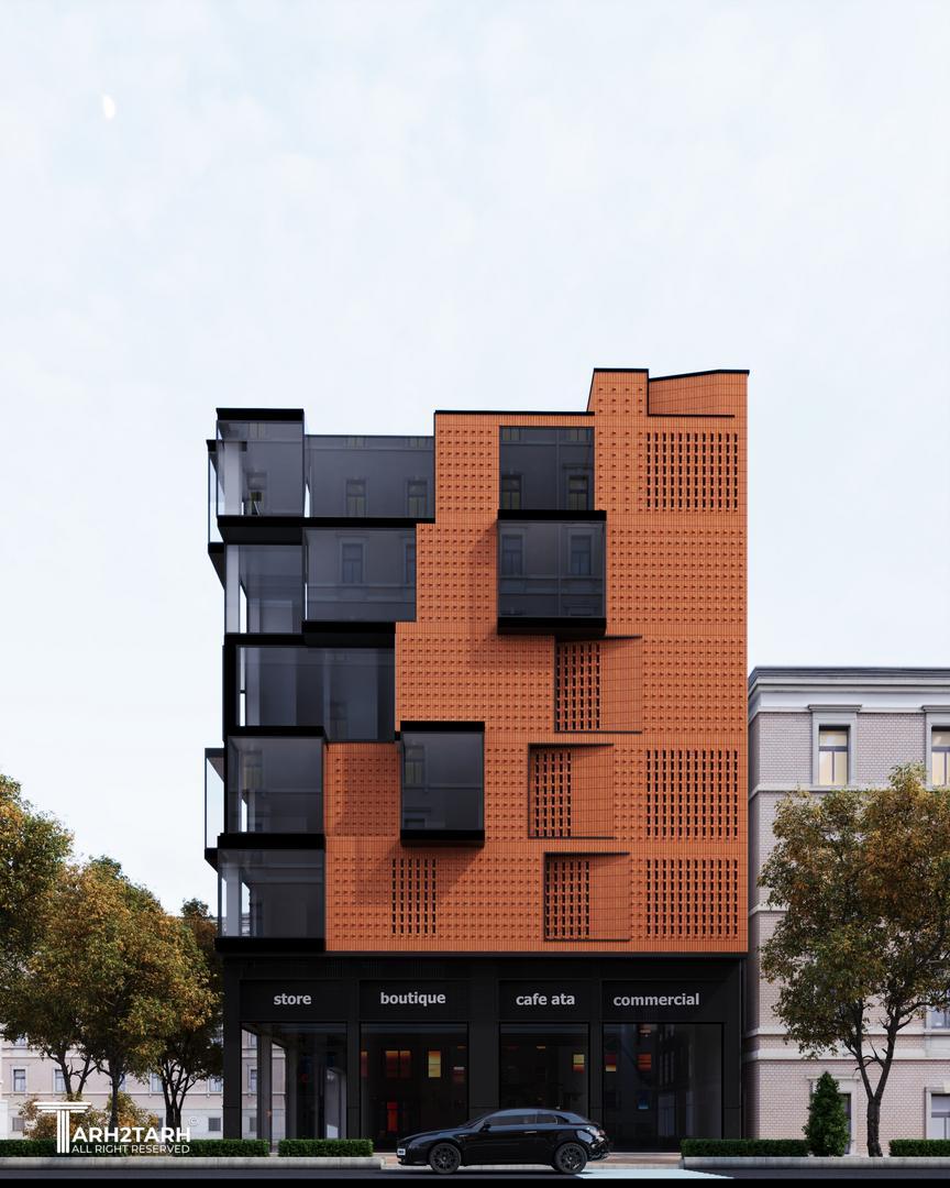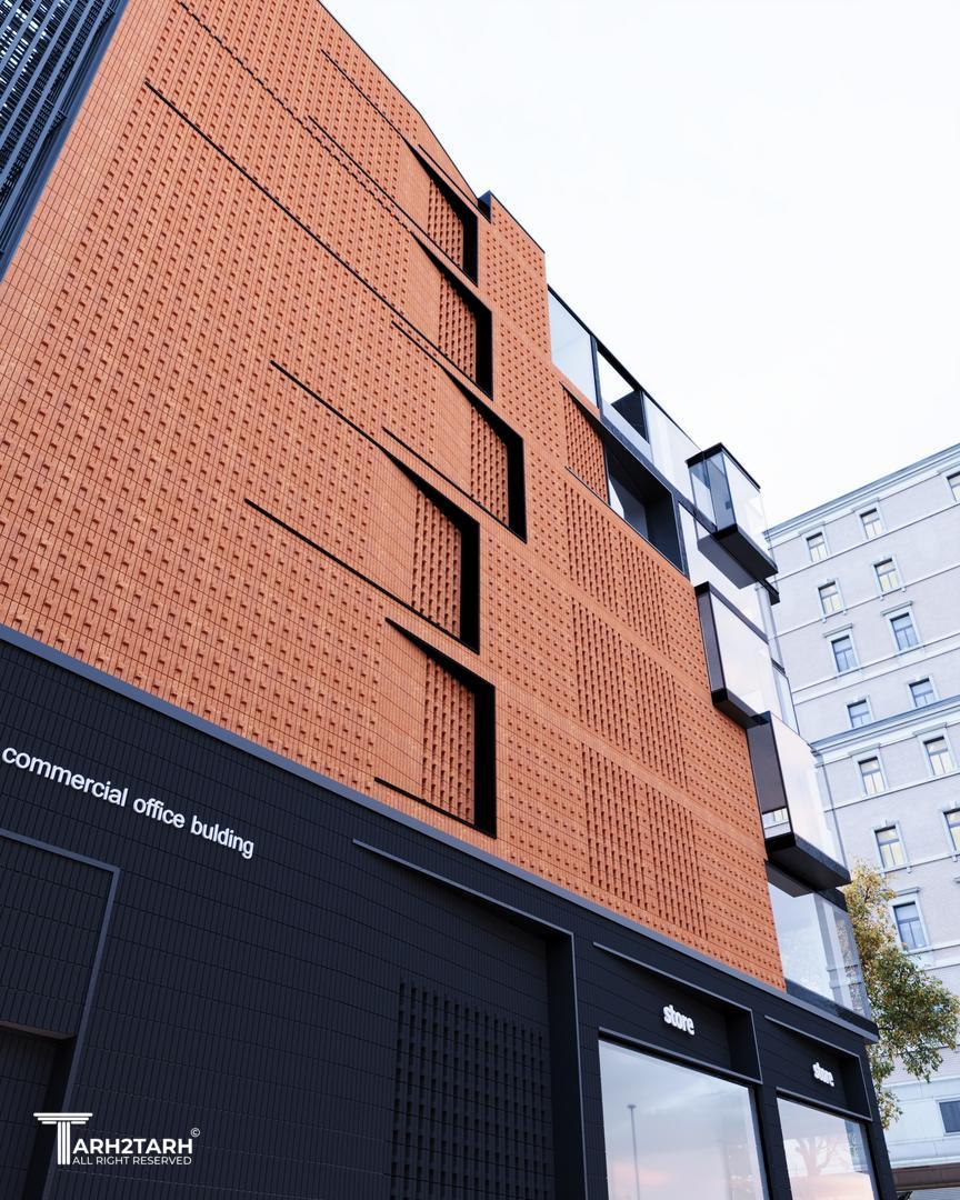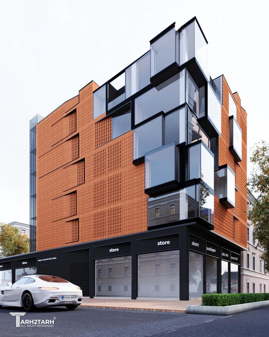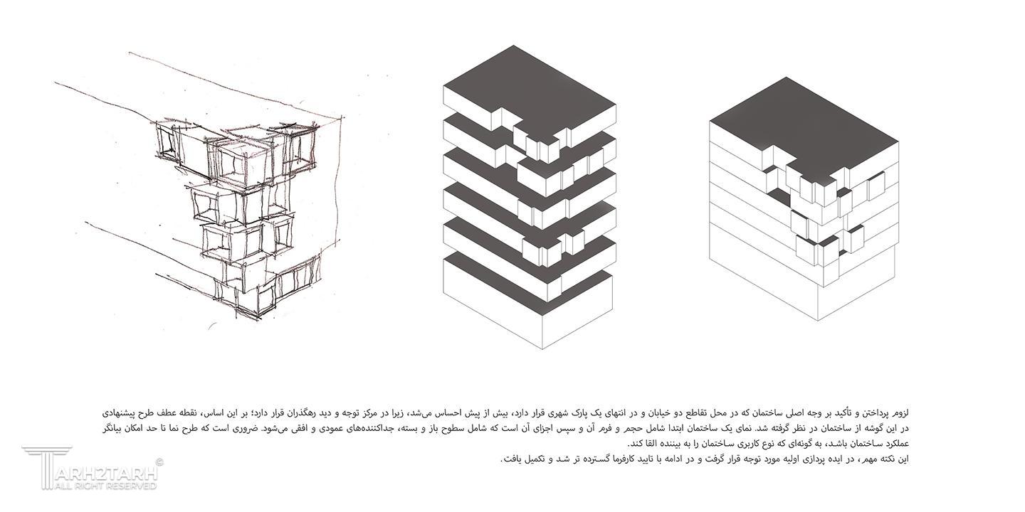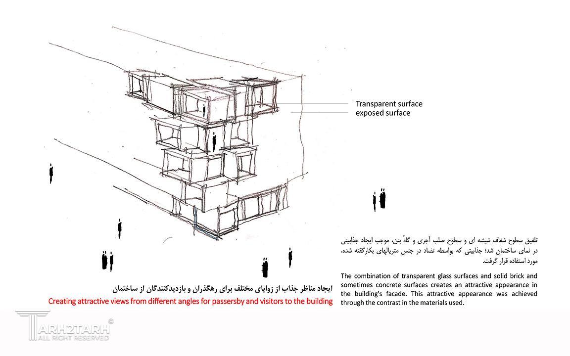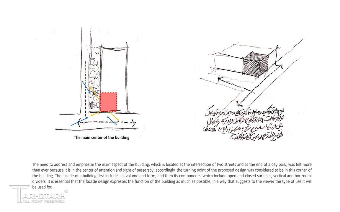شروع فرآیند طراحی این ساختمان همسو با شناخت بستر طرح و توجه به چگونگی و شکل گیری بنا در زمینه بود. لزوم پرداختن و تأکید بر وجه اصلی ساختمان که در محل تقاطع دو خیابان و در انتهای یک پارک شهری قرار دارد، بیش از پیش احساس میشد، زیرا در مرکز توجه و دید رهگذران قرار دارد؛ بر این اساس، نقطه عطف طرح پیشنهادی در این گوشه از ساختمان در نظر گرفته شد. نمای یک ساختمان ابتدا شامل حجم و فرم آن و سپس اجزای آن است که شامل سطوح باز و بسته، جداکنندههای عمودی و افقی میشود. ضروری است که طرح نما تا حد امکان بیانگر عملکرد ساختمان باشد، به گونهای که نوع کاربری ساختمان را به بیننده القا کند.تلفیق سطوح شفاف شیشه ای و سطوح صلب آجری و گاهً بتن، موجب ایجاد جذابیتی در نمای ساختمان شد؛ جذابیتی که بواسطه تضاد در جنس متریالهای بکارگقته شده، مورد استفاده قرار گرفت.