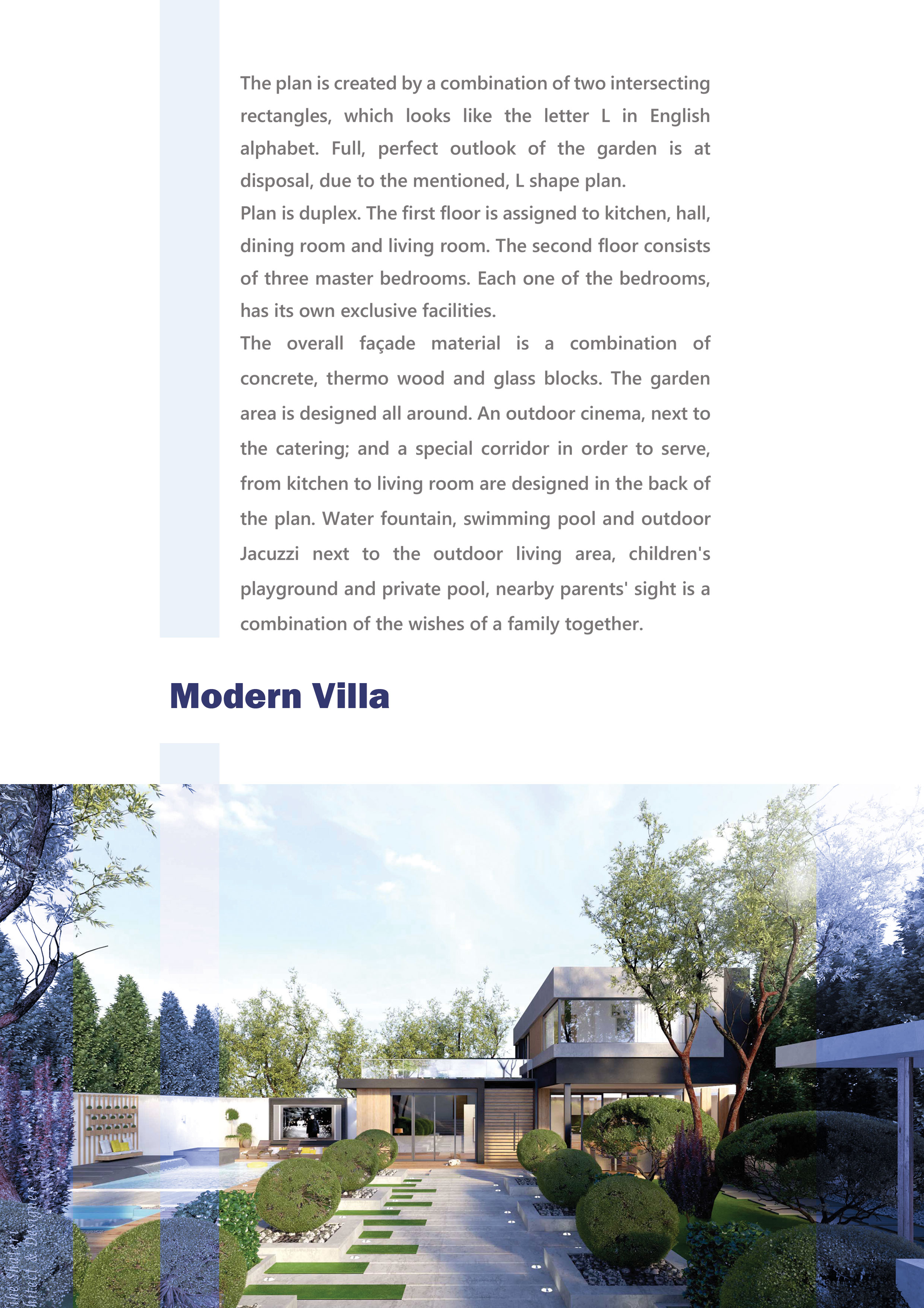 <p>طراحی نما و داخلی نمای مدرن . </p><p>1-طراحی 3 خواب </p><p>2- یک تراس یا آی لند </p><p> همکف </p><p>1-سالن </p><p>2- آشپرخانه </p><p>3- سرویس</p><p> لنداسکیپ</p><p>1-استخر </p><p>2-استخر کودکان </p><p>3-نشیمن روباز</p><p>4-زمین بازی </p><p>4- فضاسازی باغ است</p>