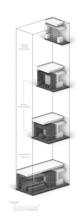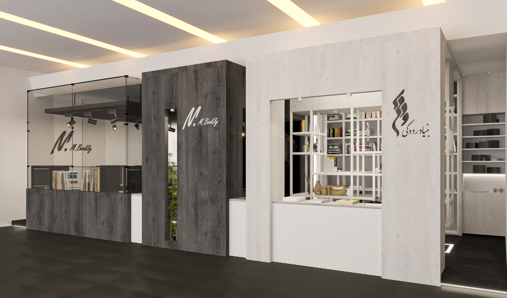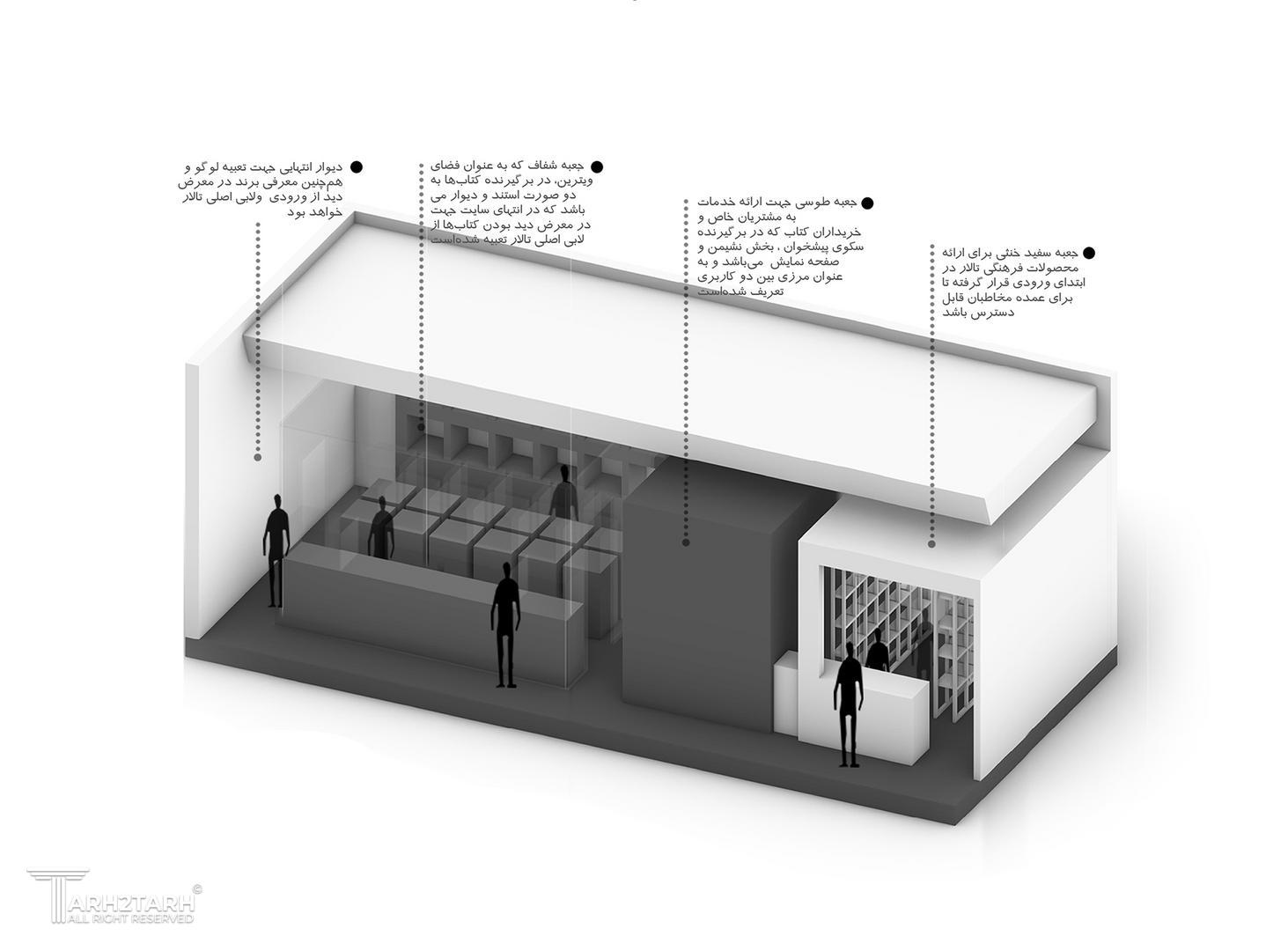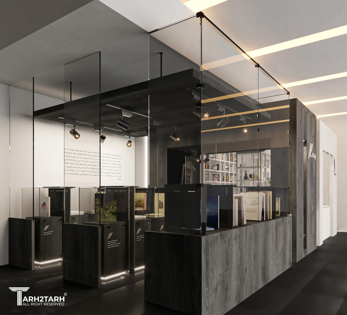 پروژه در محلی با ابعاد 10/85 در 3/50 متر داخل تالار وحدت تهران برای نمایش و فروش کتابهای نفیس “تیراژ محدود” و همچنین فروش محصولات فرهنگی هنری اختصاص تعریف شدهاست. قرارگیری این دو کاربری در کنار هم با توجه به تمایز زیاد در ارزش محصولات ، یکی از چالشهای برنامه ریزی فضا میباشد. از طرفی خود ساختمان تالار وحدت از بناهای ارزشمند تهران محسوب میشود. با توجه به این دو مهم، استراتژی طراحی بر مبنی هر چه کم اثرتر و خنثیتر بودن بستر ارائه در جهت تاکید بر مکان موجود و از طرفی خود کتب بنا شدهاست با توجه به خواسته کارفرما مبنی بر استفاده از طرح این فضا به عنوان امضای شخصی در محیطهای دیگر و همچنین ارزش کتب ارائه شده و داشتن مخاطب و خریدار خاص، مبنای طراحی بر قرارگیری مخاطب در یک فضای تعریف شده مجزا برای بازدید و خرید - به جای تجربه آن در کنار کالاهای دیگر - تعریف شد؛ کلیت فضا از سه بخش ویترین برای ارایه کتب همانند مجسمههایی در جعبههای شیشهای - در معرض دید همگان - فضایی سفید و خنثی برای ارایه محصولات فرهنگی و فضایی میانی برای ارایه کتب - به تصویر کشیدن آنها در صفحه نمایش و در نهایت مشاهده از نزدیک و ارائه خدمات مناسب به مخاطبان خاص- هم چنین نظارت و کنترل بر بخش محصولات فرهنگی، تشکیل خواهد شد با توجه به اهمیت حفظ کف و سکوهای موجود در فضا، کیوبها برروی یک کف کاذب سرتاسری با پوششی مانند کف اصلی بنا اجرا خواهند شد؛ به گونهای که سکوهای موجود کاور شده و بخشی از آنها بدون آسیب دیدهگی، برای نمایش آثار استفاده خواهند شد.