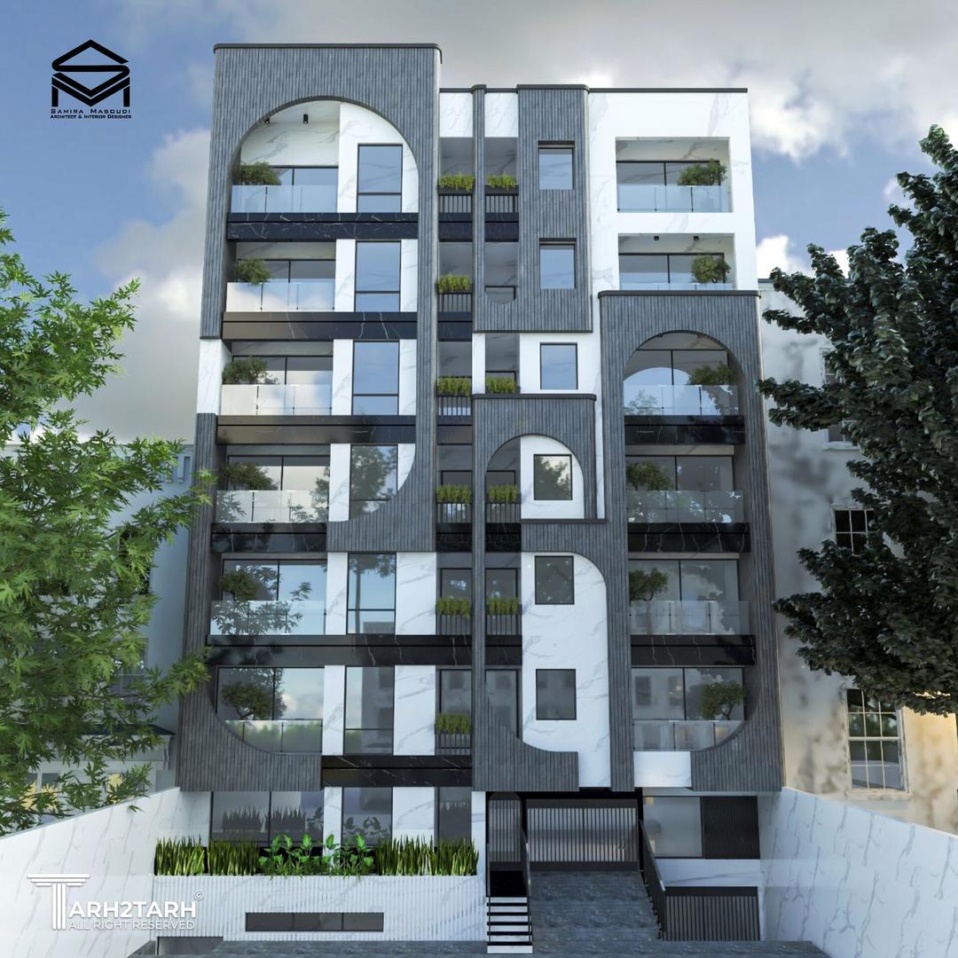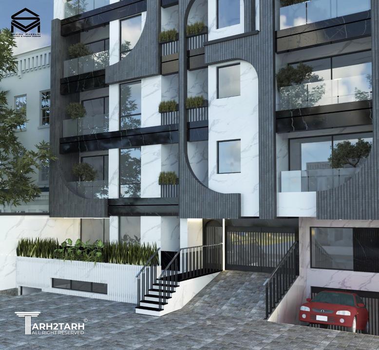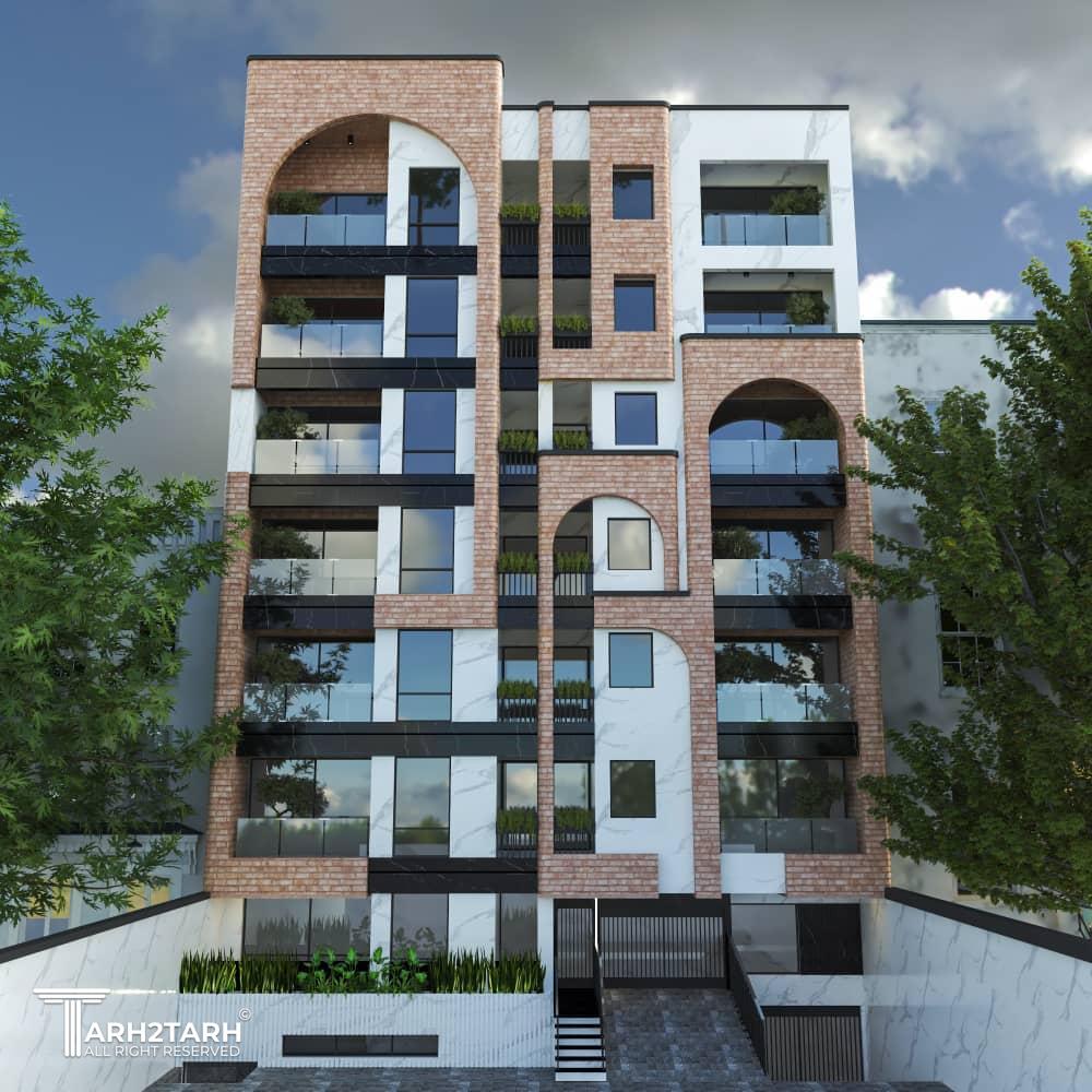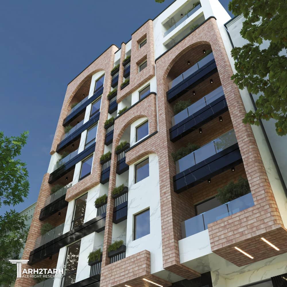 طراحی نمای مجتمع مسکونی ۱۲ واحدی،با رویکرد معماری ایرانی و استفاده از متریال آجر و سنگ
