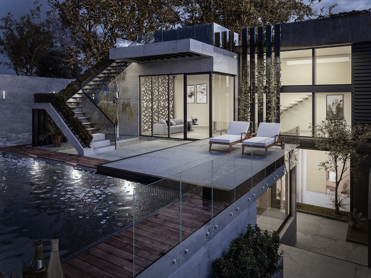 در طراحی این ویلا با توجه به اینکه اجازه ساخت تا ارتفاع معینی نداشتیم ،طبقه همکف به صورت یک طبقه و یک نیم طبقه طراحی شده ، و یک طبقه زیر همکف که سالن اصلی و اتاق ها در آن تعبیه شده اند.