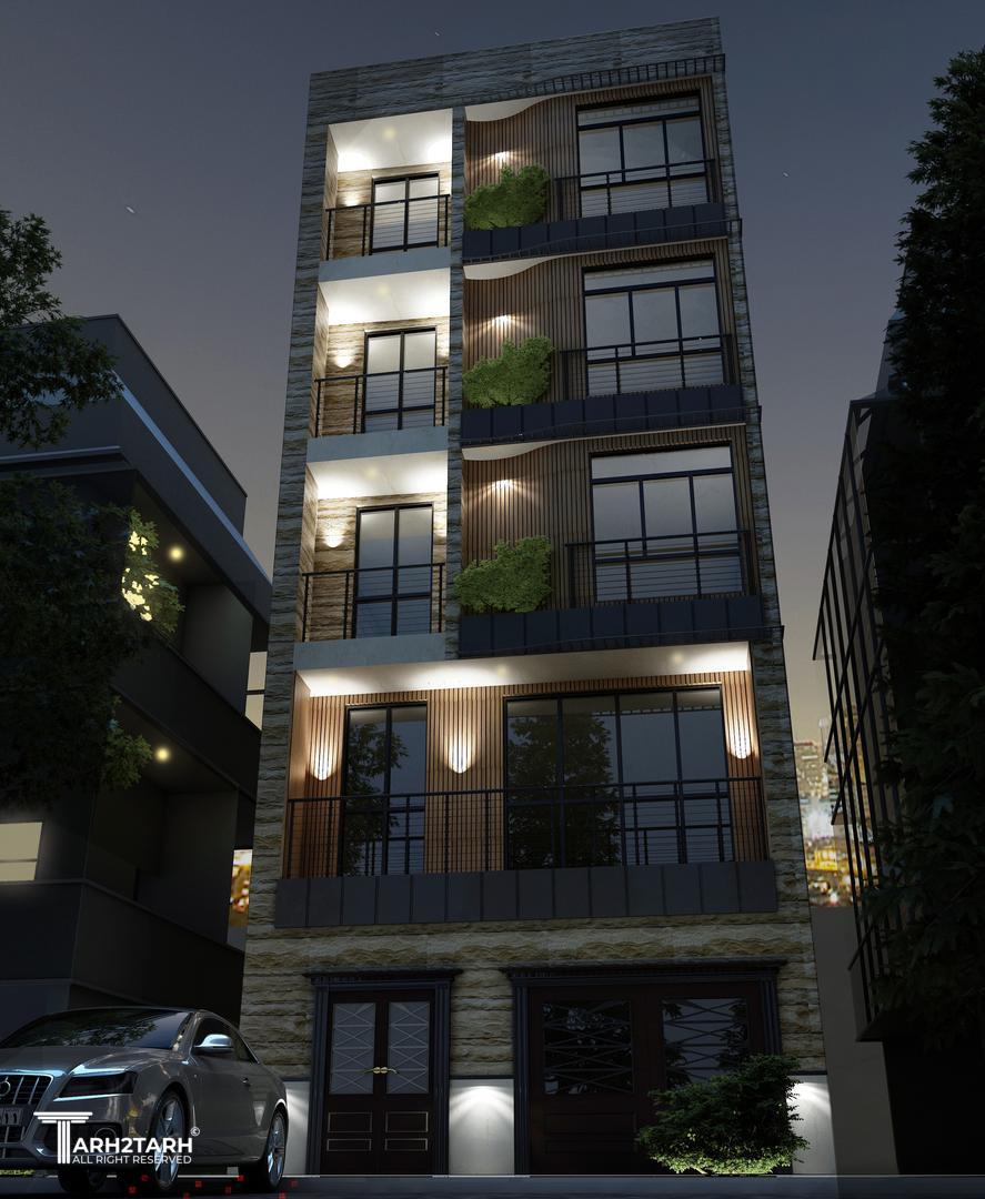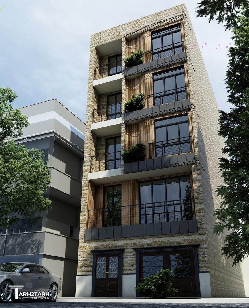 این رندر یک پروژه مسکونی شهری را نشان میدهد که دارای 4 طبقه روی همکف است. نما با ترکیب متریالهای طبیعی (سنگ و چوب) و عناصر مدرن (نردهها و فریمهای تیره)، زیبایی خاصی به بافت متراکم شهری بخشیده است.