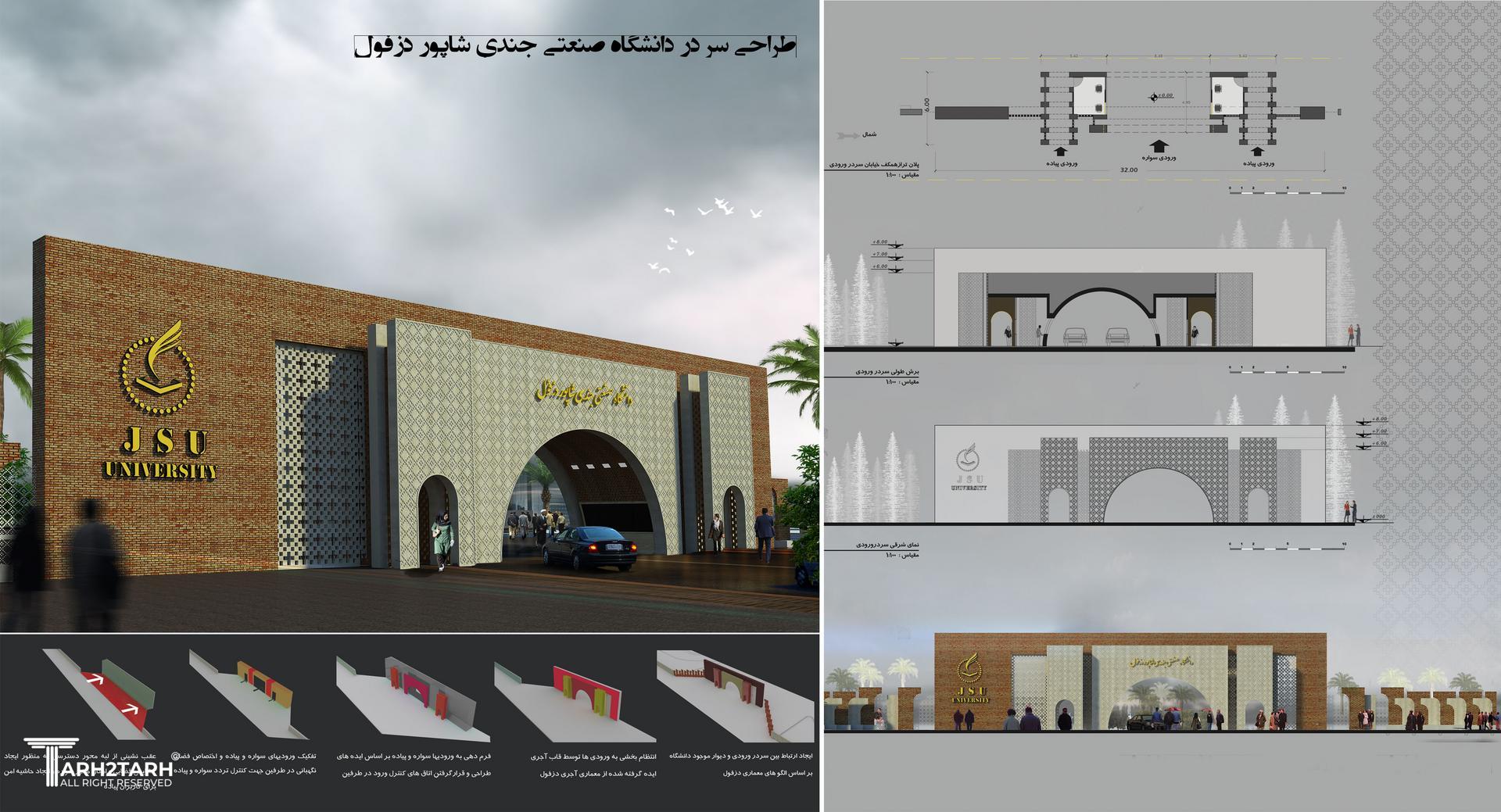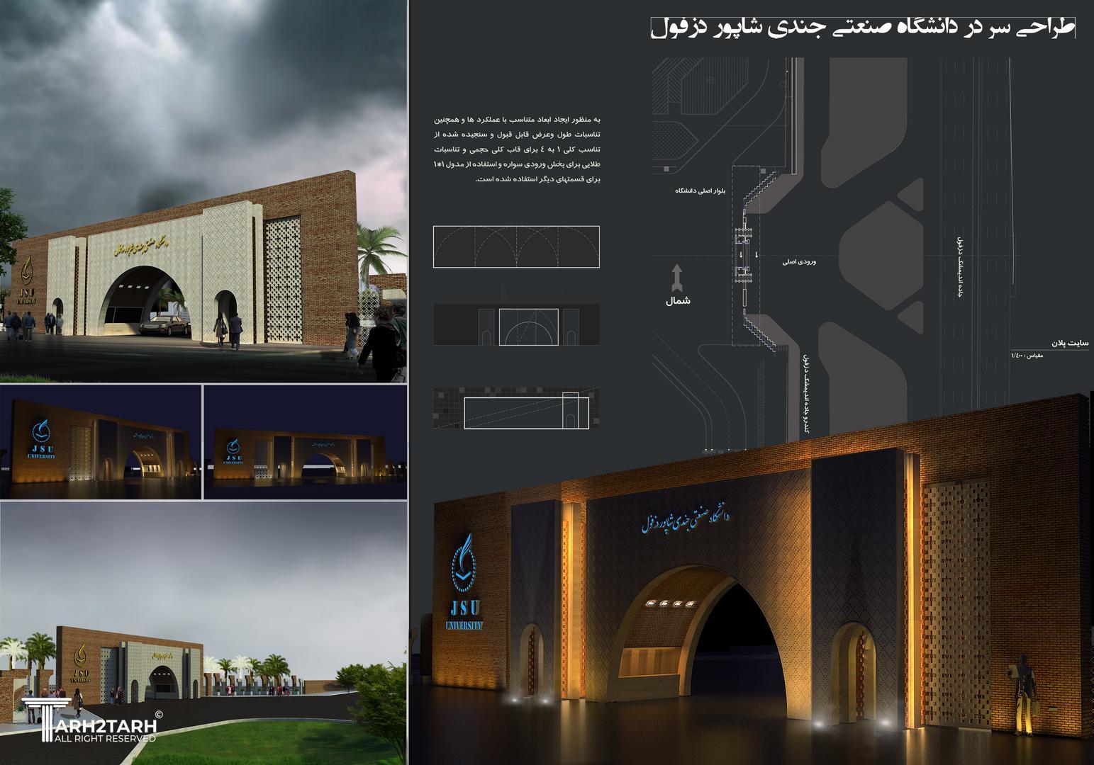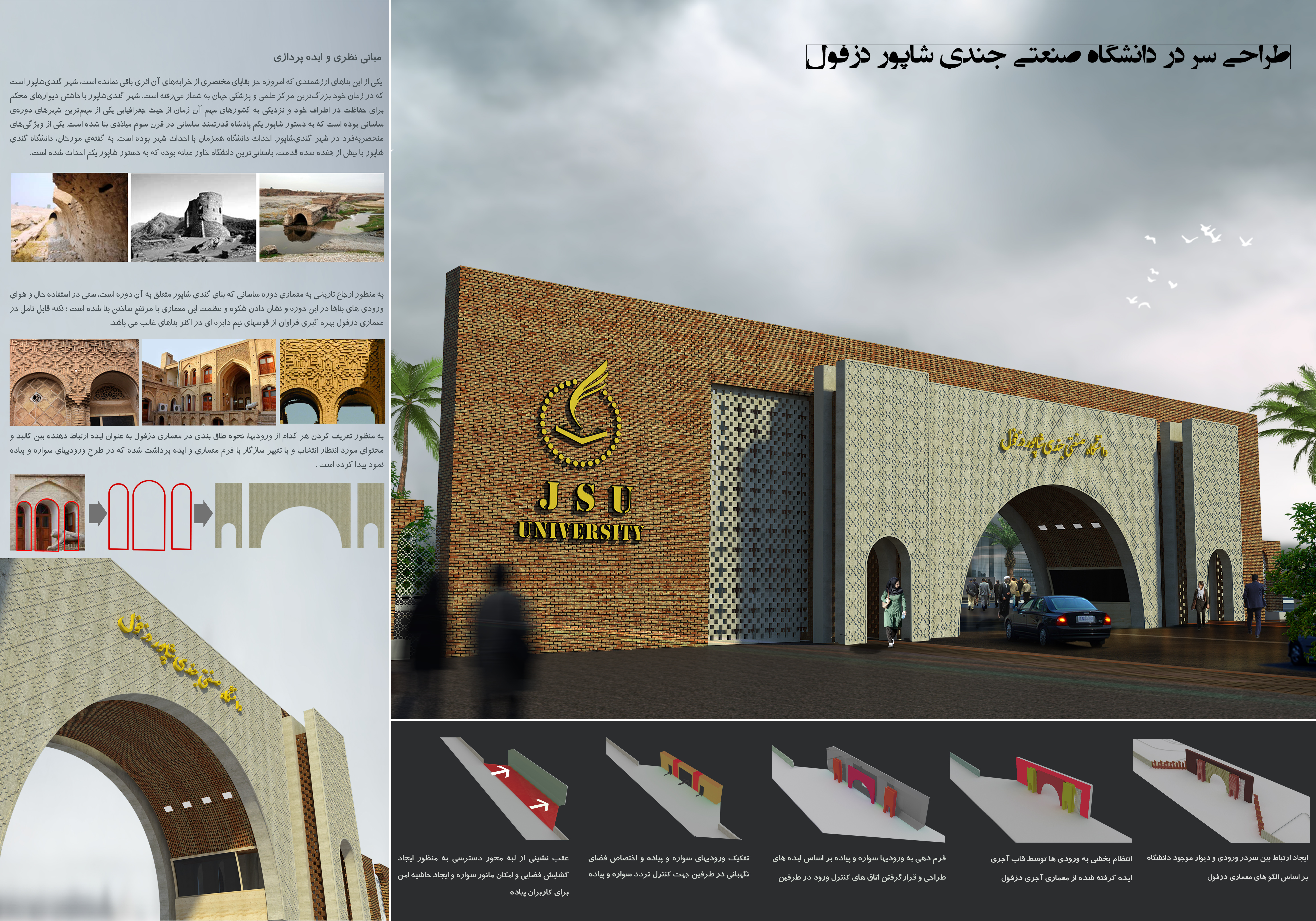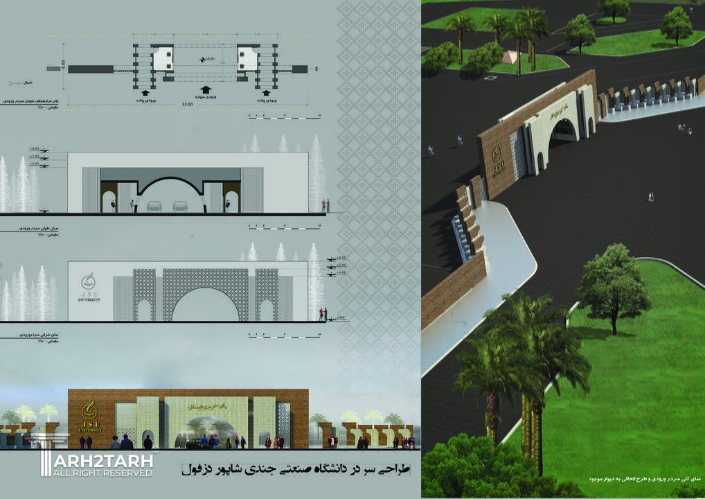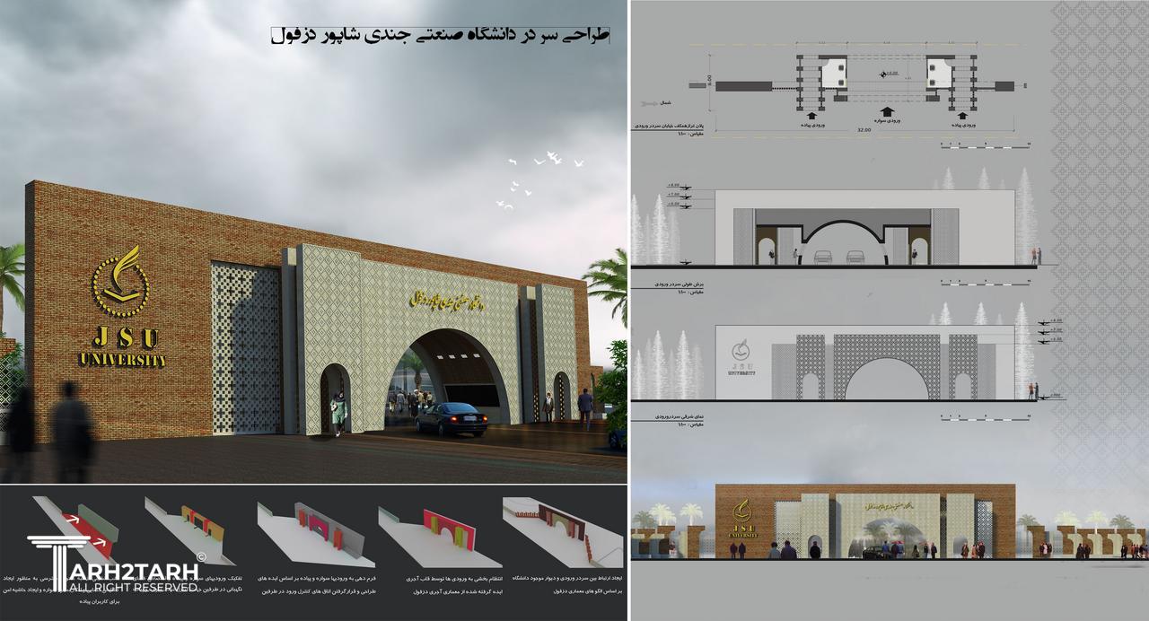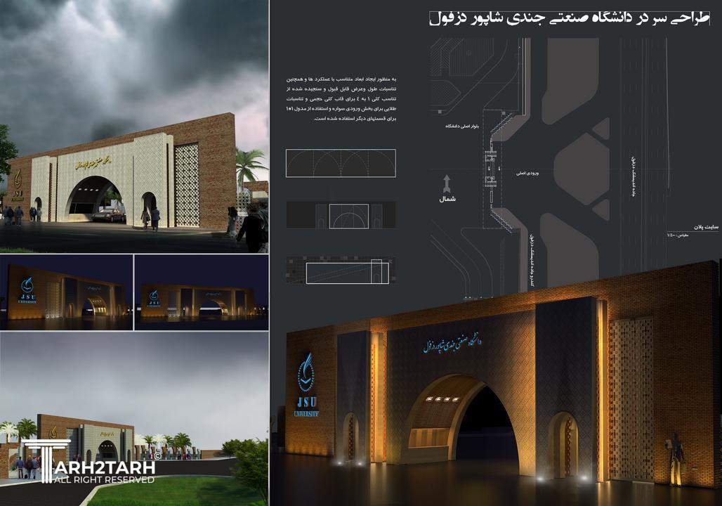 طرح ارایه شده جهت سر در ورودی دانشگاه صنعتی جندی شاپور این طرح در مسابقه ای که به همین منظور برگزار شده بود موفق به کسب مقام سوم شده است