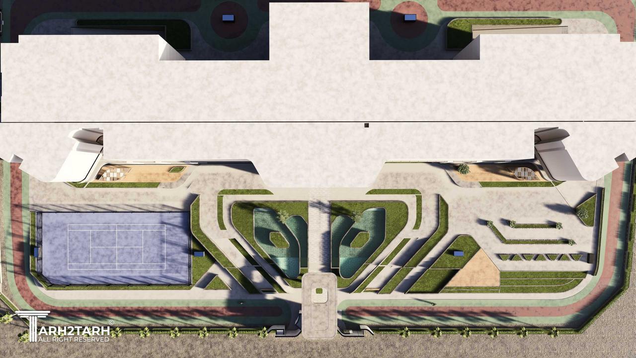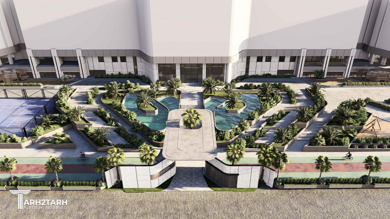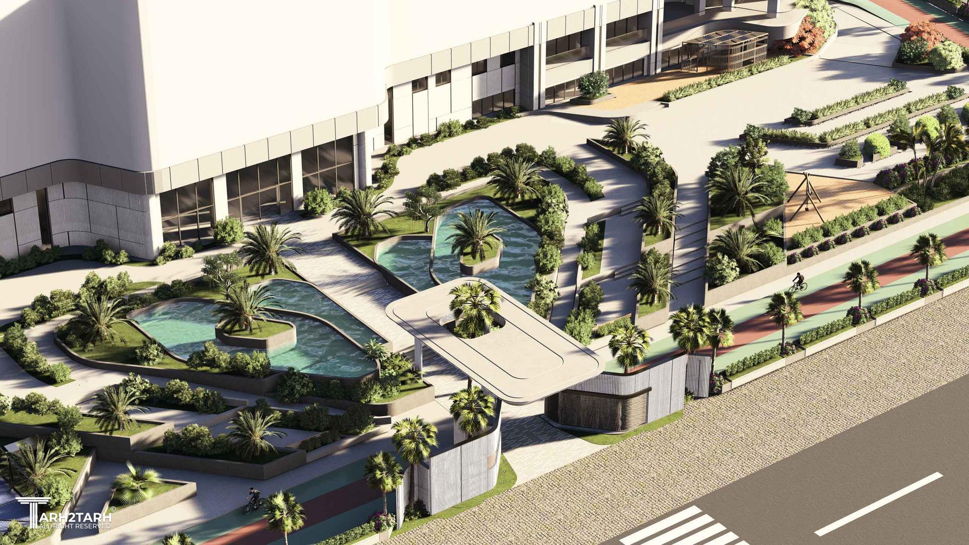 لنداسکیپ پروژه به گونه ای انجام گرفت که در آن از امکاناتی چون پیست دوچرخه سواری، زمین تنیس و زمین بازی کودک بهره مند گردد و همچنین چالش اصلی طراحی، حفظ کیفیت فضایی پروژه ضمن رعایت ضوابط آتش نشانی بود. (من در استودیو نعیمی نقش طراحی لنداسکیپ پروژه و همچنین تهیه نقشه های اجرایی را برعهده داشتم)