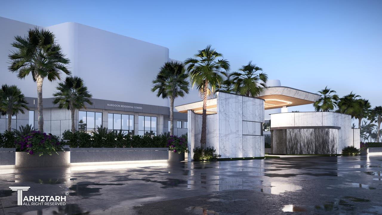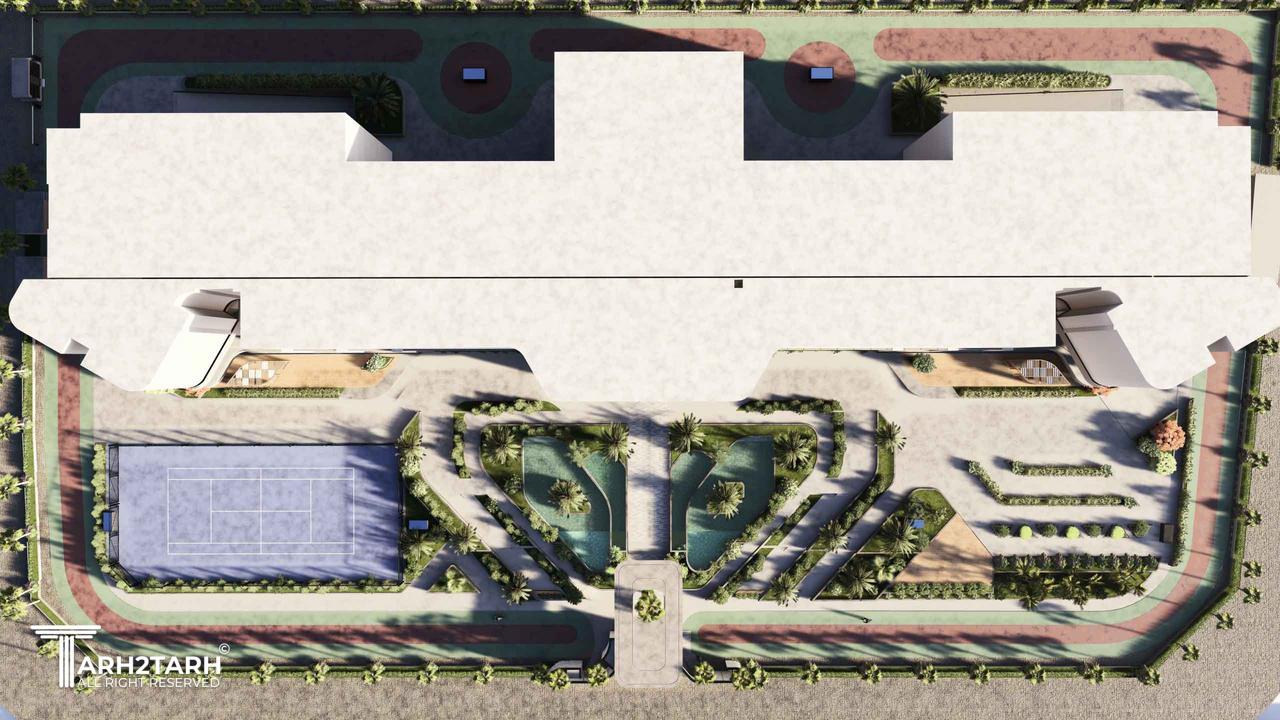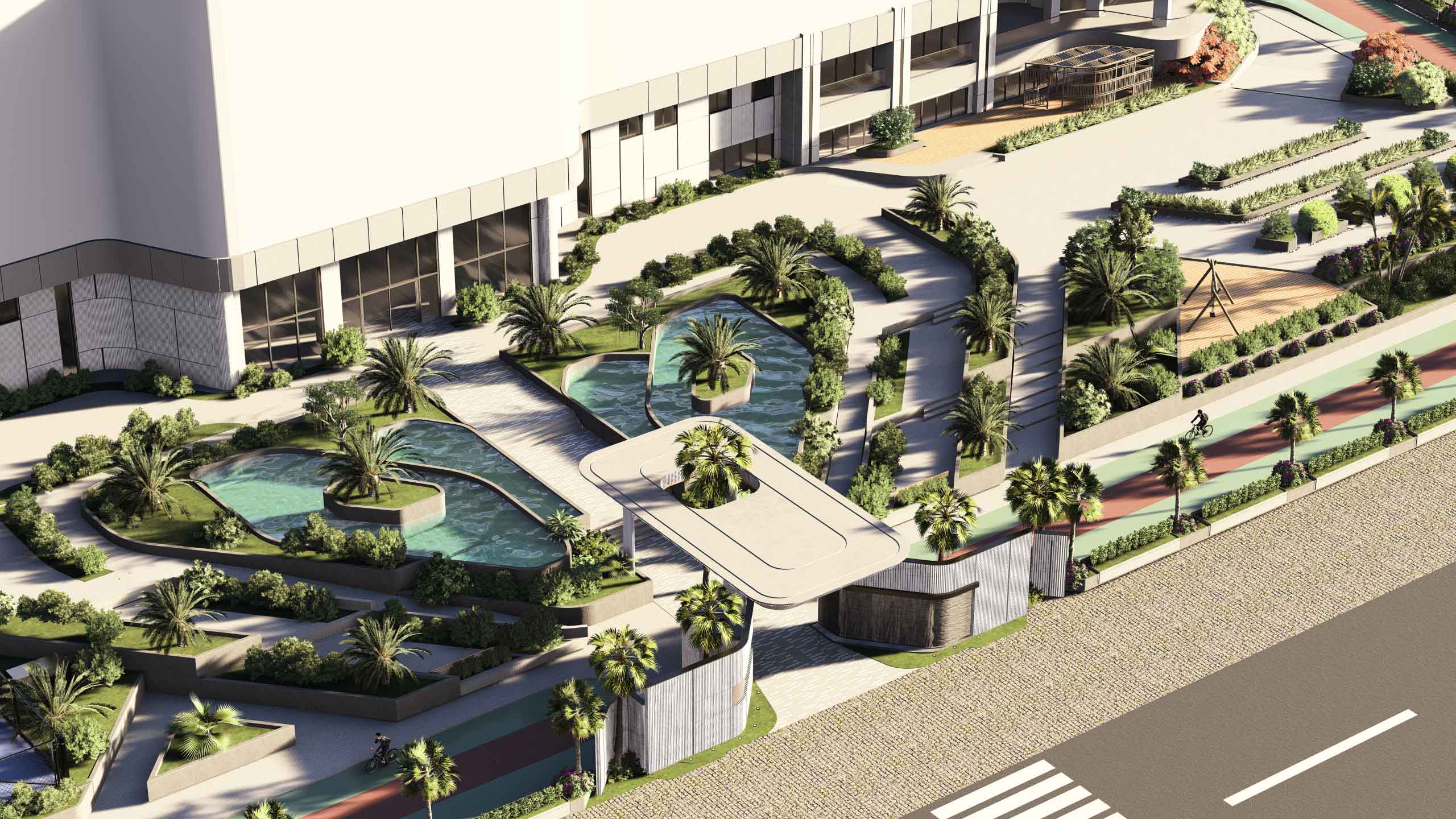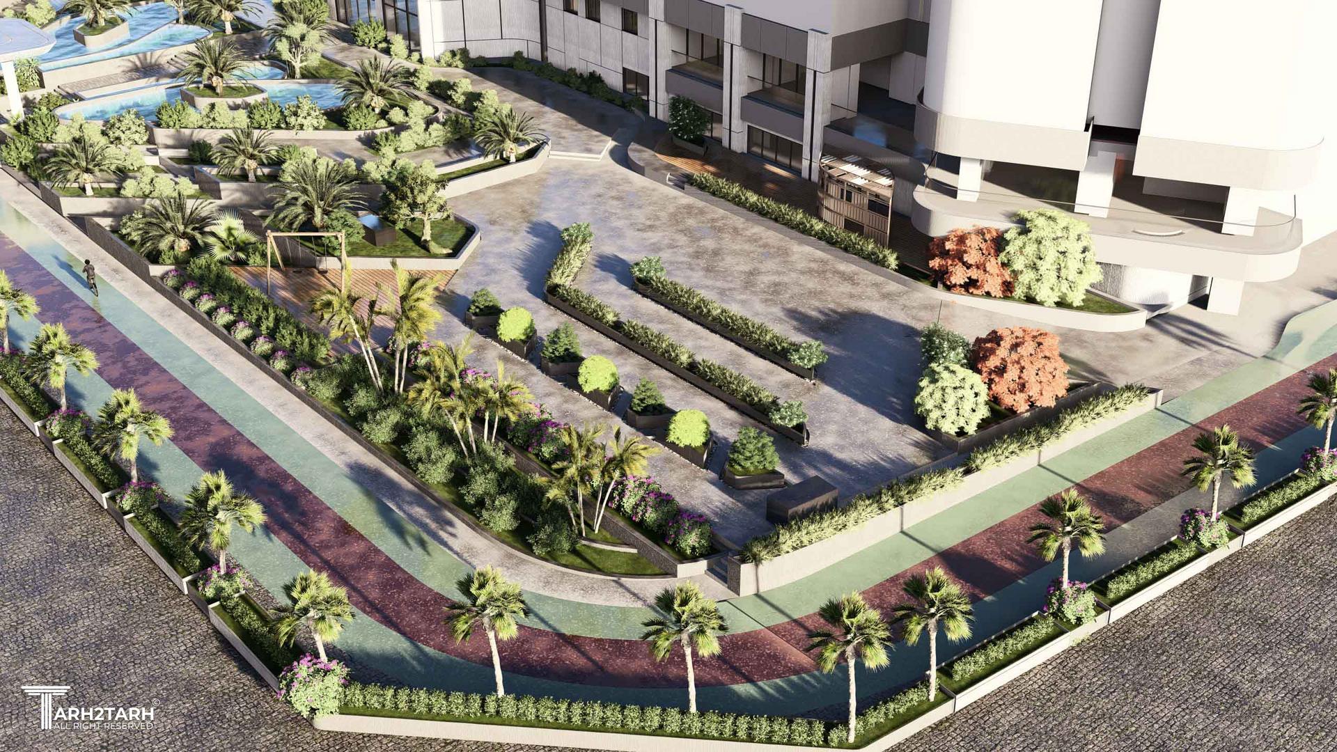 لنداسکیپ پروژه به گونه ای انجام گرفت که در آن از امکاناتی چون پیست دوچرخه سواری، زمین تنیس و زمین بازی کودک بهره مند گردد و همچنین چالش اصلی طراحی، حفظ کیفیت فضایی پروژه ضمن رعایت ضوابط آتش نشانی بود. (من در استودیو نعیمی نقش طراحی لنداسکیپ پروژه و همچنین تهیه نقشه های اجرایی را برعهده داشتم)