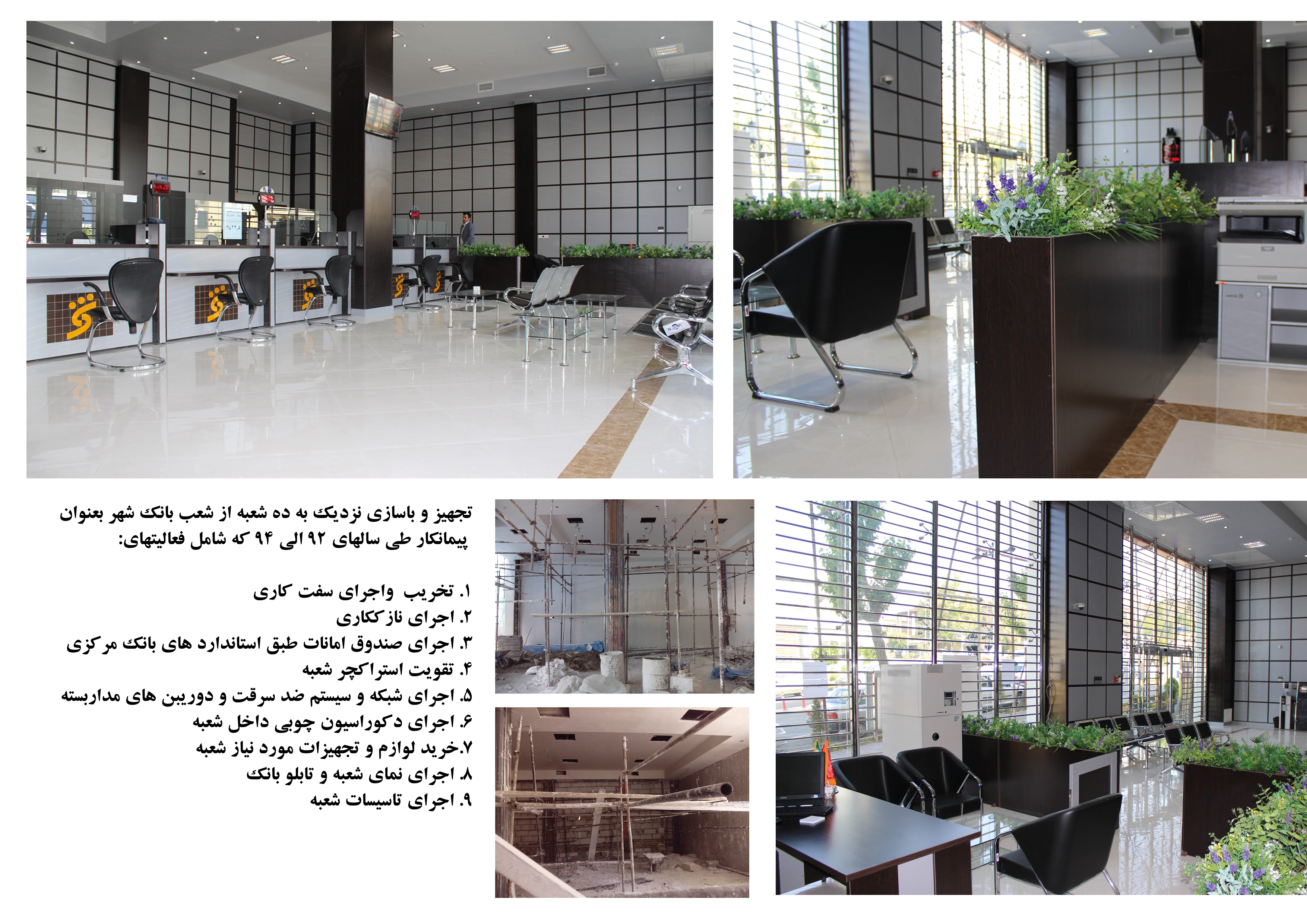 در طی سالهای 92 الی 93 که بانک شهر در حال توسعه شعب خود بود این امکان برای ما فراهم شد که بعنوان پیمانکار مجری دکوراسیون داخلی نزدیک به 10 شعبه باشیم و در ادامه در تولید طراحی مبلمان بانکی همکاری نماییم.