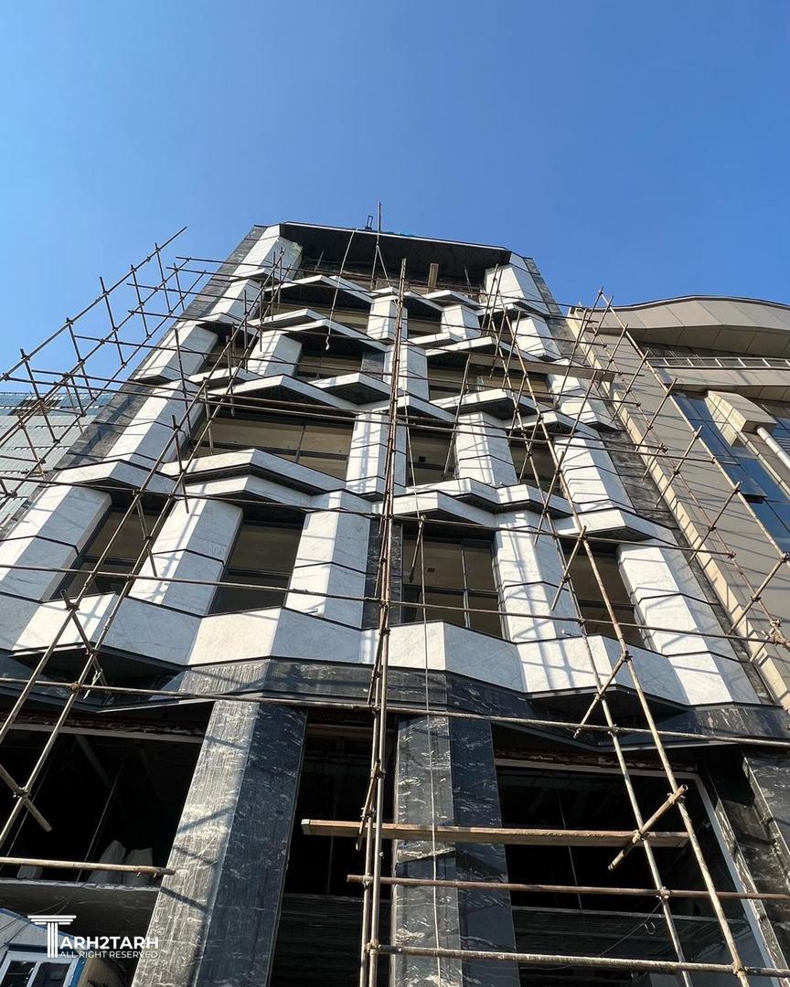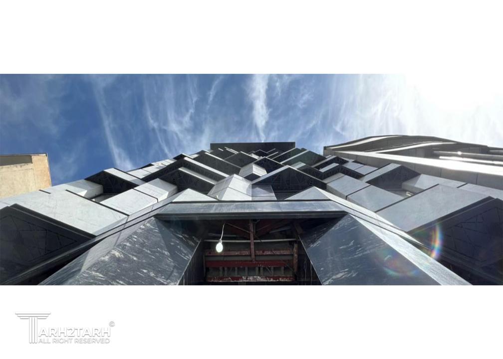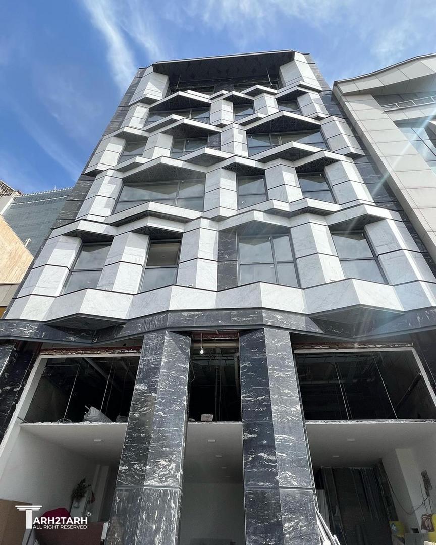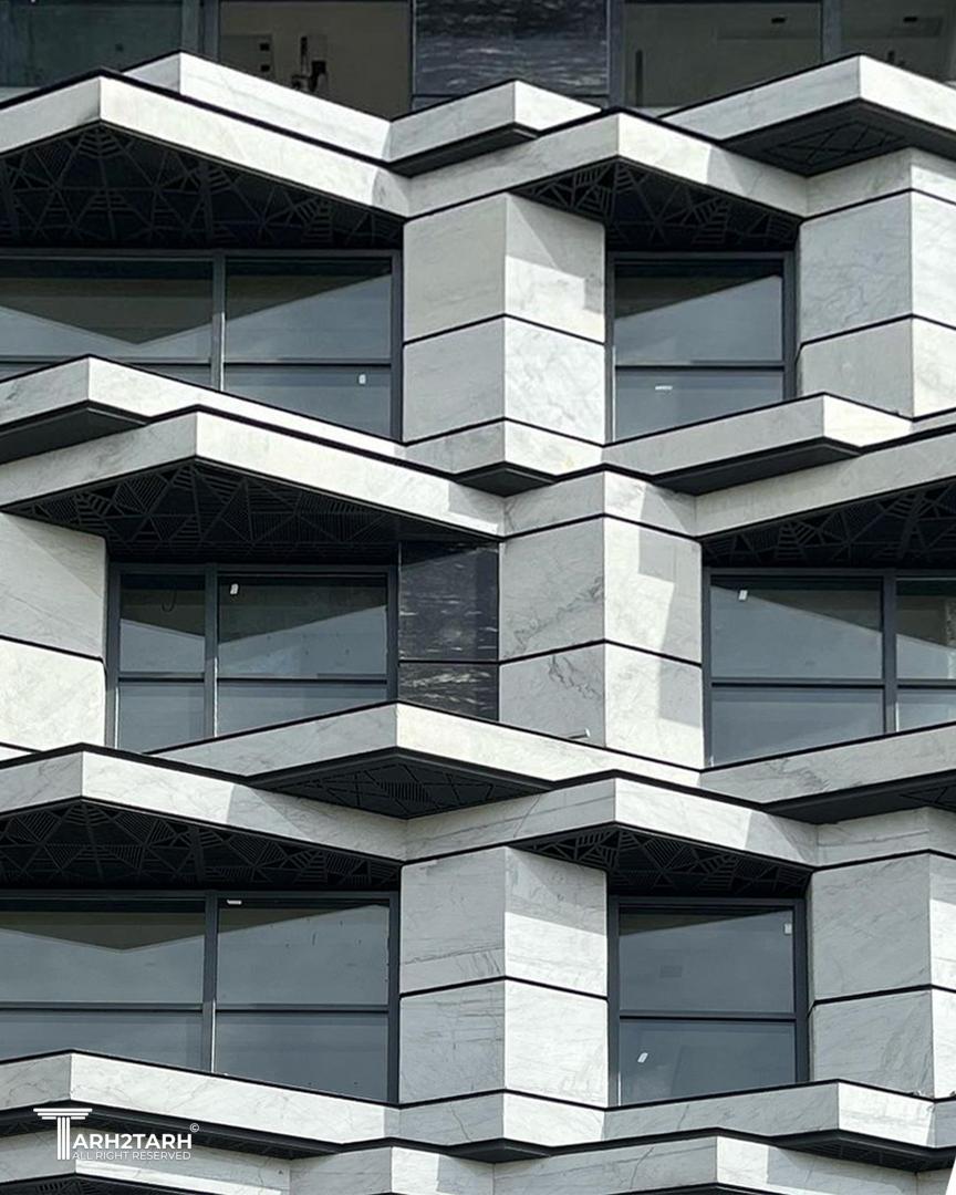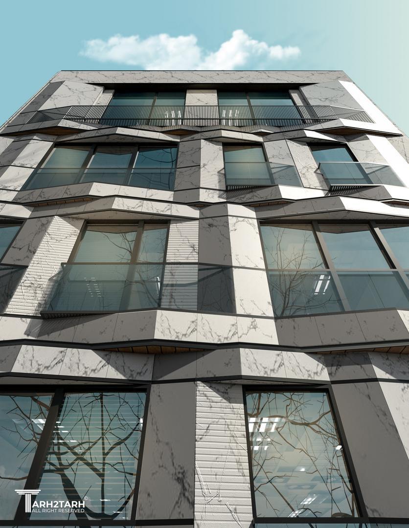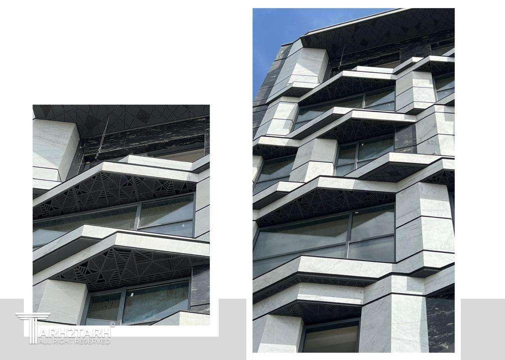 در طراحی نما، فرم مکعبی همچون ساختاری ماژولار عمل میکند. هر مکعب نمادی از واحد اداری مستقل است، در حالی که ترکیب کلی آنها وحدت کل بنا را حفظ میکند. با کنترل نسبت پر و خالی در نما، تعادل بین نور، دید، و مصالح سنگین و سبک برقرار شده است. در شب، با نورپردازی خطی در درزهای مکعبها، حجم ساختمان به صورت درخشان و شاخص در بافت شهری خودنمایی میکند.