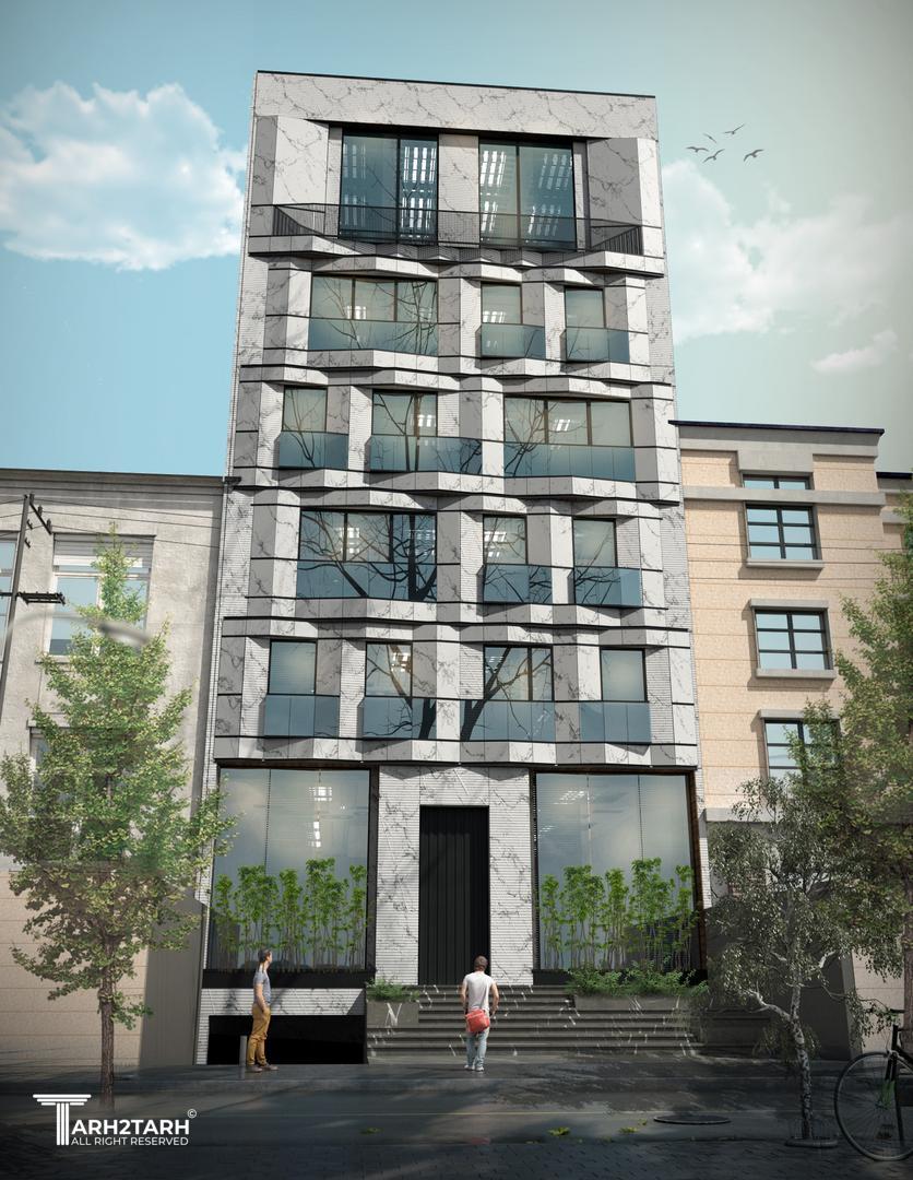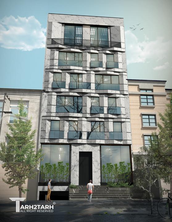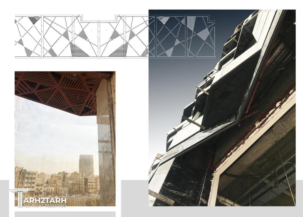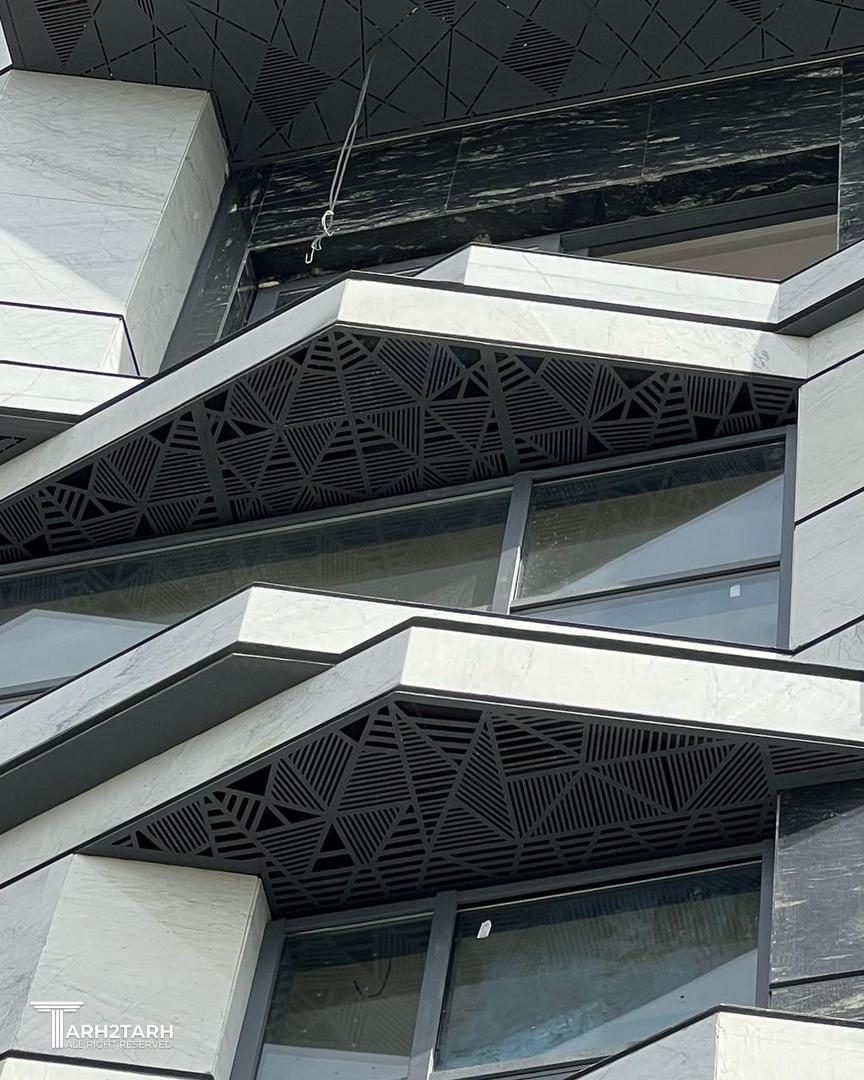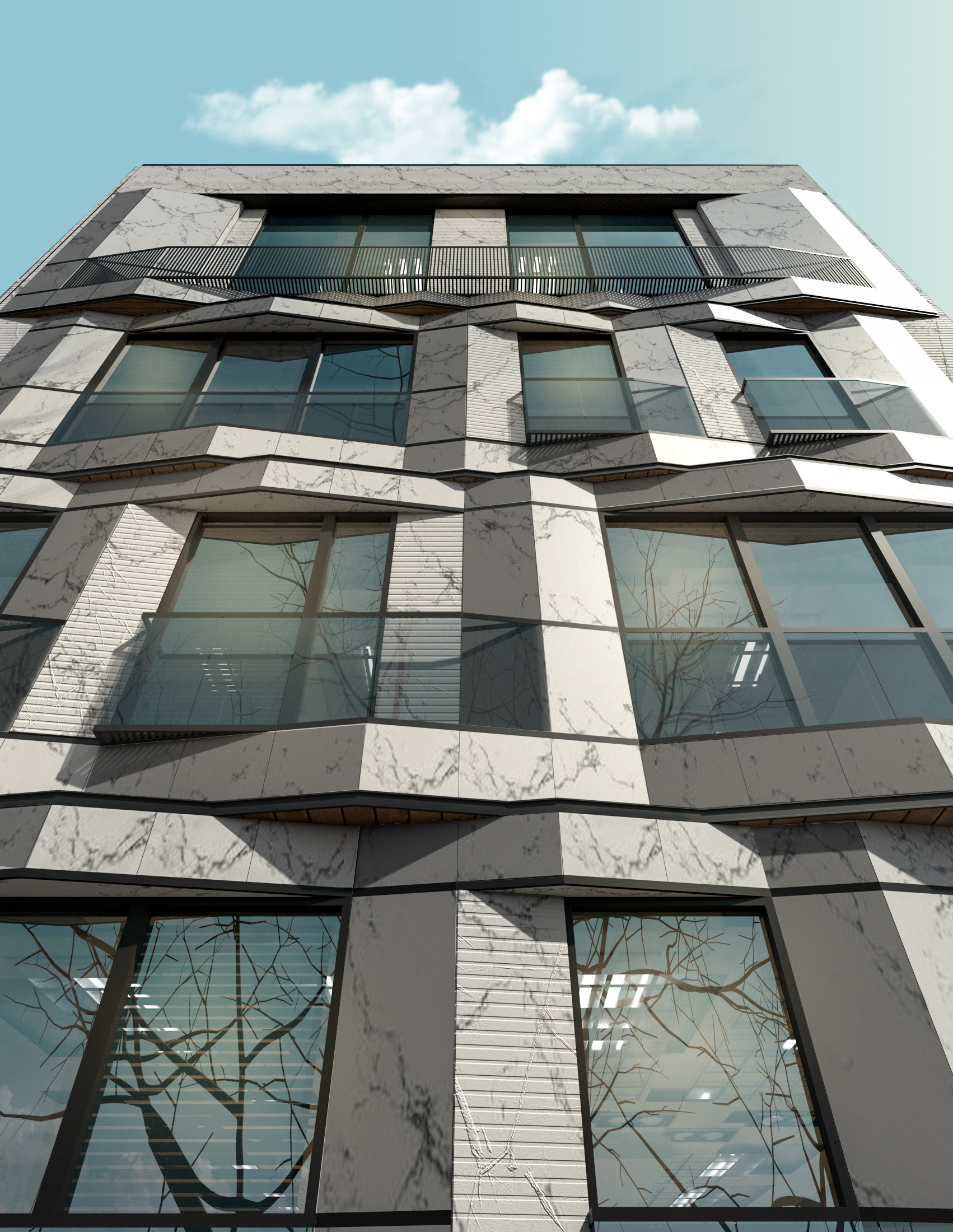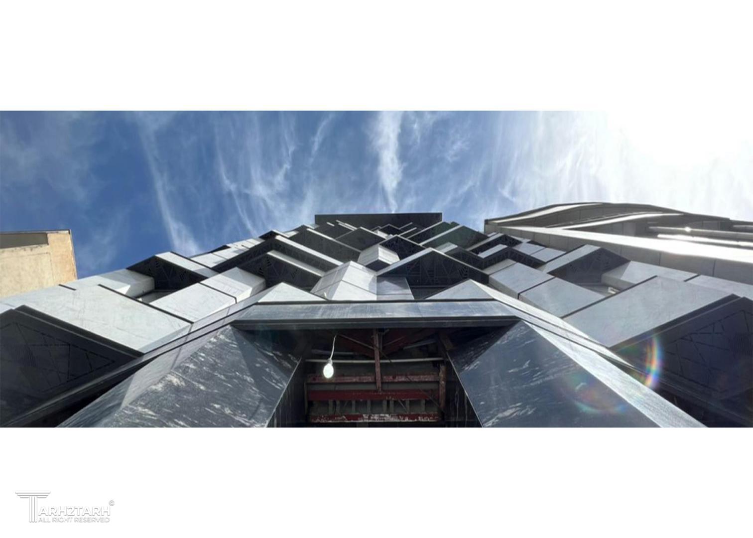 در طراحی نما، فرم مکعبی همچون ساختاری ماژولار عمل میکند. هر مکعب نمادی از واحد اداری مستقل است، در حالی که ترکیب کلی آنها وحدت کل بنا را حفظ میکند. با کنترل نسبت پر و خالی در نما، تعادل بین نور، دید، و مصالح سنگین و سبک برقرار شده است. در شب، با نورپردازی خطی در درزهای مکعبها، حجم ساختمان به صورت درخشان و شاخص در بافت شهری خودنمایی میکند.