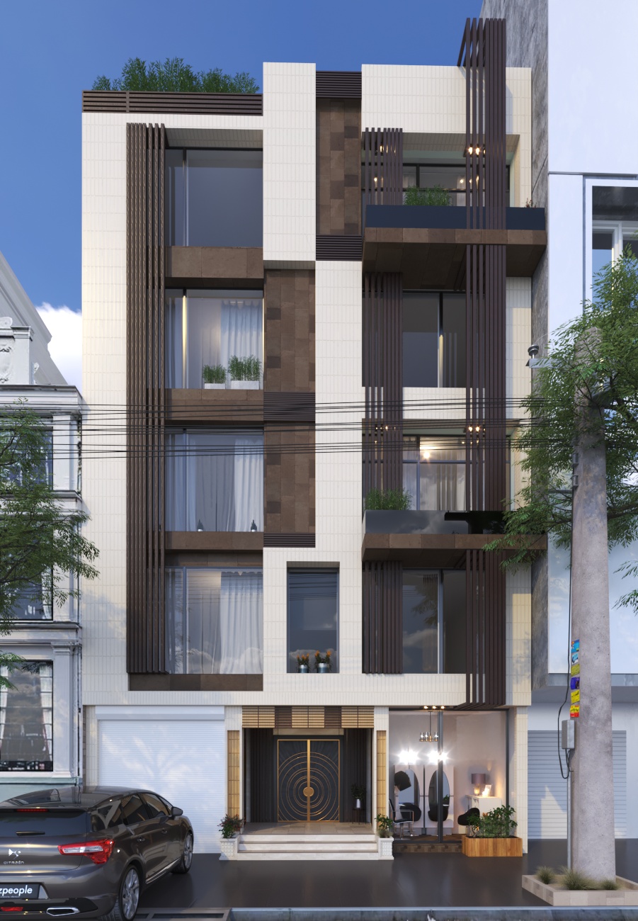 طراحی نمای مدرن ساختمان با متریال سنگ و چوب