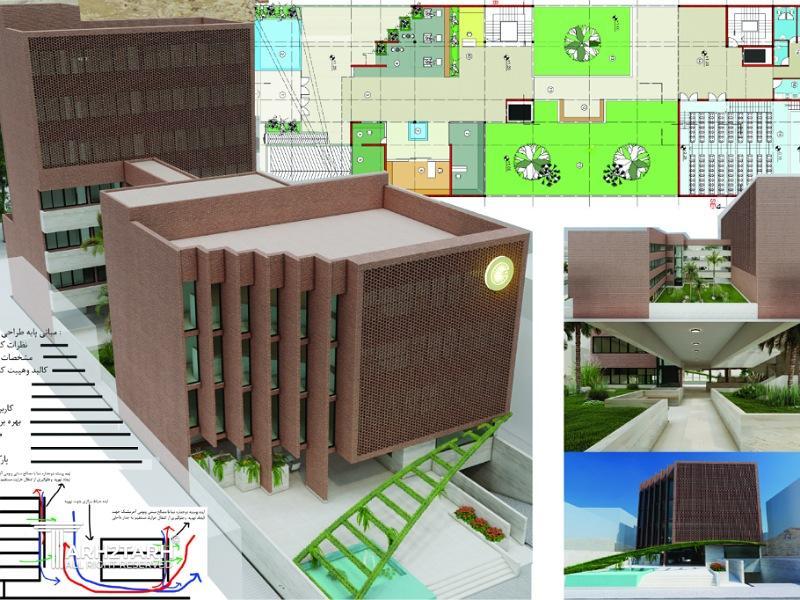 در طراحی پروژه چند مورد مورد مداقه بیشتر قرار گرفت: ۱_ موضوع اقلیم خوزستان ۲_ موضوع عملکرد نوع ساختمان ۳_موضوع زیباشناسی وفرم درخصوص اقلیم: ۱_ استفاده از مصالح بومی اجر که میتواند هم با اقلیم سازگاری داشته باشدو مبحث ۱۹مقررات ملی ساختمان رارعایت کند هم با بافت سنتی اهوازهماهنگ باشد وهم آنکه سهولت در تهیه مصالح بوم آورد موجب میشود که در مرحله اجرای عملیات ساختمانی سرعت بخشیده شود. ۲_دوپوسته کردن جدار ساختمان در اضلاع آفتابگیر از خصلت های دیگر این طرح است که با استفاده از مشبک کردن اجر به این امر استحکام بخشیده شد وبافت مشبک سنتی نیز درمعماری ایران نقشی تاریخی داشته است ۳_استفاده از حیاط مرکزی که باعث ایجاد امکان دستیابی به نور مستقیم به جای نورمصنوعی درزمان استفاده روز است چرا که ما به منظور روشن نمودن فضا در روز که کاربرد بیشتر این ساختمان در روز است موجب صرفه جویی در مصرف برق وانرژی می شویم . کلیه فضا های اصلی واتاقها دراین طرح از نور مستقیم برخوردار هستند. ۲_درخصوص عملکرد:پلان ها با مورد مشابه ساختمان کانون کارشناسان ونیازهای تشخیص داده شده در این مرحله طراحی فضایی شده است وبا توجه به اینکه ساختمان در طرح دو قسمت حجمی شده است که ساختمان جلو بیشتر مرتبط با عموم مردم و ارتباطشان با کانون کارشناسان است وساختمان پشتی پروژه بیشتر برای عملکرد خصوصی ودرون سازمانی کانون کارشناسان اختصاص داده شده است هردوبخش توسط پل در همکف وطبقات بهم مرتبط شده اند این پل هم نیاز عملکردی و ارتباطی را برآورده مینماید . ۳_زیبایی بصری:معماری علاوه برایجاد نقش عملکرد و پاسخگویی به نیازهای ساختمان مورد طراحی نقش دیگری دارد وان نقش زیباشناسی است که در این طرح سعی شده است از هر بعد به حجم وفرم نگریسته شود فضایی نو وجدید با فرم معماری مدرن و به روز را تداعی نماید در بدو ورود به صحنی وارد میشویم که یک آبنما در سمت راست برای اشاره به حضور آب در شهر اهواز(رودخانه کارون) است. سردر قوسی سبز که به عنوان فرمی تکمیل کننده نمای جلو طراحی شده است وپس از دیدن پل سفید درشهر اهوازاین به ذهن بنده خطور کرد که میتواند نمادی از پل سفید هم باشد هرچند درابتدا منظور این نبود و سبزی آن هم برای زیبایی و توجه به طبیعت ایجاد شده است وارد صحن لابی میشویم که از همان ابتدا انتهای لابی به فضای حیاط مرکزی دیدی وسیع وفرحبخش ایجاد میکند و باعث کشش وحرکت به سمت پلکان دسترسی عمودی طبقات وهم کششی برای عبور و رفتن به سمت سالن اجتماعات در همکف و سایر کاربری ها در طبقات ساختمان پشت ایجاد میکند دربالاترین بخش ساختمان پشت، دید ومنظر اتاق های ریاست و سوئیت مهمان به سمت رودخانه کارون ایجاد شده است البته با ملاحظه دو پوسته کردن ساختمان ۴_ازنکات مخفی طراحی ان است که زمین در طول ۶۰متر وعرض ۲۰متر به مدولهای پر وخالی شامل ساختمان وفضای باز باضریبی از ۵ تقسیم شده است که این امر بدلیل آن است که مدول ۵متر ضوابط پارکینگ رعایت شود وهم ساختمان نظمی درونی از برخوردار است
